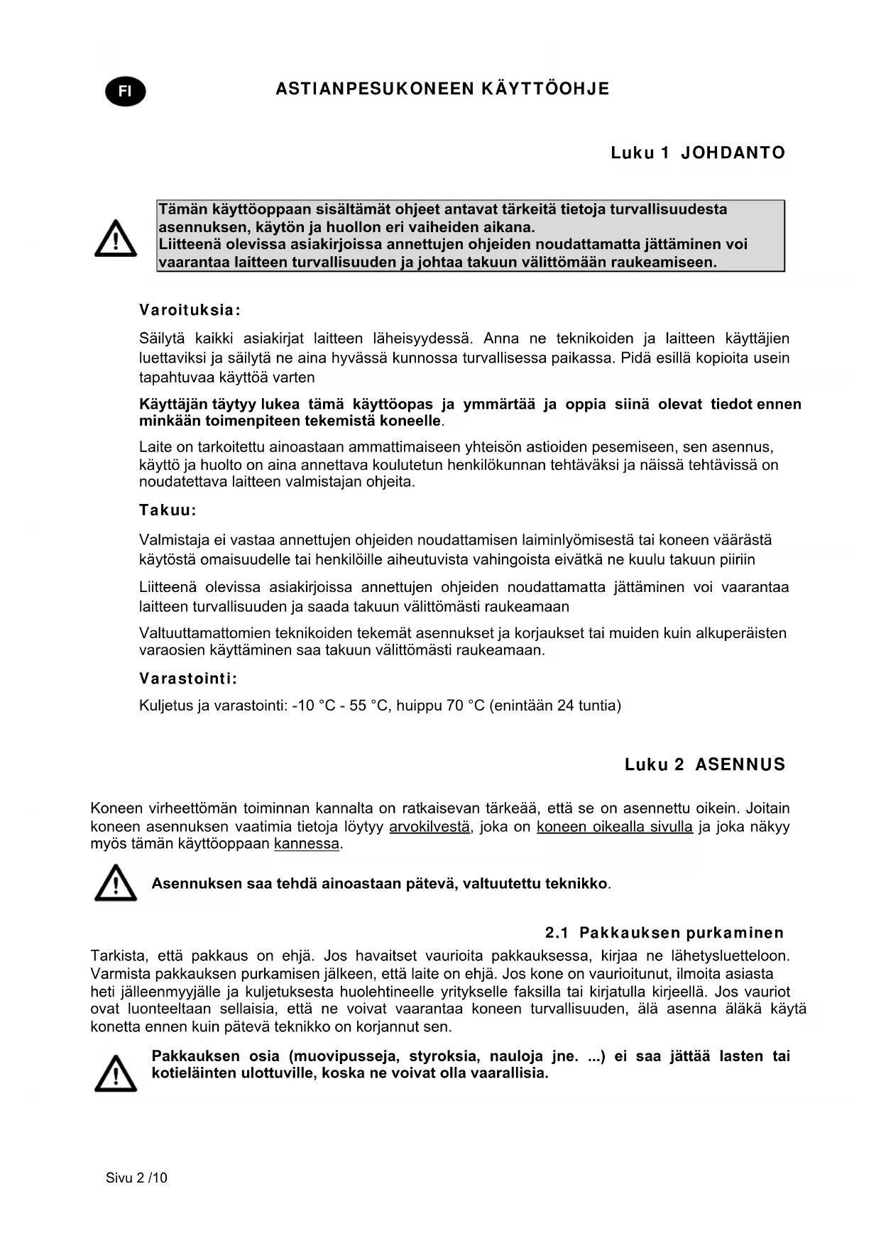 Tämän käyttöoppaan sisältämät ohjeet antavat tärkeitä tietoja turvallisuudesta asennuksen, käytön ja huollon eri vaiheiden aikana. Liitteenä olevissa asiakirjoissa annettujen ohjeiden noudattamatta jättäminen voi vaarantaa laitteen turvallisuuden ja johtaa takuun välittömään raukeamiseen. Varoituksia: Säilytä kaikki asiakirjat laitteen läheisyydessä. Anna ne teknikoiden ja laitteen käyttäjien luettaviksi ja säilytä ne aina hyvässä kunnossa turvallisessa paikassa. Pidä esillä kopioita usein tapahtuvaa käyttöä varten Käyttäjän täytyy lukea tämä käyttöopas ja ymmärtää ja oppia siinä olevat tiedot ennen minkään toimenpiteen tekemistä koneelle. Laite on tarkoitettu ainoastaan ammattimaiseen yhteisön astioiden pesemiseen, sen asennus, käyttö ja huolto on aina annettava koulutetun henkilökunnan tehtäväksi ja näissä tehtävissä on noudatettava laitteen valmistajan ohjeita. Takuu: Valmistaja ei vastaa annettujen ohjeiden noudattamisen laiminlyömisestä tai koneen väärästä käytöstä omaisuudelle tai henkilöille aiheutuvista vahingoista eivätkä ne kuulu takuun piiriin Liitteenä olevissa asiakirjoissa annettujen ohjeiden noudattamatta jättäminen voi vaarantaa laitteen turvallisuuden ja saada takuun välittömästi raukeamaan Valtuuttamattomien teknikoiden tekemät asennukset ja korjaukset tai muiden kuin alkuperäisten varaosien käyttäminen saa takuun välittömästi raukeamaan. Varastointi: Kuljetus ja varastointi: -10 °C - 55 °C, huippu 70 °C (enintään 24 tuntia) Luku 2 ASENNUS