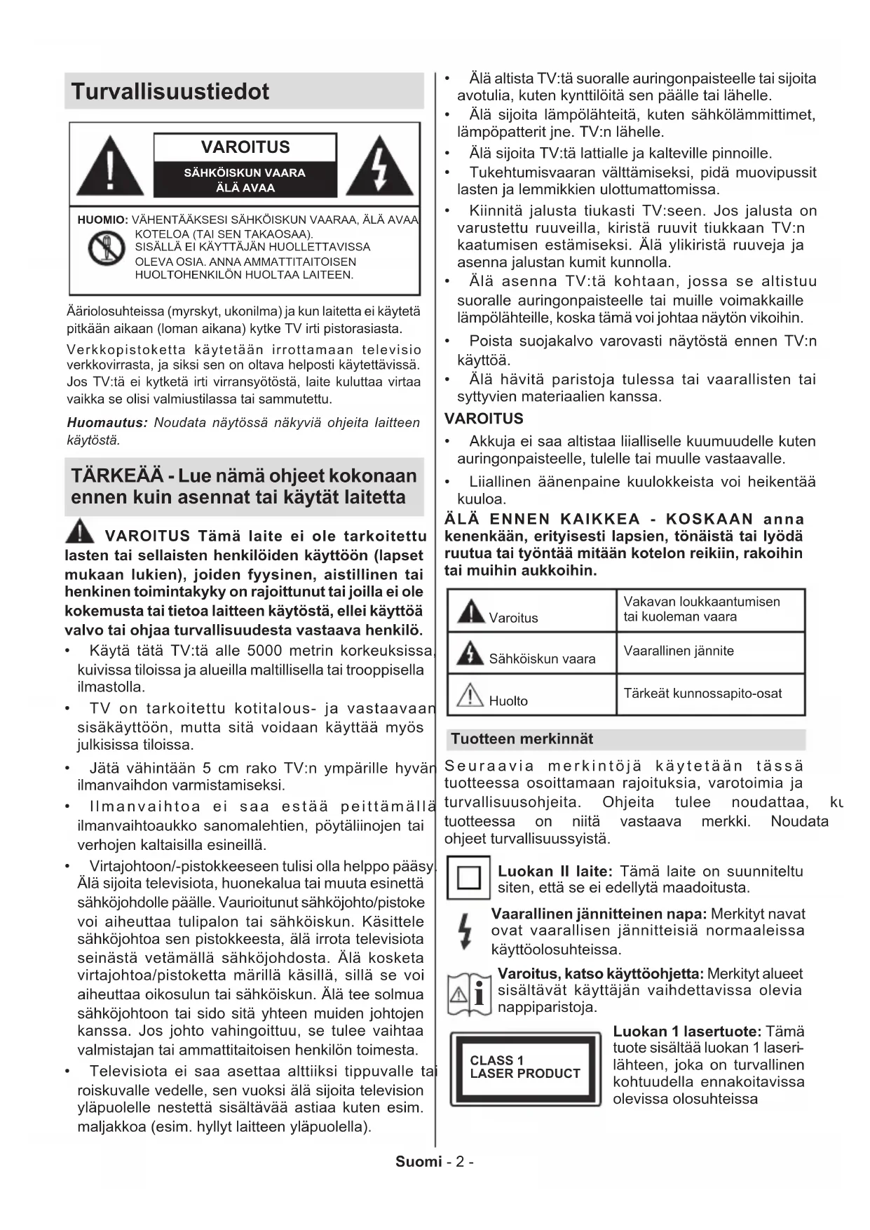- Lisää tietoa Suomi - 2 - Turvallisuustiedot VAROITUS SÄHKÖISKUN VAARAÄLÄ AVAAHUOMIO: VÄHENTÄÄKSESI SÄHKÖISKUN VAARAA, ÄLÄ AVAA KOTELOA (TAI SEN TAKAOSAA). SISÄLLÄ EI KÄYTTÄJÄN HUOLLETTAVISSA OLEVA OSIA. ANNA AMMATTITAITOISEN HUOLTOHENKILÖN HUOLTAA LAITEEN.Huomautus: Noudata näytössä näkyviä ohjeita laitteen käytöstä.Ääriolosuhteissa (myrskyt, ukonilma) ja kun laitetta ei käytetä pitkään aikaan (loman aikana) kytke TV irti pistorasiasta.Verkkopistoketta käytetään irrottamaan televisio verkkovirrasta, ja siksi sen on oltava helposti käytettävissä. Jos TV:tä ei kytketä irti virransyötöstä, laite kuluttaa virtaa vaikka se olisi valmiustilassa tai sammutettu. TÄRKEÄÄ - Lue nämä ohjeet kokonaan ennen kuin asennat tai käytät laitetta VAROITUS Tämä laite ei ole tarkoitettu lasten tai sellaisten henkilöiden käyttöön (lapset mukaan lukien), joiden fyysinen, aistillinen tai henkinen toimintakyky on rajoittunut tai joilla ei ole kokemusta tai tietoa laitteen käytöstä, ellei käyttöä valvo tai ohjaa turvallisuudesta vastaava henkilö. Käytä tätä TV:tä alle 5000 metrin korkeuksissa, kuivissa tiloissa ja alueilla maltillisella tai trooppisella ilmastolla. TV on tarkoitettu kotitalous- ja vastaavaan sisäkäyttöön, mutta sitä voidaan käyttää myös julkisissa tiloissa. Jätä vähintään 5 cm rako TV:n ympärille hyvän ilmanvaihdon varmistamiseksi. Ilmanvaihtoa ei saa estää peittämällä ilmanvaihtoaukko sanomalehtien, pöytäliinojen tai verhojen kaltaisilla esineillä. Virtajohtoon/-pistokkeeseen tulisi olla helppo pääsy. Älä sijoita televisiota, huonekalua tai muuta esinettä sähköjohdolle päälle. Vaurioitunut sähköjohto/pistoke voi aiheuttaa tulipalon tai sähköiskun. Käsittele sähköjohtoa sen pistokkeesta, älä irrota televisiota seinästä vetämällä sähköjohdosta. Älä kosketa virtajohtoa/pistoketta märillä käsillä, sillä se voi aiheuttaa oikosulun tai sähköiskun. Älä tee solmua sähköjohtoon tai sido sitä yhteen muiden johtojen kanssa. Jos johto vahingoittuu, se tulee vaihtaa valmistajan tai ammattitaitoisen henkilön toimesta. Televisiota ei saa asettaa alttiiksi tippuvalle tai roiskuvalle vedelle, sen vuoksi älä sijoita television yläpuolelle nestettä sisältävää astiaa kuten esim. maljakkoa (esim. hyllyt laitteen yläpuolella). Älä altista TV:tä suoralle auringonpaisteelle tai sijoita avotulia, kuten kynttilöitä sen päälle tai lähelle. Älä sijoita lämpölähteitä, kuten sähkölämmittimet, lämpöpatterit jne. TV:n lähelle. Älä sijoita TV:tä lattialle ja kalteville pinnoille. Tukehtumisvaaran välttämiseksi, pidä muovipussit lasten ja lemmikkien ulottumattomissa. Kiinnitä jalusta tiukasti TV:seen. Jos jalusta on varustettu ruuveilla, kiristä ruuvit tiukkaan TV:n kaatumisen estämiseksi. Älä ylikiristä ruuveja ja asenna jalustan kumit kunnolla. Älä asenna TV:tä kohtaan, jossa se altistuu suoralle auringonpaisteelle tai muille voimakkaille lämpölähteille, koska tämä voi johtaa näytön vikoihin. Poista suojakalvo varovasti näytöstä ennen TV:n käyttöä. Älä hävitä paristoja tulessa tai vaarallisten tai syttyvien materiaalien kanssa. VAROITUS Akkuja ei saa altistaa liialliselle kuumuudelle kuten auringonpaisteelle, tulelle tai muulle vastaavalle. Liiallinen äänenpaine kuulokkeista voi heikentää kuuloa. ÄLÄ ENNEN KAIKKEA - KOSKAAN anna kenenkään, erityisesti lapsien, tönäistä tai lyödä ruutua tai työntää mitään kotelon reikiin, rakoihin tai muihin aukkoihin. VaroitusVakavan loukkaantumisen tai kuoleman vaara Sähköiskun vaaraVaarallinen jännite HuoltoTärkeät kunnossapito-osat Tuotteen merkinnät Seuraavia merkintöjä käytetään tässä tuotteessa osoittamaan rajoituksia, varotoimia ja p. 13