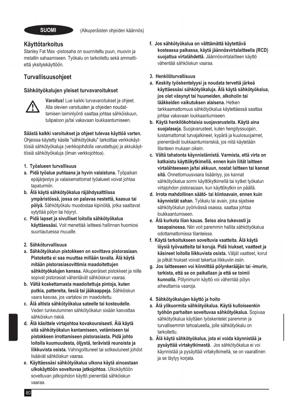 Mikäli Stanley Fat Max -tuotteessa ilmenee vika materi- aali- ja/tai valmistusvirheen vuoksi 12 kuukauden kuluessa ostopäivästä, Stanley Europe takaa vaihtavansa vialliset osat tai koko tuotteen Stanley Europen valinnan mukaan ilman kustannuksia ostajalle edellyttäen, että u tuotetta ei ole käytetty virheellisesti, vaan sitä on käytetty käyttöoppaan ohjeiden mukaisesti u tuote on altistunut vain normaalille kulumiselle u tuotetta ei ole korjannut valtuuttamaton henkilö u ostokuitti esitetään u Stanley Fat Max -tuote palautetaan kaikkien alkuperäisten osien kanssa. Jos haluat tehdä korvausvaatimuksen, ota yhteyttä ostopaikkaan tai katso lähimmän valtuutetun Stanley Fat Max -huoltoliikkeen yhteystiedot Stanley Fat Max -tuoteluettelosta tai ota yhteyttä paikalliseen Stanley-toimipisteeseen tässä ohjeessa kerrotussa osoitteessa. Valtuutettujen Stanley Fat Max -huoltoliikkeiden yhteystiedot sekä lisätietoja palveluista- mme on myös Internetissä osoitteessa www.stanley.eu/3.87 (Μετάφραση των πρωτότυπων οδηγιών) Ενδεδειγμένη χρήση Η σέγα Stanley Fat Max έχει σχεδιαστεί για το πριόνισμα ξύλου, πλαστικών και μετάλλου. Αυτό το εργαλείο προορίζεται για επαγγελματική και ιδιωτική, μη επαγγελματική χρήση. Οδηγίες ασφαλείας Γενικές προειδοποιήσεις ασφαλείας για τα ηλεκτρικά εργαλεία