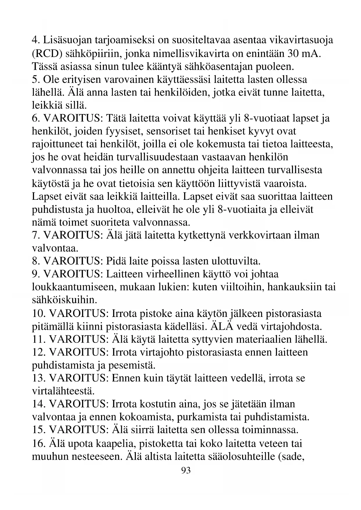 Käyttöturvallisuuden lisäämiseksi älä kytke useita sähkölaitteita samaan piiriin samanaikaisesti.93