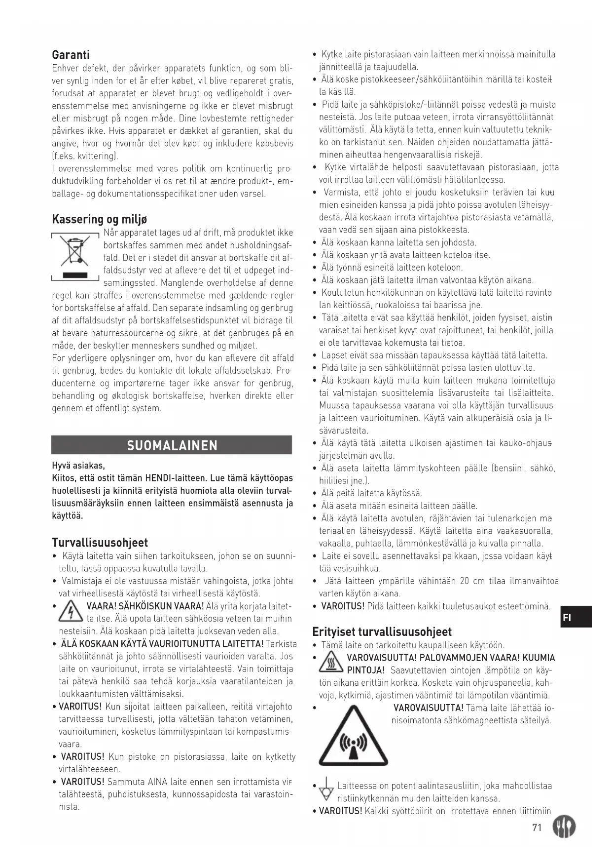 ducenterne og importørerne tager ikke ansvar for genbrug, behandling og økologisk bortskaffelse, hverken direkte eller gennem et offentligt system. SUOMALAINEN Hyvä asiakas, Kiitos, että ostit tämän HENDI-laitteen. Lue tämä käyttöopas huolellisesti ja kiinnitä erityistä huomiota alla oleviin turval