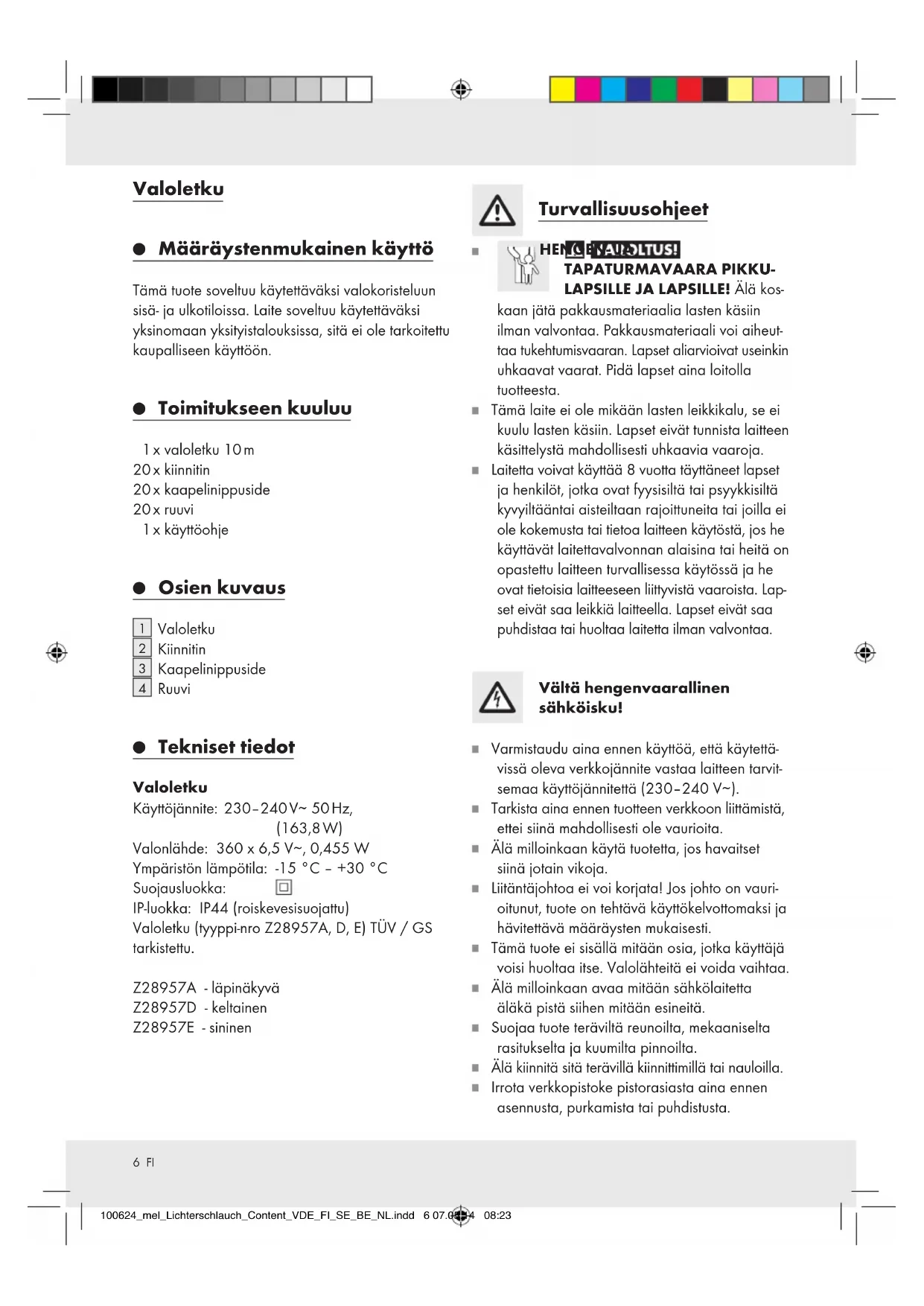 Tekniset tiedot Valoletku Käyttöjännite: 230–240 V∼ 50 Hz, (163,8 W) Valonlähde: 360 x 6,5 V∼, 0,455 W Ympäristön lämpötila: -15 °C – +30 °C Suojausluokka: IP-luokka: IP44 (roiskevesisuojattu) Valoletku (tyyppi-nro Z28957A, D, E) TÜV / GS tarkistettu. Z28957A - läpinäkyvä Z28957D - keltainen Z28957E - sininen Turvallisuusohjeet HENGEN- JA TAPATURMAVAARA PIKKU- LAPSILLE JA LAPSILLE! Älä kos- kaan jätä pakkausmateriaalia lasten käsiin ilman valvontaa. Pakkausmateriaali voi aiheut- taa tukehtumisvaaran. Lapset aliarvioivat useinkin uhkaavat vaarat. Pidä lapset aina loitolla tuotteesta. Tämä laite ei ole mikään lasten leikkikalu, se ei kuulu lasten käsiin. Lapset eivät tunnista laitteen käsittelystä mahdollisesti uhkaavia vaaroja. Laitetta voivat käyttää 8 vuotta täyttäneet lapset ja henkilöt, jotka ovat fyysisiltä tai psyykkisiltä kyvyiltääntai aisteiltaan rajoittuneita tai joilla ei ole kokemusta tai tietoa laitteen käytöstä, jos he käyttävät laitettavalvonnan alaisina tai heitä on opastettu laitteen turvallisessa käytössä ja he ovat tietoisia laitteeseen liittyvistä vaaroista. Lap- set eivät saa leikkiä laitteella. Lapset eivät saa puhdistaa tai huoltaa laitetta ilman valvontaa. Vältä hengenvaarallinen sähköisku! Varmistaudu aina ennen käyttöä, että käytettä- vissä oleva verkkojännite vastaa laitteen tarvit- semaa käyttöjännitettä (230–240 V∼). Tarkista aina ennen tuotteen verkkoon liittämistä, ettei siinä mahdollisesti ole vaurioita. Älä milloinkaan käytä tuotetta, jos havaitset siinä jotain vikoja. Liitäntäjohtoa ei voi korjata! Jos johto on vauri- oitunut, tuote on tehtävä käyttökelvottomaksi ja hävitettävä määräysten mukaisesti. Tämä tuote ei sisällä mitään osia, jotka käyttäjä voisi huoltaa itse. Valolähteitä ei voida vaihtaa. Älä milloinkaan avaa mitään sähkölaitetta äläkä pistä siihen mitään esineitä. Suojaa tuote teräviltä reunoilta, mekaaniselta rasitukselta ja kuumilta pinnoilta. Älä kiinnitä sitä terävillä kiinnittimillä tai nauloilla. Irrota verkkopistoke pistorasiasta aina ennen asennusta, purkamista tai puhdistusta. 100624_mel_Lichterschlauch_Content_VDE_FI_SE_BE_NL.indd 6 07.05.14 08:237 FI Älä milloinkaan kosketa verkkopistoketta tai valoletkua märin käsin. VARO! YLIKUUMENEMISVAARA! Valo- ketjun lamppujen virrankulutus on 0,455 W per lamppu. Tämä wattimäärä tuottaa valon lisäksi lämpöä. Älä käytä LED-valonauhaa