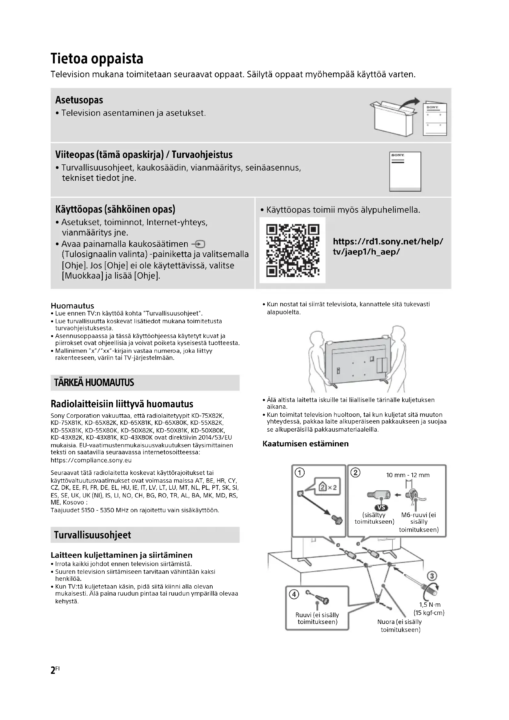 - Mallinimen ”x”/”xx”-kirjain vastaa numeroa, joka liittyy rakenteeseen, väriin tai TV-järjestelmään. Radiolaitteisiin liittyvä huomautus Sony Corporation vakuuttaa, että radiolaitetyypit KD-75X82K, KD-75X81K, KD-65X82K, KD-65X81K, KD-65X80K, KD-55X82K, KD-55X81K, KD-55X80K, KD-50X82K, KD-50X81K, KD-50X80K, KD-43X82K, KD-43X81K, KD-43X80K ovat direktiivin 2014/53/EU mukaisia. EU-vaatimustenmukaisuusvakuutuksen täysimittainen teksti on saatavilla seuraavassa internetosoitteessa: https://compliance.sony.euSeuraavat tätä radiolaitetta koskevat käyttörajoitukset tai käyttövaltuutusvaatimukset ovat voimassa maissa AT, BE, HR, CY, CZ, DK, EE, FI, FR, DE, EL, HU, IE, IT, LV, LT, LU, MT, NL, PL, PT, SK, SI, ES, SE, UK, UK (NI), IS, LI, NO, CH, BG, RO, TR, AL, BA, MK, MD, RS, ME, Kosovo :Taajuudet 5150 - 5350 MHz on rajoitettu vain sisäkäyttöön. Laitteen kuljettaminen ja siirtäminen