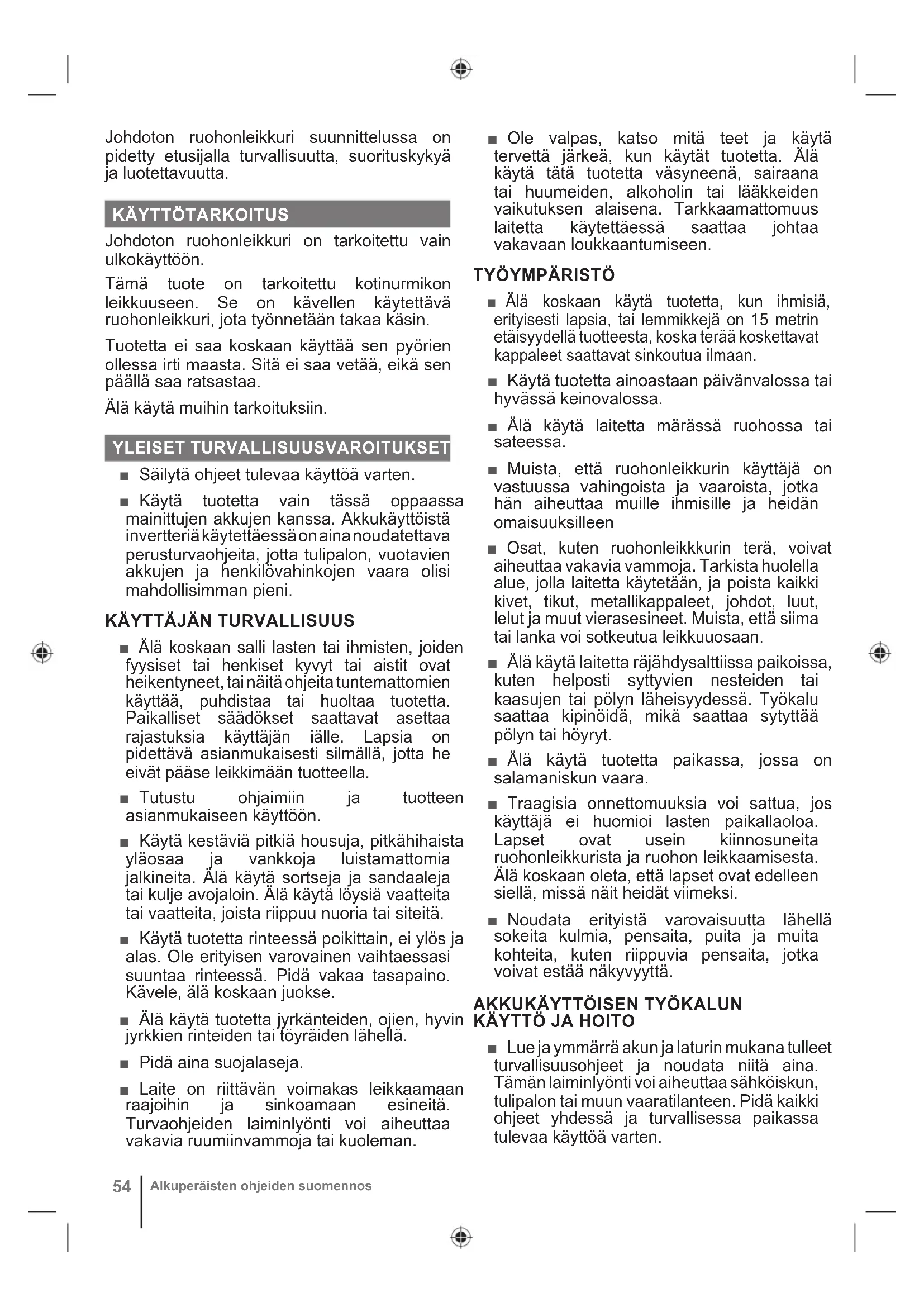 Johdoton ruohonleikkuri on tarkoitettu vain ulkokäyttöön. Tämä tuote on tarkoitettu kotinurmikon leikkuuseen. Se on kävellen käytettävä ruohonleikkuri, jota työnnetään takaa käsin. Tuotetta ei saa koskaan käyttää sen pyörien ollessa irti maasta. Sitä ei saa vetää, eikä sen päällä saa ratsastaa. Älä käytä muihin tarkoituksiin. YLEISET TURVALLISUUSVAROITUKSET ■ Säilytä ohjeet tulevaa käyttöä varten. ■ Käytä tuotetta vain tässä oppaassa mainittujen akkujen kanssa. Akkukäyttöistä invertteriä käytettäessä on aina noudatettava perusturvaohjeita, jotta tulipalon, vuotavien akkujen ja henkilövahinkojen vaara olisi mahdollisimman pieni.