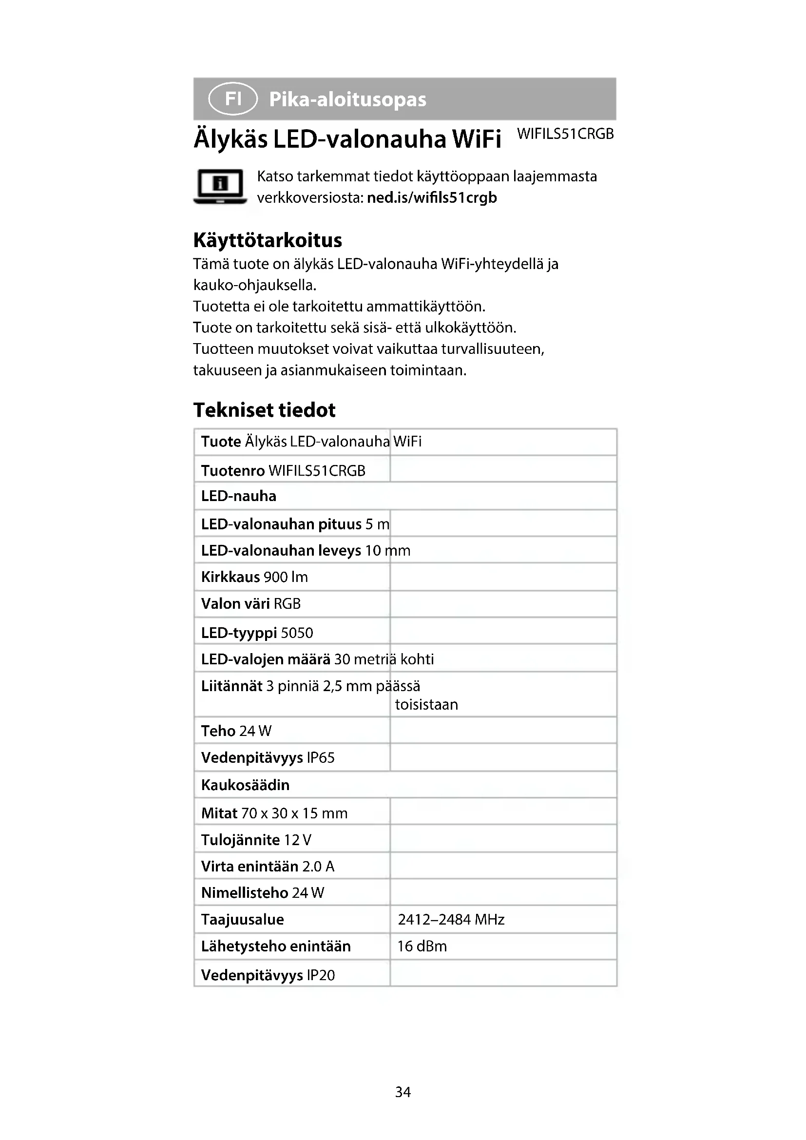 Pika-aloitusopas Älykäs LED-valonauha WiFi WIFILS51CRGB Katso tarkemmat tiedot käyttöoppaan laajemmasta verkkoversiosta: ned.is/wils51crgb Käyttötarkoitus Tämä tuote on älykäs LED-valonauha WiFi-yhteydellä ja kauko-ohjauksella. Tuotetta ei ole tarkoitettu ammattikäyttöön. Tuote on tarkoitettu sekä sisä- että ulkokäyttöön. Tuotteen muutokset voivat vaikuttaa turvallisuuteen, takuuseen ja asianmukaiseen toimintaan. Tekniset tiedot Tuote Älykäs LED-valonauha WiFi Tuotenro WIFILS51CRGB LED-nauha LED-valonauhan pituus 5 m LED-valonauhan leveys 10 mm Kirkkaus 900 lm Valon väri RGB LED-tyyppi 5050 LED-valojen määrä 30 metriä kohti Liitännät 3 pinniä 2,5 mm päässä toisistaan Teho 24 W Vedenpitävyys IP65 Kaukosäädin Mitat 70 x 30 x 15 mm Tulojännite 12 V Virta enintään 2.0 A Nimellisteho 24 W Taajuusalue 2412–2484 MHz Lähetysteho enintään 16 dBm Vedenpitävyys IP2035 Tärkeimmät osat (kuva A) 1 Sähköjohto 2 Kaukosäädin 3 Kirkkauspainikkeet 4 Virtapainike 5 Tilapainike 6 Kaukosäätimen pistoke 7 Infrapunavastaanotin 8 LED-nauha 9 Infrapunakaukosäädin q Musiikkitila w Nopeuspainikkeet e Väripainikkeet r Syttymisen/sammumisen liikekaavio Turvallisuusohjeet