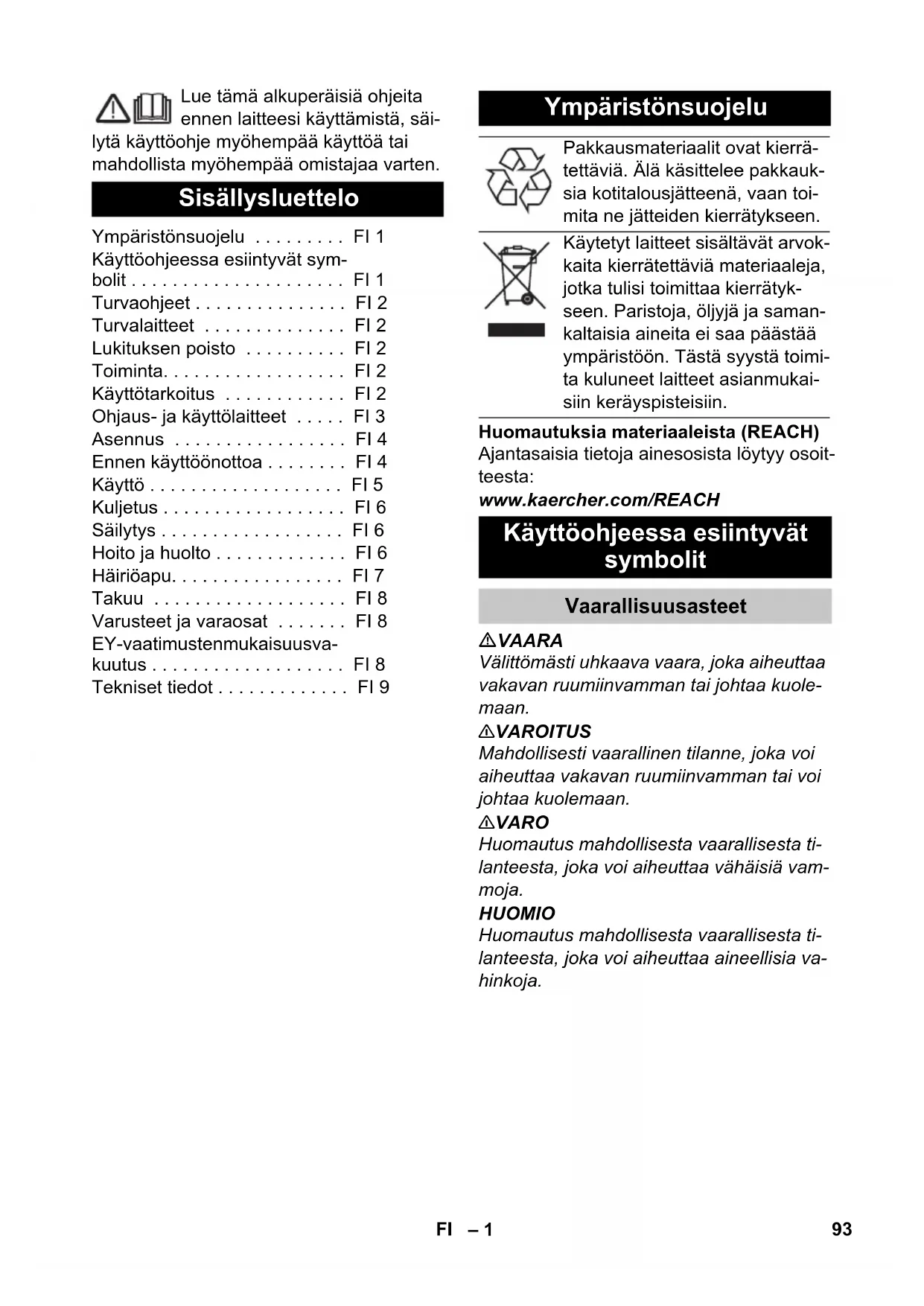 Bulleremission Ljudtrycksnivå (EN 60704-1) dB(A) 56 61,3 Maskinvibrationer Svängningstotalvärde (ISO 5349) m/s² 0,35 0,78 92 SV– 1 Lue tämä alkuperäisiä ohjeita ennen laitteesi käyttämistä, säi- lytä käyttöohje myöhempää käyttöä tai mahdollista myöhempää omistajaa varten. Huomautuksia materiaaleista (REACH) Ajantasaisia tietoja ainesosista löytyy osoit- teesta: www.kaercher.com/REACH VAARA Välittömästi uhkaava vaara, joka aiheuttaa vakavan ruumiinvamman tai johtaa kuole- maan. 몇 VAROITUS Mahdollisesti vaarallinen tilanne, joka voi aiheuttaa vakavan ruumiinvamman tai voi johtaa kuolemaan. 몇 VARO Huomautus mahdollisesta vaarallisesta ti- lanteesta, joka voi aiheuttaa vähäisiä vam- moja. HUOMIO Huomautus mahdollisesta vaarallisesta ti- lanteesta, joka voi aiheuttaa aineellisia va- hinkoja. Sisällysluettelo Ympäristönsuojelu . . . . . . . . . FI 1 Käyttöohjeessa esiintyvät sym- bolit . . . . . . . . . . . . . . . . . . . . . FI 1 Turvaohjeet . . . . . . . . . . . . . . . FI 2 Turvalaitteet . . . . . . . . . . . . . . FI 2 Lukituksen poisto . . . . . . . . . . FI 2 Toiminta. . . . . . . . . . . . . . . . . . FI 2 Käyttötarkoitus . . . . . . . . . . . . FI 2 Ohjaus- ja käyttölaitteet . . . . . FI 3 Asennus . . . . . . . . . . . . . . . . . FI 4 Ennen käyttöönottoa . . . . . . . . FI 4 Käyttö . . . . . . . . . . . . . . . . . . . FI 5 Kuljetus . . . . . . . . . . . . . . . . . . FI 6 Säilytys . . . . . . . . . . . . . . . . . . FI 6 Hoito ja huolto . . . . . . . . . . . . . FI 6 Häiriöapu. . . . . . . . . . . . . . . . . FI 7 Takuu . . . . . . . . . . . . . . . . . . . FI 8 Varusteet ja varaosat . . . . . . . FI 8 EY-vaatimustenmukaisuusva- kuutus . . . . . . . . . . . . . . . . . . . FI 8 Tekniset tiedot . . . . . . . . . . . . . FI 9 Ympäristönsuojelu Pakkausmateriaalit ovat kierrä- tettäviä. Älä käsittelee pakkauk- sia kotitalousjätteenä, vaan toi- mita ne jätteiden kierrätykseen. Käytetyt laitteet sisältävät arvok- kaita kierrätettäviä materiaaleja, jotka tulisi toimittaa kierrätyk- seen. Paristoja, öljyjä ja saman- kaltaisia aineita ei saa päästää ympäristöön. Tästä syystä toimi- ta kuluneet laitteet asianmukai- siin keräyspisteisiin. Käyttöohjeessa esiintyvät symbolit Vaarallisuusasteet 93FI– 2 Lue ja huomioi ennen laitteen ensimmäistä käyttöä tämä käyttöohje ja mukana oleva esite Turvaohjeet laikkakiilloituskonetta nro 5.956-659 varten. Turvalaitteet on tarkoitettu käyttäjän suo- jaamiseksi loukkaantumiselta, eikä niitä saa poistaa käytöstä, eikä niiden toimintoa saa ohittaa. Estää laitteen tahattoman käynnistämisen Laitetta käytetään tasaisten lattioiden kiillo- tukseen. Vaihdettava suodatinpussi kerää kiillotuk- sen aikana syntyvän pölyn. – 500 mm:n työleveys mahdollistaa te- hokkaan käytön. – Sähköverkkokäyttö mahdollistaa suu- ren suorituskyvyn ilman työskentely- ajan rajoitusta. Käytä laitetta ainoastaan tämän käyttöoh- jeen tietojen mukaisesti. – Laitteen käyttö on sallittu vain sileiden lattioiden kiillottamiseen. – Laitteen varustaminen on sallittu vain alkuperäisillä lisävarusteilla ja varaosil- la. – Laite ei sovellu käyttöön räjähdysalttiis- sa ympäristössä. – Tämä laite on tarkoitettu vain kuivakäyt- töön sisätiloissa eikä sitä saa käyttää tai säilyttää ulkona kosteissa olosuhteissa. Turvaohjeet Turvalaitteet Lukituksen poisto Toiminta Käyttötarkoitus 94 FI– 3 1 Oikeanpuolinen kytkin 2 Kaltevuudensäätövipu 3 Verkkojohto, jossa on pistoke 4 Pistorasia (vain laitevalmistajan hyväk- symille lisälaitteille) 5 Vasen kytkin 6 Vasen lukituksen poisto 7 Merkkivalo "Verkkojännite päällä" 8 Oikea lukituksen poisto 9 Kahva 10 Kaapelikoukku, kiertyvä 11 Ohjausjohdon pistokeliitäntä 12 Alipainehelma Ohjaus- ja käyttölaitteet