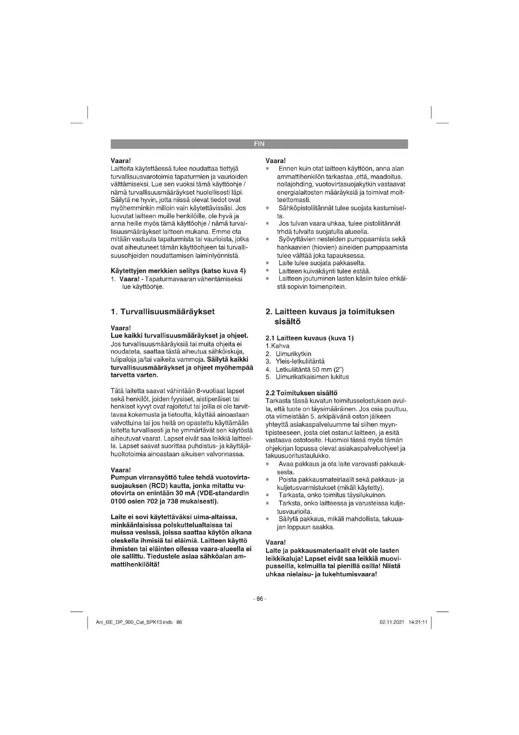 Vaara! Lue kaikki turvallisuusmääräykset ja ohjeet. Jos turvallisuusmääräyksiä tai muita ohjeita ei noudateta, saattaa tästä aiheutua sähköiskuja, tulipaloja ja/tai vaikeita vammoja. Säilytä kaikki turvallisuusmääräykset ja ohjeet myöhempää tarvetta varten. Tätä laitetta saavat vähintään 8-vuotiaat lapset sekä henkilöt, joiden fyysiset, aistiperäiset tai henkiset kyvyt ovat rajoitetut tai joilla ei ole tarvit- tavaa kokemusta ja tietoutta, käyttää ainoastaan valvottuina tai jos heitä on opastettu käyttämään laitetta turvallisesti ja he ymmärtävät sen käytöstä aiheutuvat vaarat. Lapset eivät saa leikkiä laitteel- la. Lapset saavat suorittaa puhdistus- ja käyttäjä- huoltotoimia ainoastaan aikuisen valvonnassa. Vaara! Pumpun virransyöttö tulee tehdä vuotovirta- suojauksen (RCD) kautta, jonka mitattu vu- otovirta on enintään 30 mA (VDE-standardin 0100 osien 702 ja 738 mukaisesti). Laite ei sovi käytettäväksi uima-altaissa, minkäänlaisissa polskuttelualtaissa tai muissa vesissä, joissa saattaa käytön aikana oleskella ihmisiä tai eläimiä. Laitteen käyttö ihmisten tai eläinten ollessa vaara-alueella ei ole sallittu. Tiedustele asiaa sähköalan am- mattihenkilöltä! Vaara!