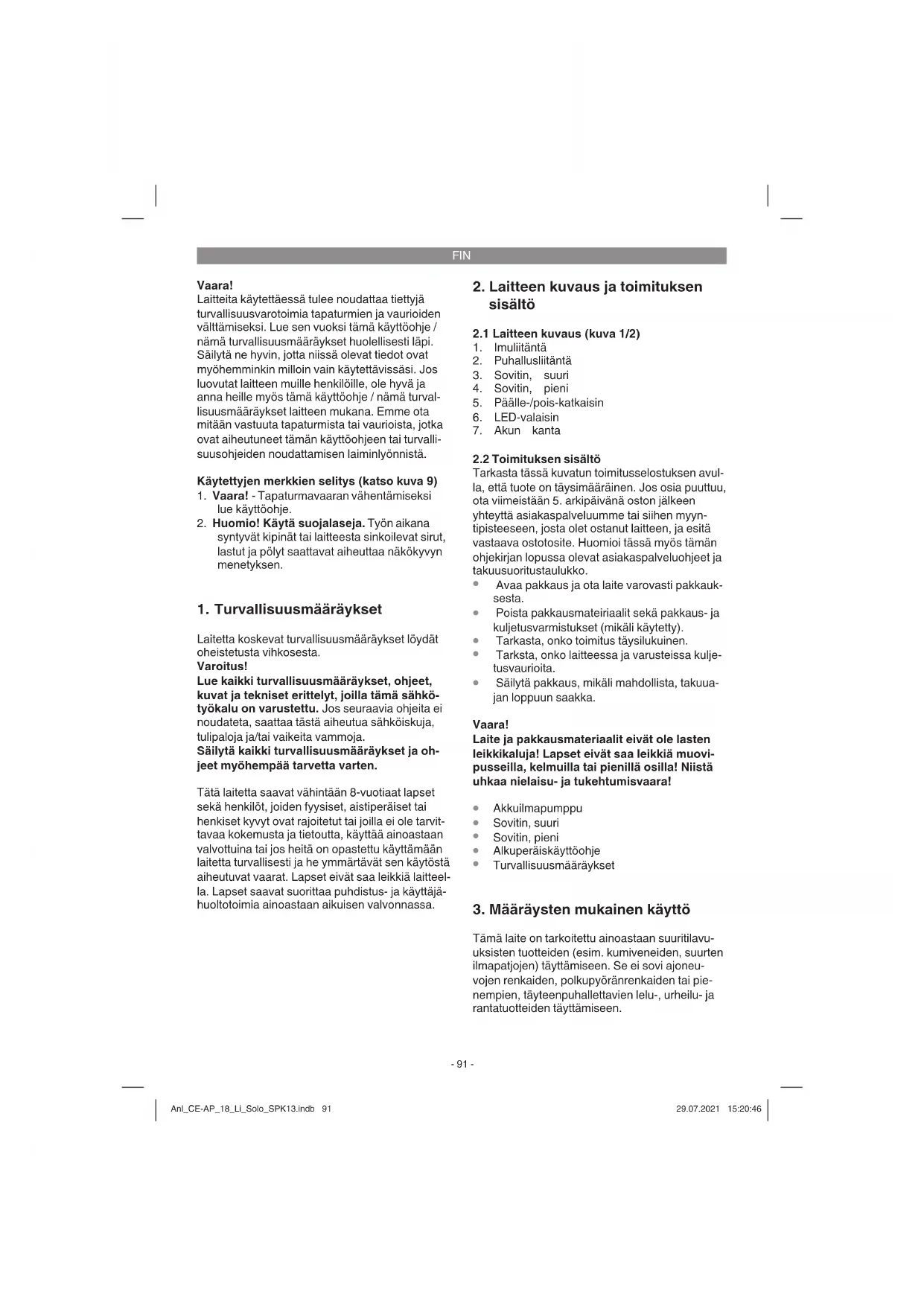 Tämä laite on tarkoitettu ainoastaan suuritilavu- uksisten tuotteiden (esim. kumiveneiden, suurten ilmapatjojen) täyttämiseen. Se ei sovi ajoneu- vojen renkaiden, polkupyöränrenkaiden tai pie- nempien, täyteenpuhallettavien lelu-, urheilu- ja rantatuotteiden täyttämiseen. Anl_CE-AP_18_Li_Solo_SPK13.indb 91Anl_CE-AP_18_Li_Solo_SPK13.indb 91 29.07.2021 15:20:4629.07.2021 15:20:46FIN