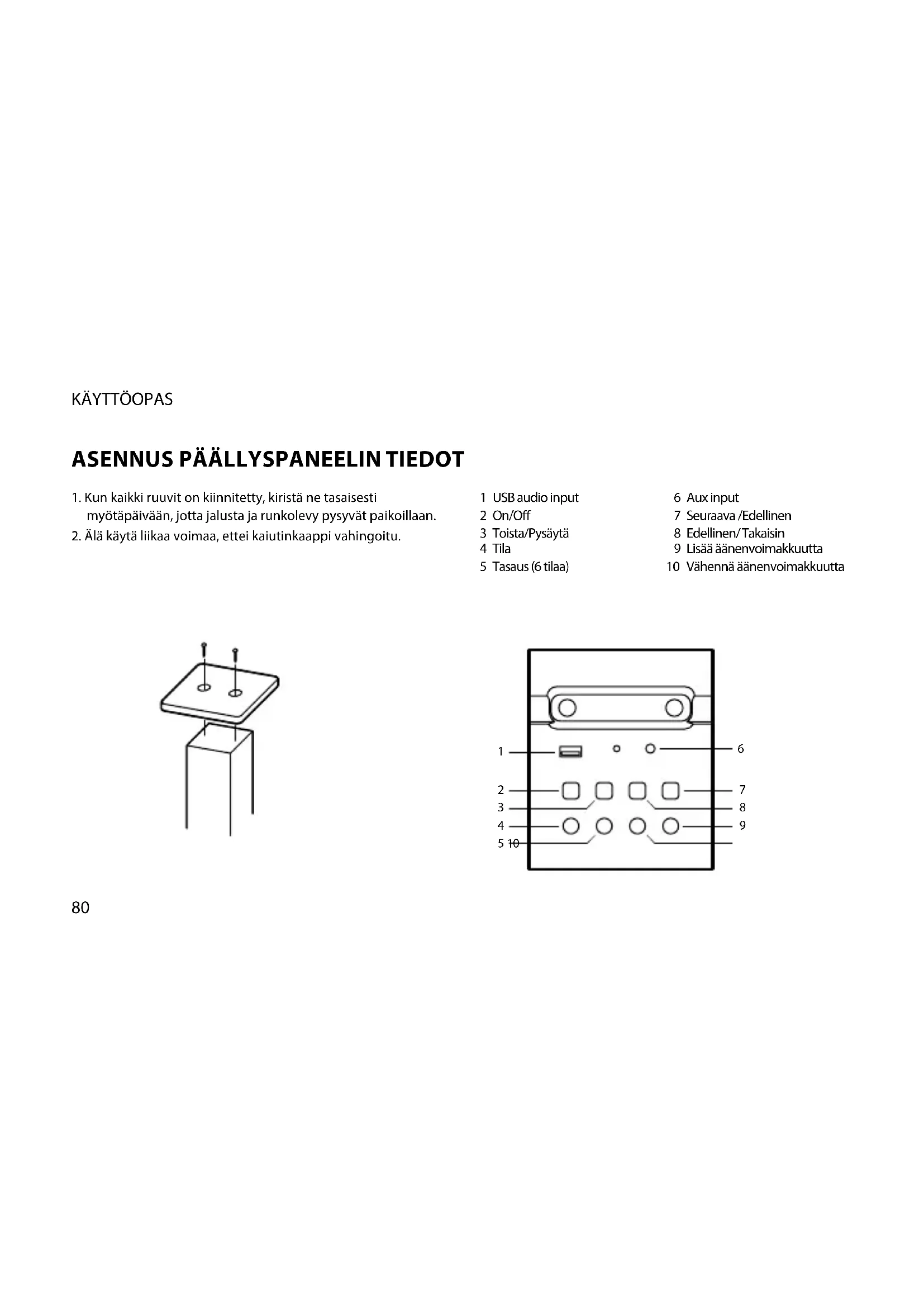 USB audio input On/O Toista/Pysäytä Tila Tasaus (6 tilaa) Aux input Seuraava /Edellinen Edellinen/ Takaisin Lisää äänenvoimakkuutta Vähennä äänenvoimakkuutta