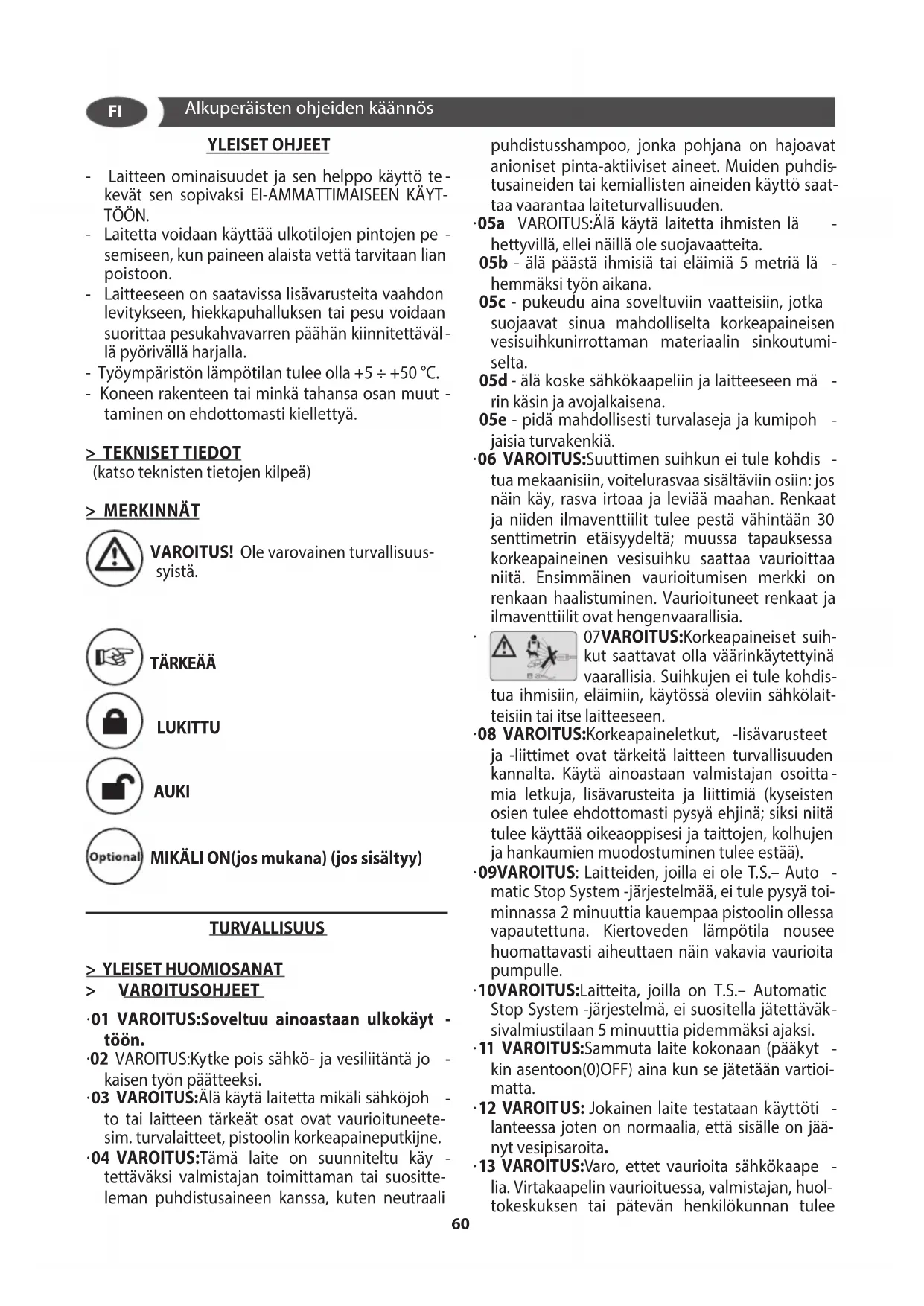 taminen on ehdottomasti kiellettyä. > TEKNISET TIEDOT (katso teknisten tietojen kilpeä) > MERKINNÄT VAROITUS! Ole varovainen turvallisuus- syistä. TÄRKEÄÄ LUKITTU AUKI MIKÄLI ON(jos mukana) (jos sisältyy) TURVALLISUUS > YLEISET HUOMIOSANAT > VAROITUSOHJEET