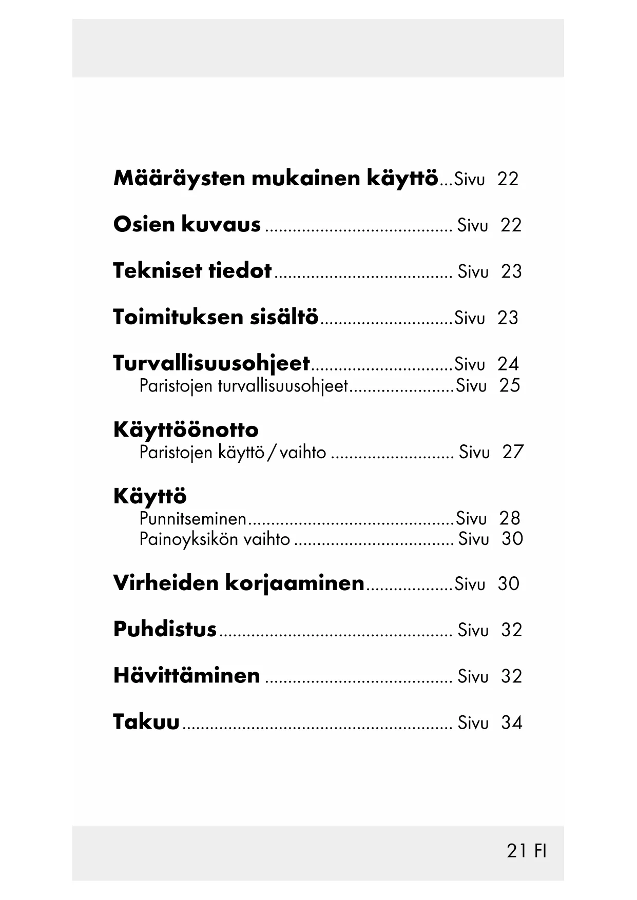 Eristysliuska Tekniset tiedot Punnitsemisalue: 0,2–50 kg / 0,5–110 lb Jako: 0,05 kg / 0,1 lb Paristo: 1 x 3 V CR2032 Toimituksen sisältö 1 digitaalinen matkalaukkuvaaka 1 3 V CR2032 1 käyttöohje24 FI Turvallisuusohjeet Laitetta voivat käyttää 8 vuotta täyttäneet lapset ja henkilöt, jotka ovat fyysisiltä tai psyykkisiltä kyvyiltääntai aisteiltaan rajoittuneita tai joilla ei ole kokemusta tai tietoa laitteen käytöstä, jos he käyttävät lai- tettavalvonnan alaisina tai heitä on opastettu laitteen turvallisessa käy- tössä ja he ovat tietoisia laitteeseen liittyvistä vaaroista. Lapset eivät saa leikkiä laitteella. Lapset eivät saa puhdistaa tai huoltaa laitetta ilman valvontaa. Tarkasta tuote vaurioiden varalta ennen käyttöönottoa. Älä käytä tuo- tetta, mikäli se on vahingoittunut.25 FI Paristojen turvallisuusohjeet Pidä lapset loitolla paristoista. Säilytä paristot huolella. On olemassa vaara, että lapset tai lemmikkieläimet voivat niellä paristoja. Jos näin käy, käänny heti lääkärin puoleen. Älä koskaan lataa ei ladat- tavia paristoja uudelleen, äläkä oikosulje ja / tai avaa paristoja. Älä koskaan heitä paristoja tuleen tai veteen. Muutoin voi syntyä räjähdysvaara. Kun asetat paristot paikoil- leen, noudata laitteen napaisuustietoja! Napai- suus on merkitty paristolokeroihin. Muutoin voi syntyä räjähdysvaara.26 FI Älä altista paristoja äärimmäisille ympäristöolosuhteille ja lämpötiloille, esim. älä jätä niitä lämpöpatterien lähelle. Lämpö saattaa aiheuttaa vuotoja paristoissa. Tyhjentyneet paristot on poistettava laitteesta välittömästi. Ne saattavat alkaa vuotamaan! Tarkasta säännöllisesti, että laitteessa olevat paris- tot eivät vuoda. Vuotavat tai vaurioituneet paristot voivat syö- vyttää ihoa; käytä tässä tapauksessa ehdottomasti aina sopivia suojakäsi- neitä! Vältä iho-, silmä- ja limakalvokoske- tusta. Jos pariston happoa joutuu iholle, huuhtele kyseinen kohta run- saalla määrällä vettä ja / tai mene lääkäriin!27 FI Puhdista tarvittaessa paristojen ja lait- teen kosketinpinnat, ennen kuin asetat paristot paikoilleen. Poista paristot, jos laitetta ei käytetä pitkään aikaan. Hävitä paristot asianmukaisesti ohjei- den mukaan. Käyttöönotto Huomautus: poista eristysnauha