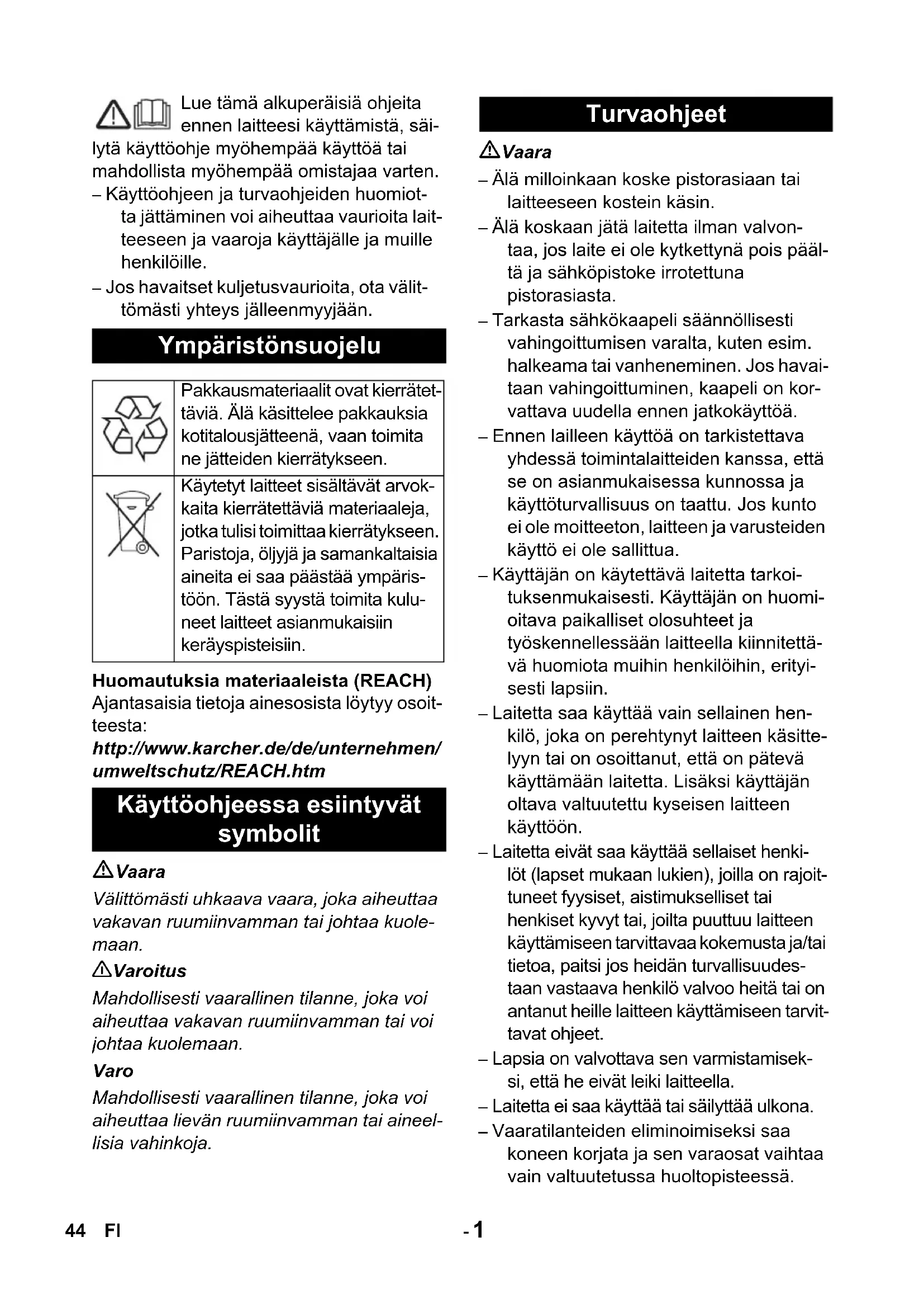 CEO Head of Approbation 43SV- 1 Lue tämä alkuperäisiä ohjeita ennen laitteesi käyttämistä, säi- lytä käyttöohje myöhempää käyttöä tai mahdollista myöhempää omistajaa varten. – Käyttöohjeen ja turvaohjeiden huomiot- ta jättäminen voi aiheuttaa vaurioita lait- teeseen ja vaaroja käyttäjälle ja muille henkilöille. – Jos havaitset kuljetusvaurioita, ota välit- tömästi yhteys jälleenmyyjään. Huomautuksia materiaaleista (REACH) Ajantasaisia tietoja ainesosista löytyy osoit- teesta: http://www.karcher.de/de/unternehmen/ umweltschutz/REACH.htm Vaara Välittömästi uhkaava vaara, joka aiheuttaa vakavan ruumiinvamman tai johtaa kuole- maan. 몇 Varoitus Mahdollisesti vaarallinen tilanne, joka voi aiheuttaa vakavan ruumiinvamman tai voi johtaa kuolemaan. Varo Mahdollisesti vaarallinen tilanne, joka voi aiheuttaa lievän ruumiinvamman tai aineel- lisia vahinkoja. Vaara – Älä milloinkaan koske pistorasiaan tai laitteeseen kostein käsin. – Älä koskaan jätä laitetta ilman valvon- taa, jos laite ei ole kytkettynä pois pääl- tä ja sähköpistoke irrotettuna pistorasiasta. – Tarkasta sähkökaapeli säännöllisesti vahingoittumisen varalta, kuten esim. halkeama tai vanheneminen. Jos havai- taan vahingoittuminen, kaapeli on kor- vattava uudella ennen jatkokäyttöä. – Ennen lailleen käyttöä on tarkistettava yhdessä toimintalaitteiden kanssa, että se on asianmukaisessa kunnossa ja käyttöturvallisuus on taattu. Jos kunto ei ole moitteeton, laitteen ja varusteiden käyttö ei ole sallittua. – Käyttäjän on käytettävä laitetta tarkoi- tuksenmukaisesti. Käyttäjän on huomi- oitava paikalliset olosuhteet ja työskennellessään laitteella kiinnitettä- vä huomiota muihin henkilöihin, erityi- sesti lapsiin. – Laitetta saa käyttää vain sellainen hen- kilö, joka on perehtynyt laitteen käsitte- lyyn tai on osoittanut, että on pätevä käyttämään laitetta. Lisäksi käyttäjän oltava valtuutettu kyseisen laitteen käyttöön. – Laitetta eivät saa käyttää sellaiset henki- löt (lapset mukaan lukien), joilla on rajoit- tuneet fyysiset, aistimukselliset tai henkiset kyvyt tai, joilta puuttuu laitteen käyttämiseen tarvittavaa kokemusta ja/tai tietoa, paitsi jos heidän turvallisuudes- taan vastaava henkilö valvoo heitä tai on antanut heille laitteen käyttämiseen tarvit- tavat ohjeet. – Lapsia on valvottava sen varmistamisek- si, että he eivät leiki laitteella. – Laitetta ei saa käyttää tai säilyttää ulkona. – Vaaratilanteiden eliminoimiseksi saa koneen korjata ja sen varaosat vaihtaa vain valtuutetussa huoltopisteessä. Ympäristönsuojelu Pakkausmateriaalit ovat kierrätet- täviä. Älä käsittelee pakkauksia kotitalousjätteenä, vaan toimita ne jätteiden kierrätykseen. Käytetyt laitteet sisältävät arvok- kaita kierrätettäviä materiaaleja, jotka tulisi toimittaa kierrätykseen. Paristoja, öljyjä ja samankaltaisia aineita ei saa päästää ympäris- töön. Tästä syystä toimita kulu- neet laitteet asianmukaisiin keräyspisteisiin. Käyttöohjeessa esiintyvät symbolit Turvaohjeet 44 FI- 2– Tämä puhallin on tarkoitettu märkäpuh-distettujen mattojen/kokolattiamattojen kuivaamiseen.– Tämä laite on tarkoitettu ainoastaan ammattimaiseen käyttöön.Kaikki tästä poikkeava käyttö katsotaan tar-koituksenvastaiseksi. Valmistaja ei vastaa poikkeavasta käytöstä johtuvista vahin-goista, riski on yksin käyttäjän.1 Kuljetuskahva2 Kuljetuskahvan kiinnitys3 Verkkokaapeli4 Kuljetuspyörät5 Lukitusosa ristikahvoilla6Tuuletin7 Käsikahva8 LaitekytkinÎ Asenna kuljetuskahva paikalleen.Huomautus: Laitteen sijoittamisessa on huomioitava, että puhallinristikot pysyvät vapaina.Î Avaa ikkunat ja ovet, mikäli mahdollista, ilmanvaihdon parantamiseksi.Î Aseta laite kuivatettavan maton päälle.Î Kohota mattoa.Î Työnnä matto laitteen lukitusosan alle ja kiinnitä ristikahvoja kiertämällä.Î Työnnä virtapistoke pistorasiaan.Î Kytke laite päälle.Î Kytke laite pois päältä. Î Vedä verkkopistoke irti. Käyttötarkoitus Laitteen osat