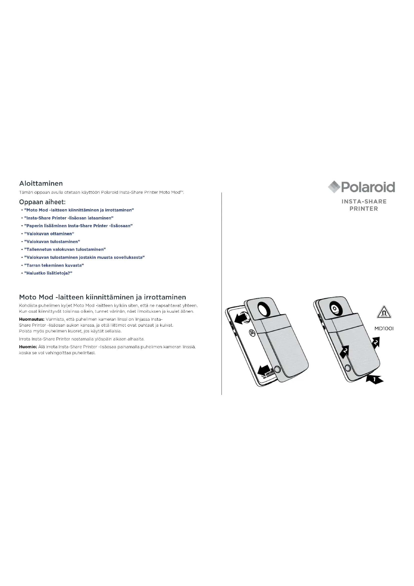 - ”Moto Mod -laitteen kiinnittäminen ja irrottaminen”• ”Insta-Share Printer -lisäosan lataaminen”• ”Paperin lisääminen Insta-Share Printer -lisäosaan”• ”Valokuvan ottaminen”• ”Valokuvan tulostaminen”• ”Tallennetun valokuvan tulostaminen”• ”Valokuvan tulostaminen jostakin muusta sovelluksesta”• ”Tarran tekeminen kuvasta”• ”Haluatko lisätietoja?” Moto Mod -laitteen kiinnittäminen ja irrottaminen Kohdista puhelimen kyljet Moto Mod -laitteen kylkiin siten, että ne napsahtavat yhteen. Kun osat kiinnittyvät toisiinsa oikein, tunnet värinän, näet ilmoituksen ja kuulet äänen.Huomautus: Varmista, että puhelimen kameran linssi on linjassa Insta-Share Printer-lisäosan aukon kanssa, ja että liittimet ovat puhtaat ja kuivat. Poistamyöspuhelimen kuoret, jos käytät sellaisia.Irrota Insta-Share Printer nostamalla ylöspäin alkaen alhaalta. Huomio: Älä irrota Insta-Share Printer -lisäosaa painamalla puhelimen kameran linssiä, koska se voi vahingoittaa puhelintasi. INSTA-SHARE PRINTER