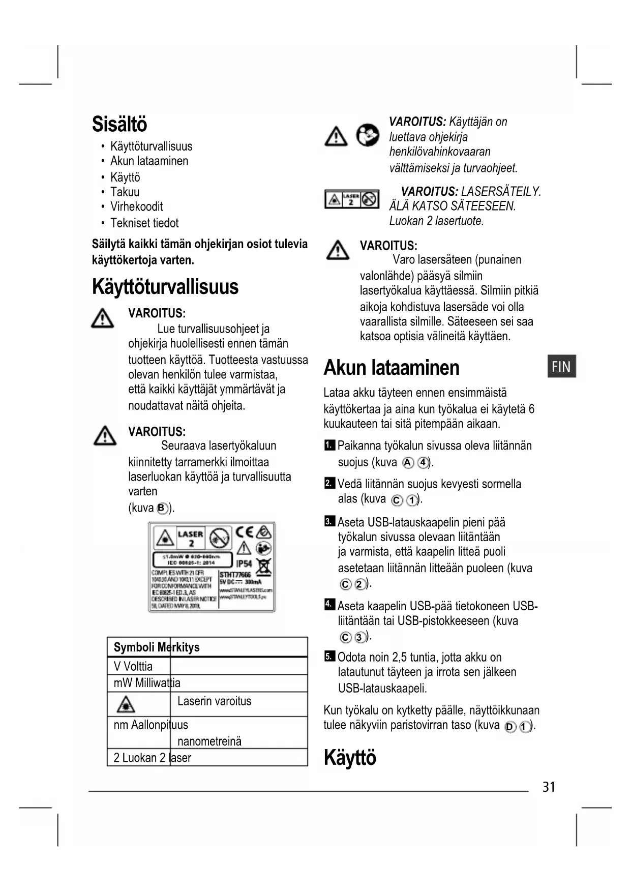 Symboli Merkitys V Volttia mW Milliwattia Laserin varoitus nm Aallonpituus nanometreinä 2 Luokan 2 laser VAROITUS: Käyttäjän on luettava ohjekirja henkilövahinkovaaran välttämiseksi ja turvaohjeet. VAROITUS: LASERSÄTEILY. ÄLÄ KATSO SÄTEESEEN. Luokan 2 lasertuote. VAROITUS: Varo lasersäteen (punainen valonlähde) pääsyä silmiin lasertyökalua käyttäessä. Silmiin pitkiä aikoja kohdistuva lasersäde voi olla vaarallista silmille. Säteeseen sei saa katsoa optisia välineitä käyttäen. Akun lataaminen Lataa akku täyteen ennen ensimmäistä käyttökertaa ja aina kun työkalua ei käytetä 6 kuukauteen tai sitä pitempään aikaan.