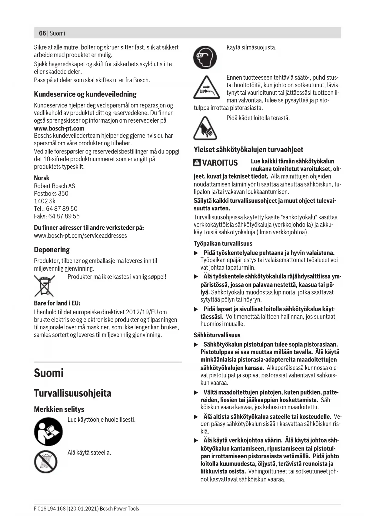 Betjening u Ta hensyn til nettspenningen! Spenningen til strømkilden må stemme overens med angivelsene på redskapets typeskilt. Inn-/utkobling (se bilder C og D) For innkobling trykker du først på sperren (3) og holder denne trykt inne. Trykk deretter på av/på-bryteren (2) og hold den trykt inne. For utkobling slipper du sperren (3) og deretter på-/av- bryteren (2). Sagefunksjon Selv om tannåpningen muliggjør grenskjæring opptil Ø20mm, er spissen på knivbjelken beregnet til snitt på opptil Ø20mm. Arbeide med hekksaksen (se bildeE) Beveg hekksaksen jevnt fremover på klippelinjen. Den dobbelte knivbjelken muliggjør skjæring i begge retningen eller med pendelbevegelser fra den ene siden til den andre. Klipp først sidene på hekken, så overkanten. For å få sidene rette, anbefaler vi å klippe i vokseretningen nedenfra og oppover. Hvis det klippes ovenfra og nedover, beveger de tynnere grenene seg utover, slik at det kan oppstå tynne steder eller hull. For til slutt å klippe overkanten rett, lønner det seg å spenne en snor i nødvendig høyde over hele hekkens lengde. Pass på at du ikke klipper gjenstander som f.eks. ståltråder. Kniver eller drivverk kan bli skadet. Feilsøking Symptom Mulig årsak Løsning Hekksaksen går ikke Nettspenningen finnes ikke Sjekk og slå på Stikkontakt er defekt Bruk en annen stikkkontakt Nettkabel skadet Kontroller nettkabel og oppsøk kundeservice hvis den er skadet Skjøteledning er skadet Sjekk skjøteledningen og skift den ut hvis den er skadet Sikringen er utløst Utskifting av sikringen Hekksaksen går rykkvis Intern kabling i hageredskapet er defekt Ta kontakt med kundeservice På-/av-bryter defekt Ta kontakt med kundeservice Motoren går, knivene står stille Intern feil Ta kontakt med kundeservice Knivene blir varme Kniven er butt Få knivbjelken slipt Hakk i kniven Få knivbjelken kontrollert For sterk friksjon på grunn av manglende smøring Sprøyt med smøreolje Sterke vibrasjoner/ lyder Defekt hageredskap Ta kontakt med kundeservice Service og vedlikehold Vedlikehold, rengjøring og lagring u Før alle arbeider på produktet utføres må støpselet trekkes ut av stikkontakten. u Hold produktet rent slik at du kan arbeide godt og sikkert. Sett ikke andre gjenstander på hageredskapet. Hold selve produktet og ventilasjonsspaltene alltid rene, for å kunne arbeide bra og sikkert. Sprøyt aldri vann på produktet. Dypp produktet aldri ned i vann. Produktet må oppbevares på et sikkert sted, tørt og utilgjengelig for barn. Sett ikke andre gjenstander på produktet. Bosch Power Tools F 016 L94 168 | (20.01.2021)66 | Suomi Sikre at alle mutre, bolter og skruer sitter fast, slik at sikkert arbeide med produktet er mulig. Sjekk hageredskapet og skift for sikkerhets skyld ut slitte eller skadede deler. Pass på at deler som skal skiftes ut er fra Bosch. Kundeservice og kundeveiledning Kundeservice hjelper deg ved spørsmål om reparasjon og vedlikehold av produktet ditt og reservedelene. Du finner også sprengskisser og informasjon om reservedeler på www.bosch-pt.com Boschs kundeveilederteam hjelper deg gjerne hvis du har spørsmål om våre produkter og tilbehør. Ved alle forespørsler og reservedelsbestillinger må du oppgi det 10‑sifrede produktnummeret som er angitt på produktets typeskilt. Norsk Robert Bosch AS Postboks 350 1402 Ski Tel.: 64 87 89 50 Faks: 64 87 89 55 Du finner adresser til andre verksteder på: www.bosch-pt.com/serviceaddresses Deponering Produkter, tilbehør og emballasje må leveres inn til miljøvennlig gjenvinning. Produkter må ikke kastes i vanlig søppel! Bare for land i EU: I henhold til det europeiske direktivet 2012/19/EU om brukte elektriske og elektroniske produkter og tilpasningen til nasjonale lover må maskiner, som ikke lenger kan brukes, samles sortert og leveres til miljøvennlig gjenvinning. Suomi Turvallisuusohjeita Merkkien selitys Lue käyttöohje huolellisesti. Älä käytä sateella. Käytä silmäsuojusta. Ennen tuotteeseen tehtäviä säätö-, puhdistus- tai huoltotöitä, kun johto on sotkeutunut, lävis- tynyt tai vaurioitunut tai jättäessäsi tuotteen il- man valvontaa, tulee se pysäyttää ja pisto- tulppa irrottaa pistorasiasta. Pidä kädet loitolla terästä. Yleiset sähkötyökalujen turvaohjeet VAROITUS Lue kaikki tämän sähkötyökalun mukana toimitetut varoitukset, oh- jeet, kuvat ja tekniset tiedot. Alla mainittujen ohjeiden noudattamisen laiminlyönti saattaa aiheuttaa sähköiskun, tu- lipalon ja/tai vakavan loukkaantumisen. Säilytä kaikki turvallisuusohjeet ja muut ohjeet tulevai- suutta varten. Turvallisuusohjeissa käytetty käsite "sähkötyökalu" käsittää verkkokäyttöisiä sähkötyökaluja (verkkojohdolla) ja akku- käyttöisiä sähkötyökaluja (ilman verkkojohtoa). Työpaikan turvallisuus u Pidä työskentelyalue puhtaana ja hyvin valaistuna. Työpaikan epäjärjestys tai valaisemattomat työalueet voi- vat johtaa tapaturmiin. u Älä työskentele sähkötyökalulla räjähdysalttiissa ym- päristössä, jossa on palavaa nestettä, kaasua tai pö- lyä. Sähkötyökalu muodostaa kipinöitä, jotka saattavat sytyttää pölyn tai höyryn. u Pidä lapset ja sivulliset loitolla sähkötyökalua käyt- täessäsi. Voit menettää laitteen hallinnan, jos suuntaat huomiosi muualle. Sähköturvallisuus u Sähkötyökalun pistotulpan tulee sopia pistorasiaan. Pistotulppaa ei saa muuttaa millään tavalla. Älä käytä minkäänlaisia pistorasia-adaptereita maadoitettujen sähkötyökalujen kanssa. Alkuperäisessä kunnossa ole- vat pistotulpat ja sopivat pistorasiat vähentävät sähköis- kun vaaraa. u Vältä maadoitettujen pintojen, kuten putkien, patte- reiden, liesien tai jääkaappien koskettamista. Säh- köiskun vaara kasvaa, jos kehosi on maadoitettu. u Älä altista sähkötyökalua sateelle tai kosteudelle. Ve- den pääsy sähkötyökalun sisään kasvattaa sähköiskun ris- kiä. u Älä käytä verkkojohtoa väärin. Älä käy