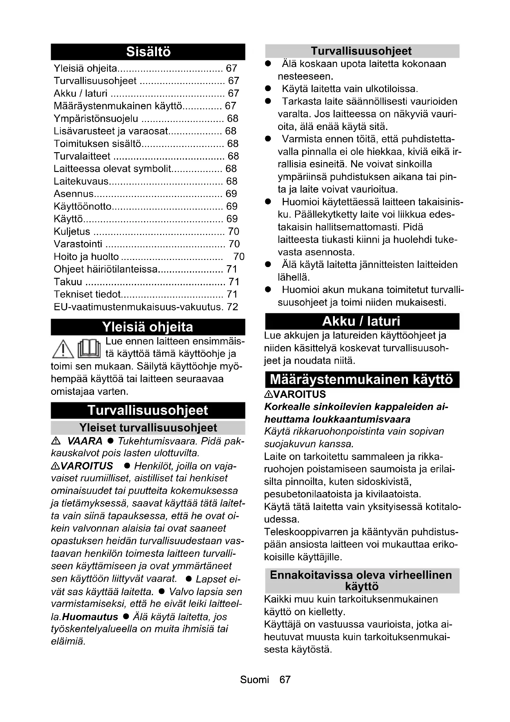 - Turvallisuusohjeet p. 67