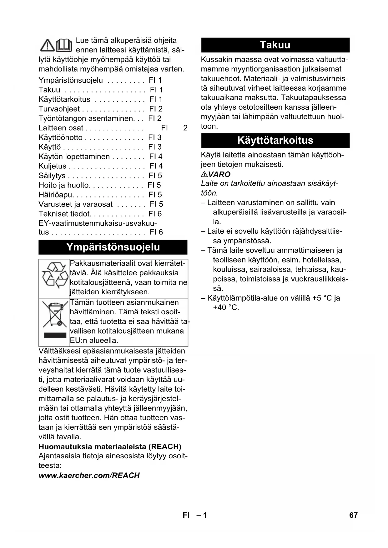 Chairman of the Board of Management Director Regulatory Affairs & Certification 66 SV– 1 Lue tämä alkuperäisiä ohjeita ennen laitteesi käyttämistä, säi- lytä käyttöohje myöhempää käyttöä tai mahdollista myöhempää omistajaa varten. Välttääksesi epäasianmukaisesta jätteiden hävittämisestä aiheutuvat ympäristö- ja ter- veyshaitat kierrätä tämä tuote vastuullises- ti, jotta materiaalivarat voidaan käyttää uu- delleen kestävästi. Hävitä käytetty laite toi- mittamalla se palautus- ja keräysjärjestel- mään tai ottamalla yhteyttä jälleenmyyjään, jolta ostit tuotteen. Hän ottaa tuotteen vas- taan ja kierrättää sen ympäristöä säästä- vällä tavalla. Huomautuksia materiaaleista (REACH) Ajantasaisia tietoja ainesosista löytyy osoit- teesta: www.kaercher.com/REACH Kussakin maassa ovat voimassa valtuutta- mamme myyntiorganisaation julkaisemat takuuehdot. Materiaali- ja valmistusvirheis- tä aiheutuvat virheet laitteessa korjaamme takuuaikana maksutta. Takuutapauksessa ota yhteys ostotositteen kanssa jälleen- myyjään tai lähimpään valtuutettuun huol- toon. Käytä laitetta ainoastaan tämän käyttöoh- jeen tietojen mukaisesti. 몇 VARO Laite on tarkoitettu ainoastaan sisäkäyt- töön. – Laitteen varustaminen on sallittu vain alkuperäisillä lisävarusteilla ja varaosil- la. – Laite ei sovellu käyttöön räjähdysalttiis- sa ympäristössä. – Tämä laite soveltuu ammattimaiseen ja teolliseen käyttöön, esim. hotelleissa, kouluissa, sairaaloissa, tehtaissa, kau- poissa, toimistoissa ja vuokrausliikkeis- sä. – Käyttölämpötila-alue on välillä +5 °C ja +40 °C. Ympäristönsuojelu . . . . . . . . . FI 1 Takuu . . . . . . . . . . . . . . . . . . . FI 1 Käyttötarkoitus . . . . . . . . . . . . FI 1 Turvaohjeet . . . . . . . . . . . . . . . FI 2 Työntötangon asentaminen. . . FI 2 Laitteen osat . . . . . . . . . . . . . . FI 2 Käyttöönotto . . . . . . . . . . . . . . FI 3 Käyttö . . . . . . . . . . . . . . . . . . . FI 3 Käytön lopettaminen . . . . . . . . FI 4 Kuljetus . . . . . . . . . . . . . . . . . . FI 4 Säilytys . . . . . . . . . . . . . . . . . . FI 5 Hoito ja huolto. . . . . . . . . . . . . FI 5 Häiriöapu. . . . . . . . . . . . . . . . . FI 5 Varusteet ja varaosat . . . . . . . FI 5 Tekniset tiedot. . . . . . . . . . . . . FI 6 EY-vaatimustenmukaisu-usvakuu- tus . . . . . . . . . . . . . . . . . . . . . . FI 6 Ympäristönsuojelu Pakkausmateriaalit ovat kierrätet- täviä. Älä käsittelee pakkauksia kotitalousjätteenä, vaan toimita ne jätteiden kierrätykseen. Tämän tuotteen asianmukainen hävittäminen. Tämä teksti osoit- taa, että tuotetta ei saa hävittää ta- vallisen kotitalousjätteen mukana EU:n alueella. Takuu Käyttötarkoitus 67FI– 2 Lue ja huomioi ennen laitteen ensimmäistä käyttöä tämä käyttöohje ja mukana oleva esite Turvaohjeet laikkakiilloituskonetta nro 5.956-659 varten. VAARA Huomautus välittömästi uhkaavasta vaa- rasta, joka voi aiheuttaa vakavan ruumiin- vamman tai johtaa kuolemaan. 몇 VAROITUS Huomautus mahdollisesta vaarallisesta ti- lanteesta, joka voi aiheuttaa vakavan ruu- miinvamman tai voi johtaa kuolemaan. 몇 VARO Huomautus mahdollisesta vaarallisesta ti- lanteesta, joka voi aiheuttaa vähäisiä vam- moja. HUOMIO Huomautus mahdollisesta vaarallisesta ti- lanteesta, joka voi aiheuttaa aineellisia va- hinkoja. Turvalaitteet on tarkoitettu käyttäjän suo- jaamiseksi loukkaantumiselta, eikä niitä saa poistaa käytöstä, eikä niiden toimintoa saa ohittaa. Estää laitteen tahattoman käynnistämisen. Kytke laite päälle painamalla lukituksen poistonäppäintä ja sitten päälle/pois-kytkin- tä. Asenna ennen käyttöönottoa työntötanko paikalleen ja muodostaa siitä sähköinen yhteys laitteeseen. Kuva, katso kansilehti Laitteen kuvassa näkyy laite BDS 43/150 C Classic. Laite BDS 43 / Duo C eroaa tästä hieman. 1 Mukaanotin, laikkaharja / laikan veto- alusta 2 Harja / laikan vetoalusta 3 Puhdistusaineliuoksen annosteluvipu (optio) 4 PÄÄLLE/POIS-kytkin 5 Kaapelikoukku 6 Lukituksen vapautuspainike 7 Käsikahva 8 Kaltevuudensäätövipu 9 Varoke harjakäyttö 10 Pistorasia lisävarusteille 11 Puhdistusainesäiliö (lisävaruste) 12 Moottorikotelo 13 Harjojen kierrosluvun kytkin (vain BDS 43 / Duo C) ** ei kuulu toimitukseen Turvaohjeet Vaarallisuusasteet Turvalaitteet Lukitus Työntötangon asentaminen Laitteen osat