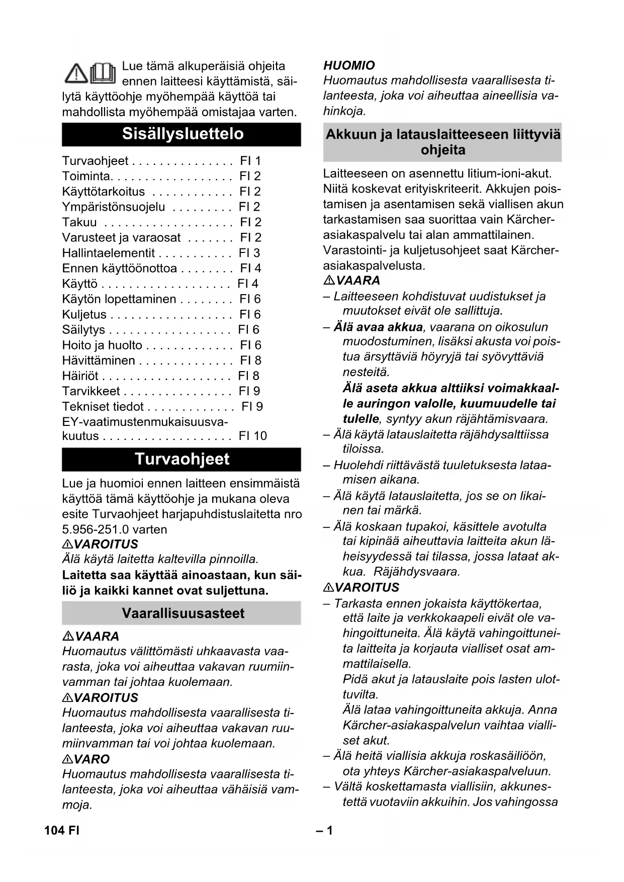 dB(A) 84 EU-försäkran om överensstämmelse Produkt: Skursugmaskin Typ: 1.783-xxx Tillämpliga EU-direktiv 2006/42/EG (+2009/127/EG) 2014/30/EU 2011/65/EU 2014/53/EU (TCU) Tillämpade harmoniserade normer EN 60335–1 EN 60335–2–72 EN 60335-2-29 EN 55012: 2007 + A1: 2009 EN 55014-1:2006 + A1: 2009 + A2:2011 EN 55014–2: 1997 + A1: 2001 + A2: 2008 EN 61000–3–2: 2014 EN 61000–3–3: 2013 EN 61000–6–2: 2005 EN 62233: 2008 EN IEC 63000: 2018 Tillämpade nationella normer TCU EN 301 511 V12.5.1 EN 300 440 V2.1.1 EN 300 328 V2.2.2 EN 300 330 V2.1.1 Chairman of the Board of Management Director Regulatory Affairs & Certification 103SV– 1 Lue tämä alkuperäisiä ohjeita ennen laitteesi käyttämistä, säi- lytä käyttöohje myöhempää käyttöä tai mahdollista myöhempää omistajaa varten. Lue ja huomioi ennen laitteen ensimmäistä käyttöä tämä käyttöohje ja mukana oleva esite Turvaohjeet harjapuhdistuslaitetta nro 5.956-251.0 varten 몇 VAROITUS Älä käytä laitetta kaltevilla pinnoilla. Laitetta saa käyttää ainoastaan, kun säi- liö ja kaikki kannet ovat suljettuna. VAARA Huomautus välittömästi uhkaavasta vaa- rasta, joka voi aiheuttaa vakavan ruumiin- vamman tai johtaa kuolemaan. 몇 VAROITUS Huomautus mahdollisesta vaarallisesta ti- lanteesta, joka voi aiheuttaa vakavan ruu- miinvamman tai voi johtaa kuolemaan. 몇 VARO Huomautus mahdollisesta vaarallisesta ti- lanteesta, joka voi aiheuttaa vähäisiä vam- moja. HUOMIO Huomautus mahdollisesta vaarallisesta ti- lanteesta, joka voi aiheuttaa aineellisia va- hinkoja. Laitteeseen on asennettu litium-ioni-akut. Niitä koskevat erityiskriteerit. Akkujen pois- tamisen ja asentamisen sekä viallisen akun tarkastamisen saa suorittaa vain Kärcher- asiakaspalvelu tai alan ammattilainen. Varastointi- ja kuljetusohjeet saat Kärcher- asiakaspalvelusta. VAARA – Laitteeseen kohdistuvat uudistukset ja muutokset eivät ole sallittuja. – Älä avaa akkua, vaarana on oikosulun muodostuminen, lisäksi akusta voi pois- tua ärsyttäviä höyryjä tai syövyttäviä nesteitä. Älä aseta akkua alttiiksi voimakkaal- le auringon valolle, kuumuudelle tai tulelle, syntyy akun räjähtämisvaara. – Älä käytä latauslaitetta räjähdysalttiissa tiloissa. – Huolehdi riittävästä tuuletuksesta lataa- misen aikana. – Älä käytä latauslaitetta, jos se on likai- nen tai märkä. – Älä koskaan tupakoi, käsittele avotulta tai kipinää aiheuttavia laitteita akun lä- heisyydessä tai tilassa, jossa lataat ak- kua. Räjähdysvaara. 몇 VAROITUS – Tarkasta ennen jokaista käyttökertaa, että laite ja verkkokaapeli eivät ole va- hingoittuneita. Älä käytä vahingoittunei- ta laitteita ja korjauta vialliset osat am- mattilaisella. Pidä akut ja latauslaite pois lasten ulot- tuvilta. Älä lataa vahingoittuneita akkuja. Anna Kärcher-asiakaspalvelun vaihtaa vialli- set akut. – Älä heitä viallisia akkuja roskasäiliöön, ota yhteys Kärcher-asiakaspalveluun. – Vältä koskettamasta viallisiin, akkunes- tettä vuotaviin akkuihin. Jos vahingossa Sisällysluettelo Turvaohjeet . . . . . . . . . . . . . . . FI 1 Toiminta. . . . . . . . . . . . . . . . . . FI 2 Käyttötarkoitus . . . . . . . . . . . . FI 2 Ympäristönsuojelu . . . . . . . . . FI 2 Takuu . . . . . . . . . . . . . . . . . . . FI 2 Varusteet ja varaosat . . . . . . . FI 2 Hallintaelementit . . . . . . . . . . . FI 3 Ennen käyttöönottoa . . . . . . . . FI 4 Käyttö . . . . . . . . . . . . . . . . . . . FI 4 Käytön lopettaminen . . . . . . . . FI 6 Kuljetus . . . . . . . . . . . . . . . . . . FI 6 Säilytys . . . . . . . . . . . . . . . . . . FI 6 Hoito ja huolto . . . . . . . . . . . . . FI 6 Hävittäminen . . . . . . . . . . . . . . FI 8 Häiriöt . . . . . . . . . . . . . . . . . . . FI 8 Tarvikkeet . . . . . . . . . . . . . . . . FI 9 Tekniset tiedot . . . . . . . . . . . . . FI 9 EY-vaatimustenmukaisuusva- kuutus . . . . . . . . . . . . . . . . . . . FI 10 Turvaohjeet Vaarallisuusasteet Akkuun ja latauslaitteeseen liittyviä ohjeita 104 FI– 2 joudut kosketuksiin nesteen kanssa, huuhdo vedellä. Jos nestettä pääsee kosketuksiin silmiisi, ota yhteys lääkä- riin. 몇 VARO – Tätä käyttöohjetta tulee ehdottomasti noudattaa. Noudata akkuja käsiteltäes- sä asiaa koskevia määräyksiä. – Tyyppikilvessä ilmoitetun jännitteen on oltava sama kuin pistorasian jännite. – Käytä latauslaitetta vain hyväksyttyjen akkupakkausten lataamiseen. – Akkua saa käyttää vain tässä laittees- sa, on kiellettyä ja vaarallista käyttää sitä muihin tarkoituksiin. Kun turvakytkin vapautetaan, harjakäyttö kytkeytyy pois päältä. Tätä yhdistelmäkonetta käytetään tasais- ten lattioiden märkäpuhdistukseen. Laitteen voi helposti sovittaa kulloiseenkin puhdistustehtävään säätämällä vesimää- rää. 350 mm:n työleveys ja raikas- ja likavesi- säiliöiden 12 litran tilavuus mahdollistavat tehokkaan puhdistuksen ja pitkän toiminta- ajan. Akun voi ladata sisäänrakennetulla lataus- laitteella 230 V pistorasiasta. Käytä laitetta ainoastaan tämän käyttöoh- jeen tietojen mukaisesti. – Tämä laite soveltuu ammattimaiseen käyttöön, esim. hotelleissa, kouluissa, sairaaloissa, tehtaissa, kaupoissa, toi- mistoissa ja välittäjäliikkeissä. – Laitetta saa käyttää vain kosteutta kes- tävien sileiden lattioiden puhdistami- seen. – Tämä kone on tarkoitettu käytettäväksi sisätiloissa. – Laite ei sovellu jäähtyneiden lattioiden puhdistamiseen (esim. jäähdyttämös- sä). – Laitteen varustaminen on sallittu vain alkuperäisillä lisävarusteilla ja varaosil- la. Pakkausmateriaalit ovat kierrätettä- viä. Älä käsittelee pakkauksia kotita- lousjätteenä, vaan toimita ne jätteiden kier- rätykseen. Käytetyt laitteet sisältävät arvokkaita kierrätettäviä materiaaleja, jotka tulisi toimittaa kierrätykseen. Tästä syystä toimita kuluneet laitteet vastaaviin keräily- laitoksiin.