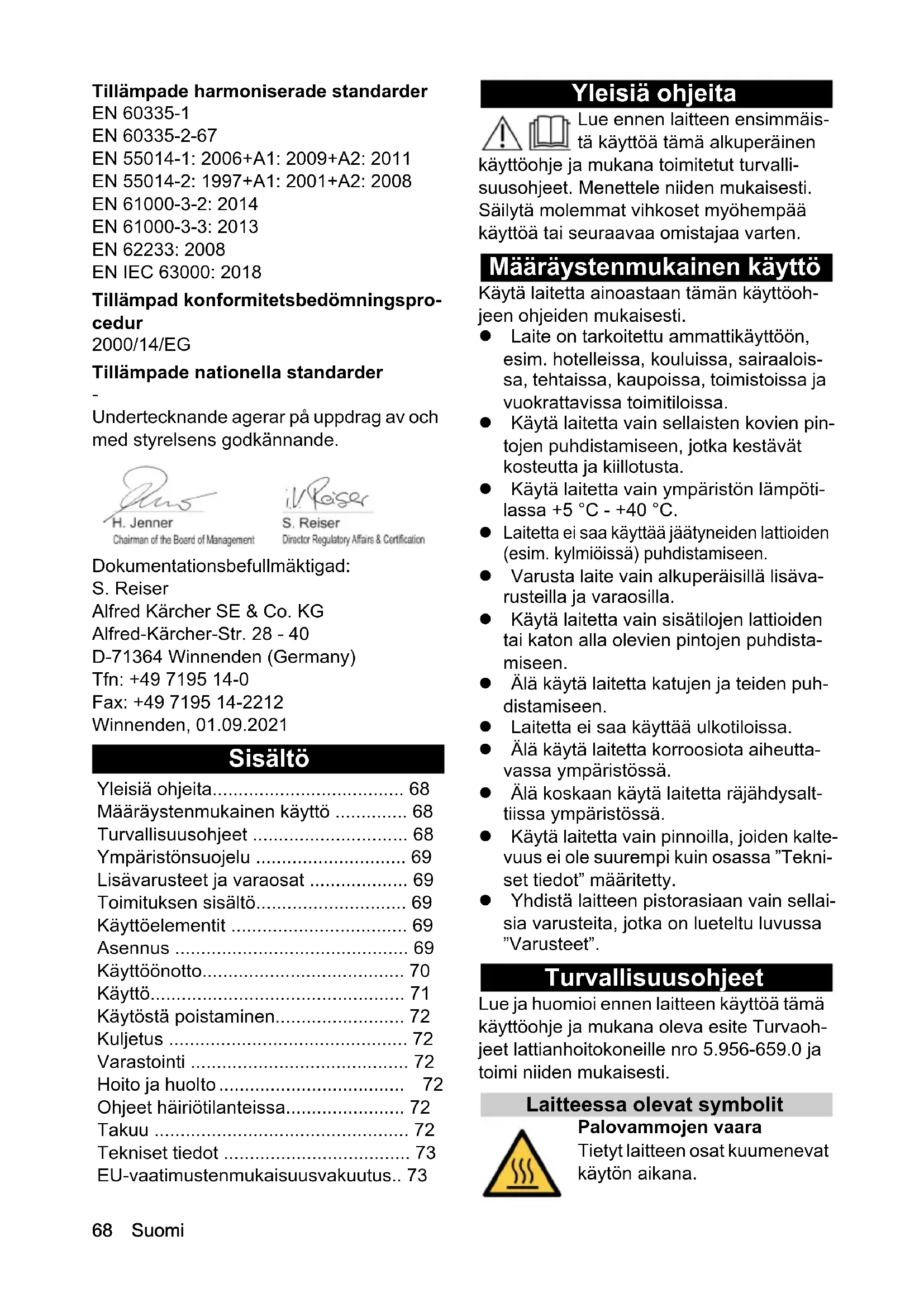 Undertecknande agerar på uppdrag av och med styrelsens godkännande. Dokumentationsbefullmäktigad: S. Reiser Alfred Kärcher SE & Co. KG Alfred-Kärcher-Str. 28 - 40 D-71364 Winnenden (Germany) Tfn: +49 7195 14-0 Fax: +49 7195 14-2212 Winnenden, 01.09.2021 Sisältö Yleisiä ohjeita Lue ennen laitteen ensimmäis- tä käyttöä tämä alkuperäinen käyttöohje ja mukana toimitetut turvalli- suusohjeet. Menettele niiden mukaisesti. Säilytä molemmat vihkoset myöhempää käyttöä tai seuraavaa omistajaa varten. Määräystenmukainen käyttö Käytä laitetta ainoastaan tämän käyttöoh- jeen ohjeiden mukaisesti. Laite on tarkoitettu ammattikäyttöön, esim. hotelleissa, kouluissa, sairaalois- sa, tehtaissa, kaupoissa, toimistoissa ja vuokrattavissa toimitiloissa. Käytä laitetta vain sellaisten kovien pin- tojen puhdistamiseen, jotka kestävät kosteutta ja kiillotusta. Käytä laitetta vain ympäristön lämpöti- lassa +5 °C - +40 °C.