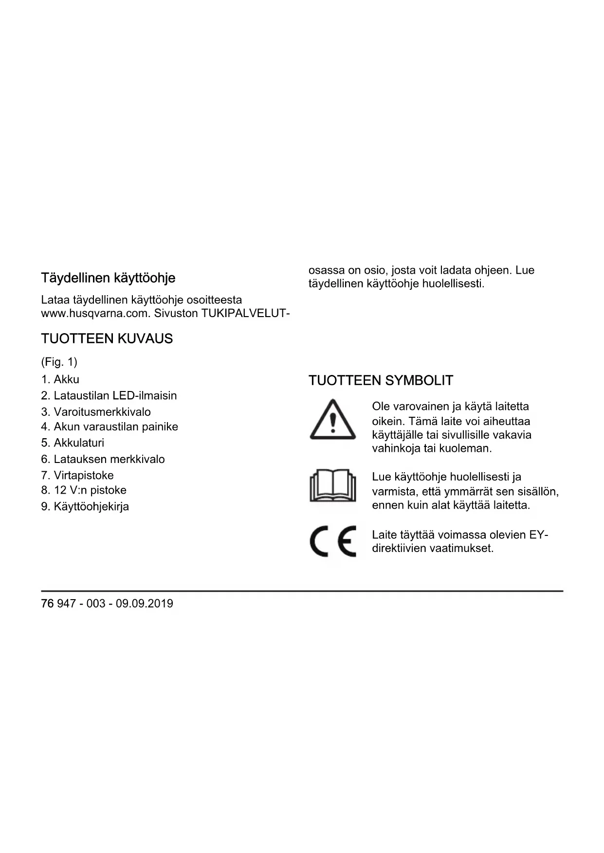 TUOTTEEN SYMBOLIT Ole varovainen ja käytä laitetta oikein. Tämä laite voi aiheuttaa käyttäjälle tai sivullisille vakavia vahinkoja tai kuoleman. Lue käyttöohje huolellisesti ja varmista, että ymmärrät sen sisällön, ennen kuin alat käyttää laitetta. Laite täyttää voimassa olevien EY- direktiivien vaatimukset. 76 947 - 003 - 09.09.2019Laitetta tai sen pakkausta ei saa hävittää kotitalousjätteen mukana. Vie se asianmukaiseen sähkö- ja elektroniikkalaitteiden keräyspisteeseen. Suojaa laite vedeltä ja sateelta. Käytä ja säilytä akkulaturia ainoastaan sisätiloissa. Huomautus: Muita laitteen symboleita/tarroja tarvitaan joillakin markkina-alueilla ilmaisemaan sertifiointivaatimuksia.