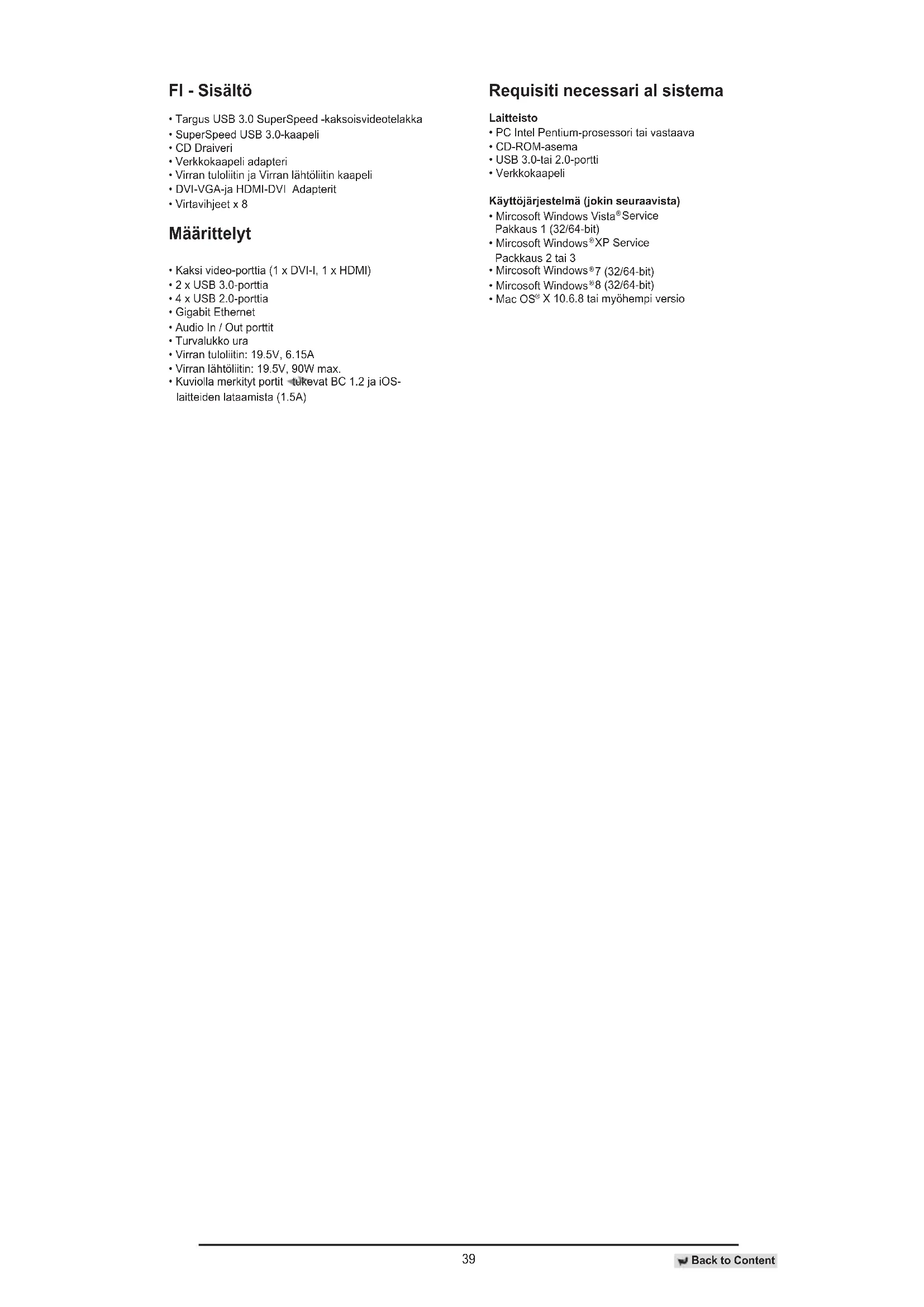- Kuviolla merkityt portit tukevat BC 1.2 ja iOS- laitteiden lataamista (1.5A) Requisiti necessari al sistema Laitteisto