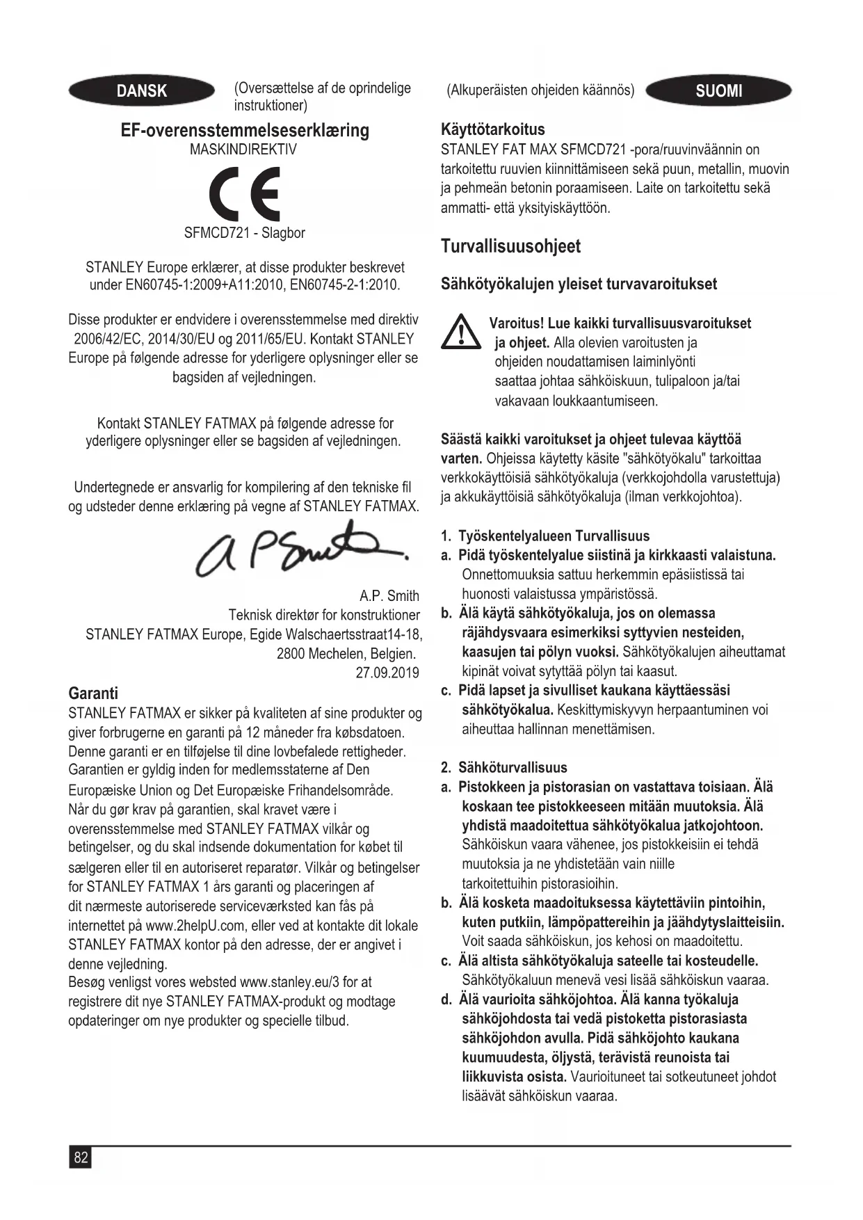 SFMCD721 - Iskuporakone STANLEY Europe vakuuttaa, että nämä kuvatut tuotteet täyttävät standardien EN60745-1:2009+A11:2010, EN60745- 2-1:2010 vaatimukset. Nämä tuotteet täyttävät myös direktiivien 2006/42/EY, 2014/30/EU ja 2011/65/EU vaatimukset. Saat lisätietoja ottamalla yhteyden STANLEY Europeiin. Osoitteet näkyvät käyttöohjeen takasivulla. Saat lisätietoja ottamalla yhteyden STANLEY FATMAXIIN. Osoitteet näkyvät käyttöohjeen takasivulla. Allekirjoittaja vastaa teknisistä tiedoista ja antaa tämän vakuutuksen STANLEY FATMAXIN puolesta. A.P. Smith Teknisen osaston johtaja STANLEY FATMAX Europe, Egide Walschaertsstraat14-18, 2800 Mechelen, Belgia.