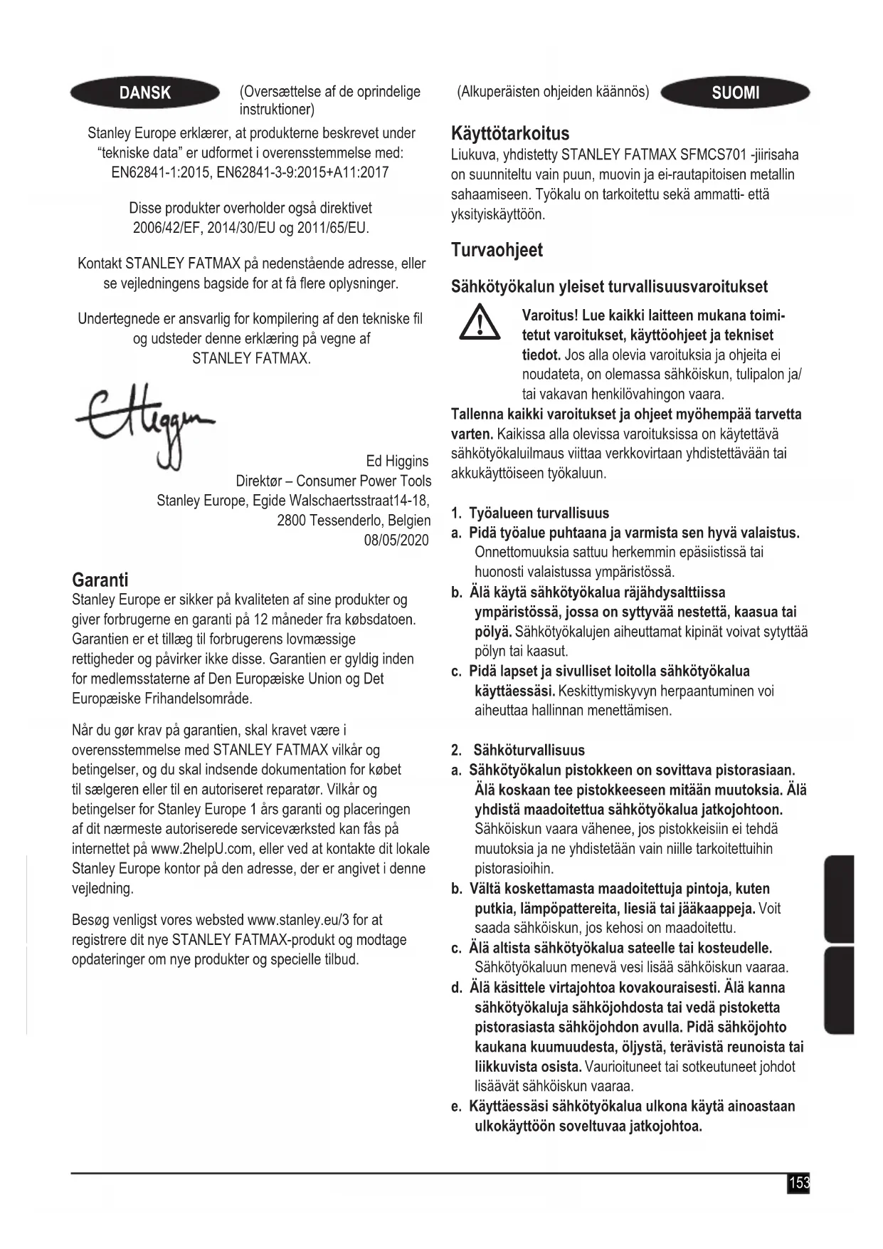 SFMCS701 Langaton katkaisu- ja jiirisaha liu'ulla Stanley Europe vakuuttaa, että nämä tuotteet täyttävät seuraavat määräykset: EN62841-1:2015, EN62841-3-9:2015+A11:2017 Nämä tuotteet täyttävät myös direktiivien 2006/42/EY, 2014/30/EY ja 2011/65/EY. Lisätietoja saa ottamalla STANLEY FATMAX seuraavassa osoitteessa. Tiedot ovat myös käyttöoppaan takakannessa. Allekirjoittaja vastaa teknisistä tiedoista ja antaa tämän vakuutuksen seuraavan yhtiön puolesta: STANLEY FATMAX. Ed Higgins Johtaja – Sähkötyökalut kuluttajille Stanley Europe, Egide Walschaertsstraat 14-18, 2800 Mechelen, Belgia 08/05/2020 Takuu Stanley Europe on vakuuttunut tuotteidensa korkeasta laadusta ja tarjoaa kuluttajille 12 kuukauden takuun, joka astuu voimaan ostopäivänä. Takuu on lisäys kuluttajan laillisiin oikeuksiin eikä vaikuta niihin. Tämä takuu on voimassa kaikissa EU- ja ETA-maissa. Edellytyksenä takuun saamiselle on, että STANLEY FATMAX -ehdot ja että ostaja toimittaa ostotositteen jälleenmyyjälle tai valtuutetulle huoltoliikkeelle. Stanley Europen yhden vuoden takuun ehdot ja lähimmän valtuutetun korjauspalvelun yhteystiedot ovat saatavilla osoitteessa www.2helpU. com tai ottamalla yhteyttä paikalliseen Stanley Europe -toimipisteeseen tässä ohjekirjassa ilmoitettuihin osoitteisiin. Käy verkkosivuillamme osoitteessa www.stanley.eu/3 ja rekisteröi uusi STANLEY FATMAX -tuotteesi saadaksesi tietoa uusista tuotteista ja erikoistarjouksista. (Μετάφραση των πρωτότυπων