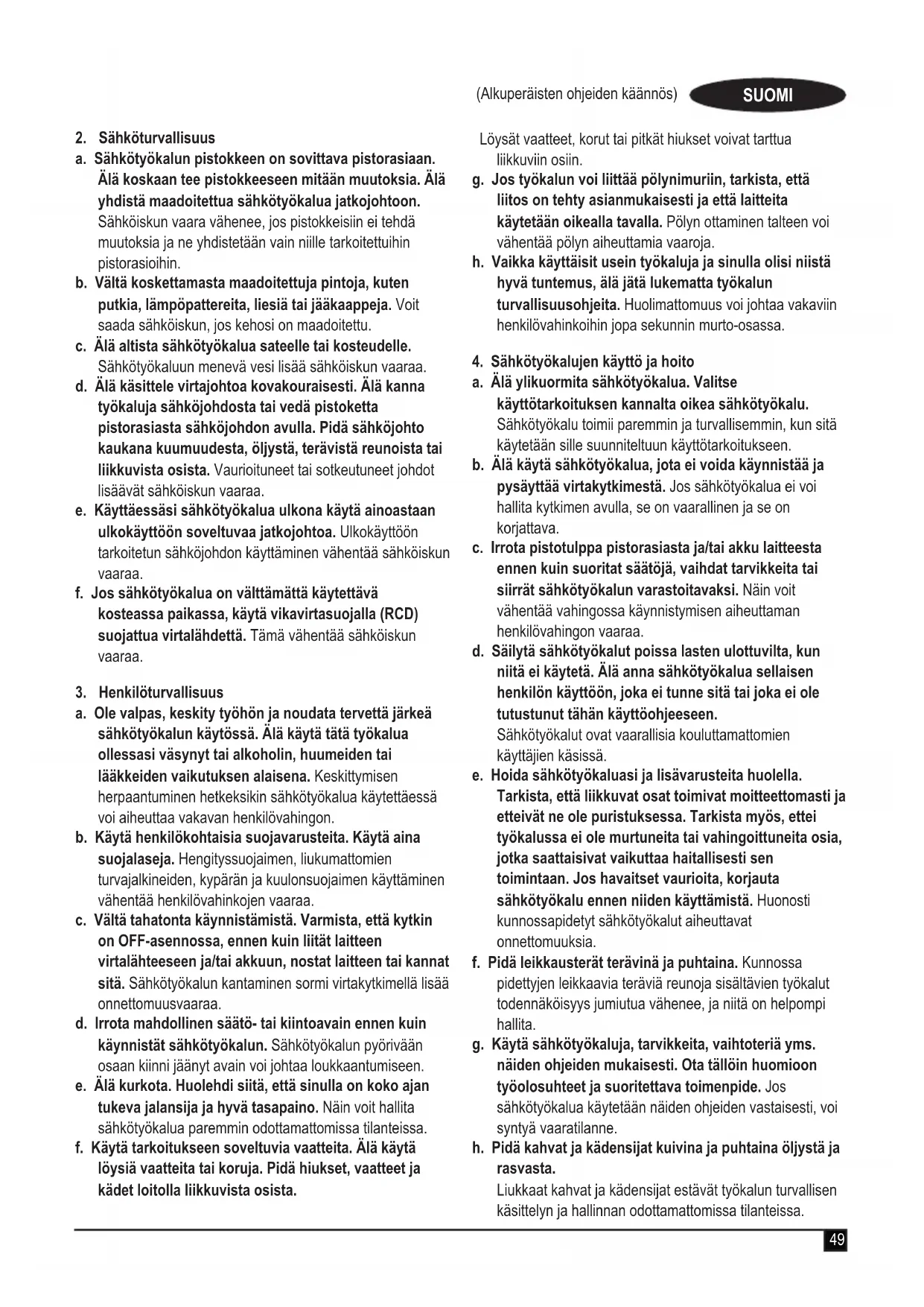 a. Pidä työalue puhtaana ja hyvin valaistuna. Onnettomuuksia sattuu herkemmin epäsiistissä tai huonosti valaistussa ympäristössä. b. Älä käytä sähkötyökalua räjähdysalttiissa ympäristössä, jossa on syttyvää nestettä, kaasua tai pölyä. Sähkötyökalujen aiheuttamat kipinät voivat sytyttää pölyn tai kaasut. c. Pidä lapset ja sivulliset loitolla sähkötyökalua käyttäessäsi. Keskittymiskyvyn herpaantuminen voi aiheuttaa hallinnan menettämisen.49 (Alkuperäisten ohjeiden käännös) SUOMI