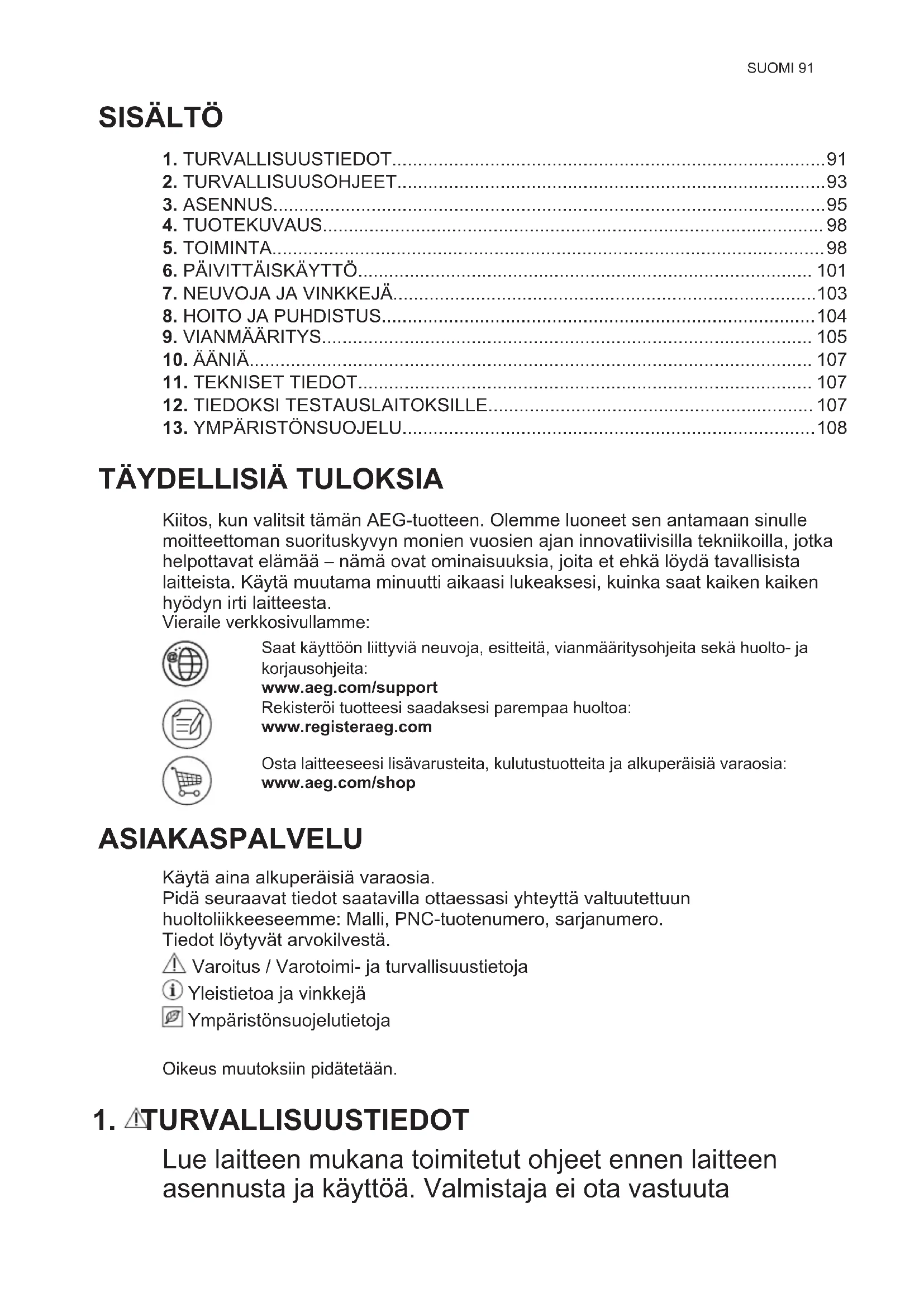 Kiitos, kun valitsit tämän AEG-tuotteen. Olemme luoneet sen antamaan sinulle moitteettoman suorituskyvyn monien vuosien ajan innovatiivisilla tekniikoilla, jotka helpottavat elämää – nämä ovat ominaisuuksia, joita et ehkä löydä tavallisista laitteista. Käytä muutama minuutti aikaasi lukeaksesi, kuinka saat kaiken kaiken hyödyn irti laitteesta. Vieraile verkkosivullamme: Saat käyttöön liittyviä neuvoja, esitteitä, vianmääritysohjeita sekä huolto- ja korjausohjeita: www.aeg.com/support Rekisteröi tuotteesi saadaksesi parempaa huoltoa: www.registeraeg.com Osta laitteeseesi lisävarusteita, kulutustuotteita ja alkuperäisiä varaosia: www.aeg.com/shop ASIAKASPALVELU Käytä aina alkuperäisiä varaosia. Pidä seuraavat tiedot saatavilla ottaessasi yhteyttä valtuutettuun huoltoliikkeeseemme: Malli, PNC-tuotenumero, sarjanumero. Tiedot löytyvät arvokilvestä. Varoitus / Varotoimi- ja turvallisuustietoja Yleistietoa ja vinkkejä Ympäristönsuojelutietoja Oikeus muutoksiin pidätetään.