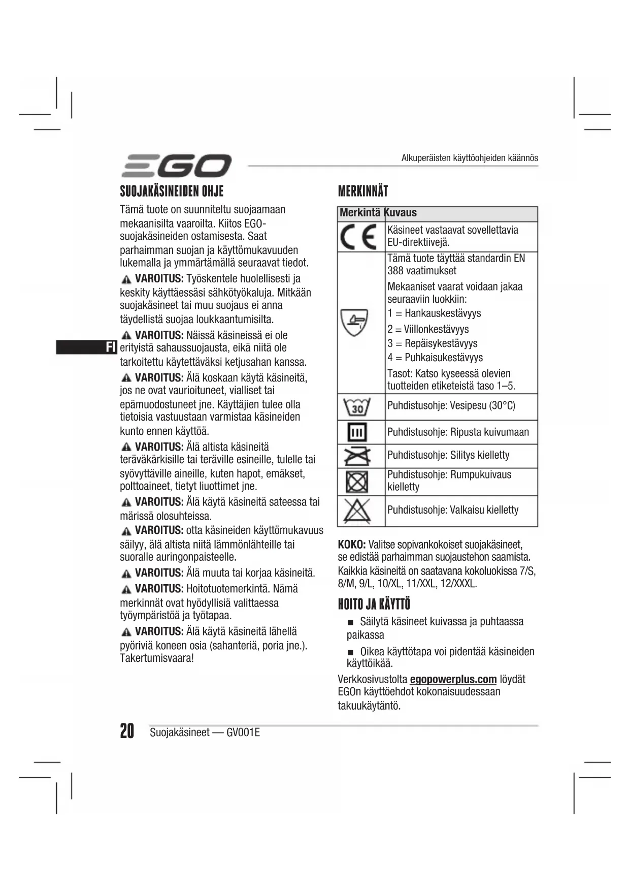 ■ Säilytä käsineet kuivassa ja puhtaassa paikassa ■ Oikea käyttötapa voi pidentää käsineiden käyttöikää. Verkkosivustolta egopowerplus.com löydät EGOn käyttöehdot kokonaisuudessaan takuukäytäntö. Alkuperäisten käyttöohjeiden käännösFI Suojakäsineet — GV001E