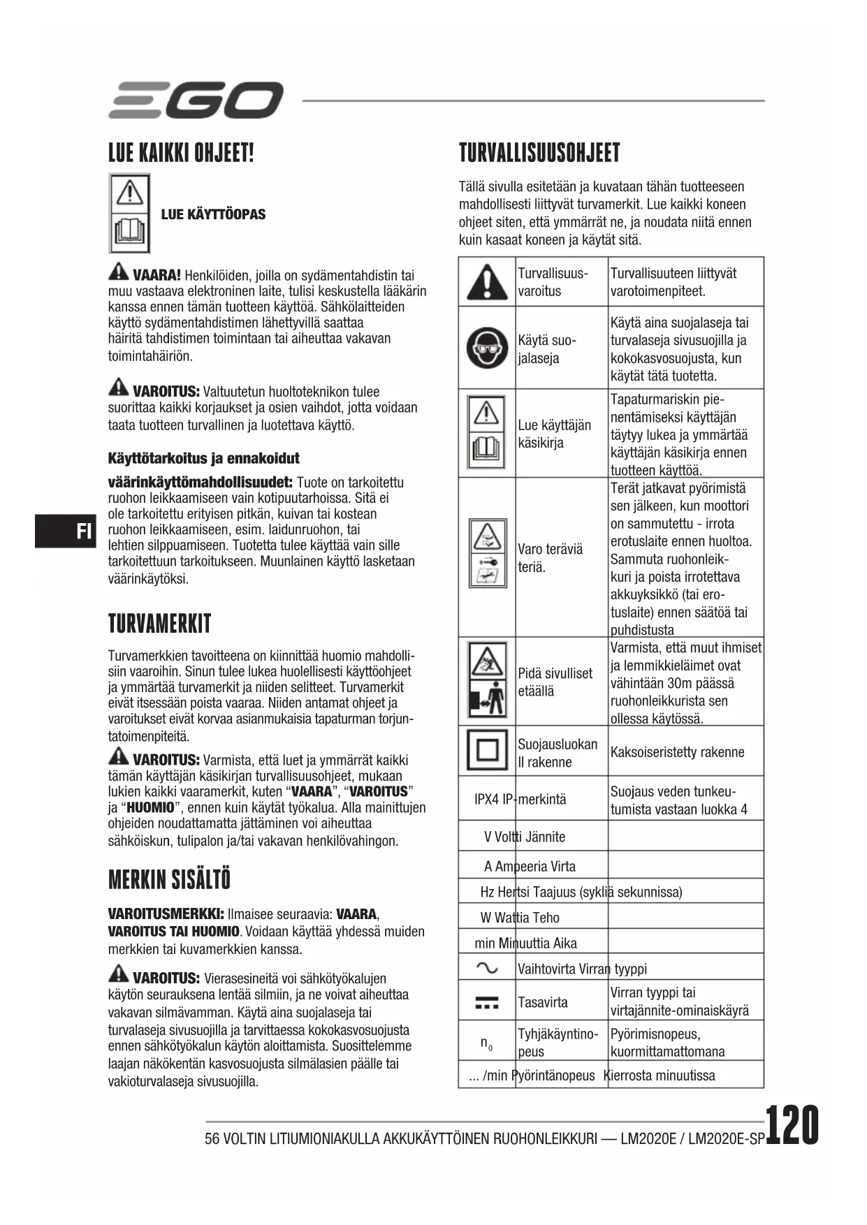 VAROITUSMERKKI: Ilmaisee seuraavia: VAARA, VAROITUS TAI HUOMIO. Voidaan käyttää yhdessä muiden merkkien tai kuvamerkkien kanssa. VAROITUS: Vierasesineitä voi sähkötyökalujen käytön seurauksena lentää silmiin, ja ne voivat aiheuttaa vakavan silmävamman. Käytä aina suojalaseja tai turvalaseja sivusuojilla ja tarvittaessa kokokasvosuojusta ennen sähkötyökalun käytön aloittamista. Suosittelemme laajan näkökentän kasvosuojusta silmälasien päälle tai vakioturvalaseja sivusuojilla. TURVALLISUUSOHJEET Tällä sivulla esitetään ja kuvataan tähän tuotteeseen mahdollisesti liittyvät turvamerkit. Lue kaikki koneen ohjeet siten, että ymmärrät ne, ja noudata niitä ennen kuin kasaat koneen ja käytät sitä.Turvallisuus-varoitusTurvallisuuteen liittyvät varotoimenpiteet.Käytä suo-jalasejaKäytä aina suojalaseja tai turvalaseja sivusuojilla ja kokokasvosuojusta, kun käytät tätä tuotetta.Lue käyttäjän käsikirjaTapaturmariskin pie-nentämiseksi käyttäjän täytyy lukea ja ymmärtää käyttäjän käsikirja ennen tuotteen käyttöä.Varo teräviä teriä.Terät jatkavat pyörimistä sen jälkeen, kun moottori on sammutettu - irrota erotuslaite ennen huoltoa. Sammuta ruohonleik-kuri ja poista irrotettava akkuyksikkö (tai ero-tuslaite) ennen säätöä tai puhdistustaPidä sivulliset etäälläVarmista, että muut ihmiset ja lemmikkieläimet ovat vähintään 30m päässä ruohonleikkurista sen ollessa käytössä.Suojausluokan II rakenneKaksoiseristetty rakenneIPX4 IP-merkintäSuojaus veden tunkeu-tumista vastaan luokka 4V Voltti JänniteA Ampeeria VirtaHz Hertsi Taajuus (sykliä sekunnissa)W Wattia Tehomin Minuuttia AikaVaihtovirta Virran tyyppiTasavirtaVirran tyyppi tai virtajännite-ominaiskäyrä