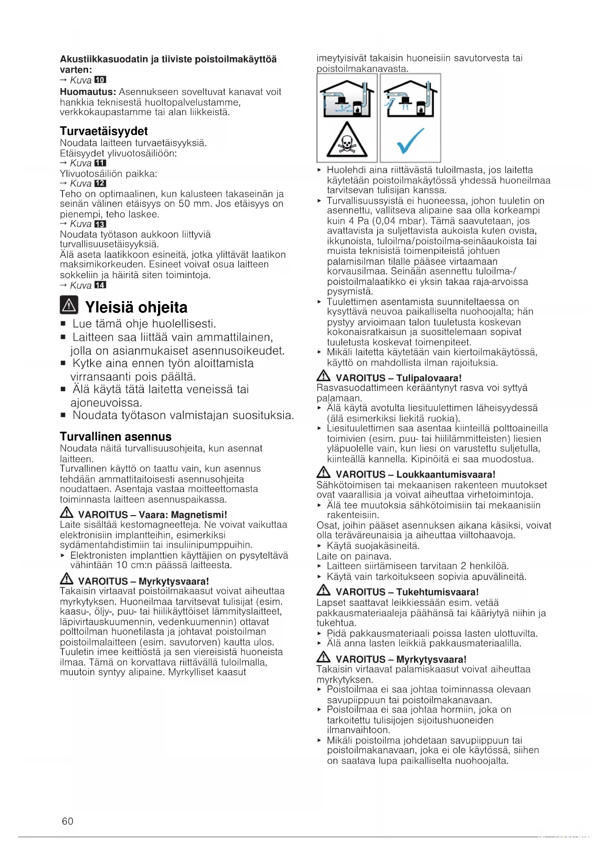 Yleisiä ohjeita ¡ Lue tämä ohje huolellisesti. ¡ Laitteen saa liittää vain ammattilainen, jolla on asianmukaiset asennusoikeudet. ¡ Kytke aina ennen työn aloittamista virransaanti pois päältä. ¡ Älä käytä tätä laitetta veneissä tai ajoneuvoissa. ¡ Noudata työtason valmistajan suosituksia. Turvallinen asennus Noudata näitä turvallisuusohjeita, kun asennat laitteen. Turvallinen käyttö on taattu vain, kun asennus tehdään ammattitaitoisesti asennusohjeita noudattaen. Asentaja vastaa moitteettomasta toiminnasta laitteen asennuspaikassa. VAROITUS‒Vaara: Magnetismi! Laite sisältää kestomagneetteja. Ne voivat vaikuttaa elektronisiin implantteihin, esimerkiksi sydämentahdistimiin tai insuliinipumppuihin. ▶ Elektronisten implanttien käyttäjien on pysyteltävä vähintään 10cm:n päässä laitteesta. VAROITUS‒Myrkytysvaara! Takaisin virtaavat poistoilmakaasut voivat aiheuttaa myrkytyksen. Huoneilmaa tarvitsevat tulisijat (esim. kaasu-, öljy-, puu- tai hiilikäyttöiset lämmityslaitteet, läpivirtauskuumennin, vedenkuumennin) ottavat polttoilman huonetilasta ja johtavat poistoilman poistoilmalaitteen (esim. savutorven) kautta ulos. Tuuletin imee keittiöstä ja sen viereisistä huoneista ilmaa. Tämä on korvattava riittävällä tuloilmalla, muutoin syntyy alipaine. Myrkylliset kaasut imeytyisivät takaisin huoneisiin savutorvesta tai poistoilmakanavasta. ▶ Huolehdi aina riittävästä tuloilmasta, jos laitetta käytetään poistoilmakäytössä yhdessä huoneilmaa tarvitsevan tulisijan kanssa. ▶ Turvallisuussyistä ei huoneessa, johon tuuletin on asennettu, vallitseva alipaine saa olla korkeampi kuin 4Pa(0,04mbar). Tämä saavutetaan, jos avattavista ja suljettavista aukoista kuten ovista, ikkunoista, tuloilma/poistoilma-seinäaukoista tai muista teknisistä toimenpiteistä johtuen palamisilman tilalle pääsee virtaamaan korvausilmaa. Seinään asennettu tuloilma-/ poistoilmalaatikko ei yksin takaa raja-arvoissa pysymistä. ▶ Tuulettimen asentamista suunniteltaessa on kysyttävä neuvoa paikalliselta nuohoojalta; hän pystyy arvioimaan talon tuuletusta koskevan kokonaisratkaisun ja suosittelemaan sopivat tuuletusta koskevat toimenpiteet. ▶ Mikäli laitetta käytetään vain kiertoilmakäytössä, käyttö on mahdollista ilman rajoituksia. VAROITUS‒Tulipalovaara! Rasvasuodattimeen kerääntynyt rasva voi syttyä palamaan. ▶ Älä käytä avotulta liesituulettimen läheisyydessä (älä esimerkiksi liekitä ruokia). ▶ Liesituulettimen saa asentaa kiinteillä polttoaineilla toimivien (esim. puu- tai hiililämmitteisten) liesien yläpuolelle vain, kun liesi on varustettu suljetulla, kiinteällä kannella. Kipinöitä ei saa muodostua. VAROITUS‒Loukkaantumisvaara! Sähkötoimisen tai mekaanisen rakenteen muutokset ovat vaarallisia ja voivat aiheuttaa virhetoimintoja. ▶ Älä tee muutoksia sähkötoimisiin tai mekaanisiin rakenteisiin. Osat, joihin pääset asennuksen aikana käsiksi, voivat olla teräväreunaisia ja aiheuttaa viiltohaavoja. ▶ Käytä suojakäsineitä. Laite on painava. ▶ Laitteen siirtämiseen tarvitaan 2 henkilöä. ▶ Käytä vain tarkoitukseen sopivia apuvälineitä. VAROITUS‒Tukehtumisvaara! Lapset saattavat leikkiessään esim. vetää pakkausmateriaaleja päähänsä tai kääriytyä niihin ja tukehtua. ▶ Pidä pakkausmateriaali poissa lasten ulottuvilta. ▶ Älä anna lasten leikkiä pakkausmateriaalilla. VAROITUS‒Myrkytysvaara! Takaisin virtaavat palamiskaasut voivat aiheuttaa myrkytyksen. ▶ Poistoilmaa ei saa johtaa toiminnassa olevaan savupiippuun tai poistoilmakanavaan. ▶ Poistoilmaa ei saa johtaa hormiin, joka on tarkoitettu tulisijojen sijoitushuoneiden ilmanvaihtoon. ▶ Mikäli poistoilma johdetaan savupiippuun tai poistoilmakanavaan, joka ei ole käytössä, siihen on saatava lupa paikalliselta nuohoojalta.61 Takaisin virtaavat palamiskaasut voivat aiheuttaa myrkytyksen. ▶ Jos liesituuletin asennetaan tilaan, jossa on huoneilmaa käyttävä tulisija, liesituulettimen virransyöttöön on asennettava asianmukainen turvakytkin. Sähköliitäntää koskevia ohjeita Jotta laitteen sähköliitäntä on turvallinen, noudata seuraavia ohjeita. VAROITUS‒Sähköiskun vaara! Laite pitää saada aina irrotettua verkkovirrasta. Laitteen saa liittää vain määräystenmukaisesti asennettuun pistorasiaan. ▶ Kiinteään sähköliitäntään on asennettava ylijänniteluokan III ehtojen ja asennusmääräysten mukainen jokanapainen katkaisin. ▶ Kiinteän sähköasennuksen saa tehdä vain sähköasentaja. Suosittelemme asentamaan vikavirtakatkaisimen (FI-katkaisin) laitteen jännitteensaannin virtapiiriin. ¡ Älä taita liitäntäjohtoa tai jätä sitä puristuksiin äläkä vie sitä terävien kulmien lähelle. ¡ Sijoita liitäntäjohto siten, että se ei kosketa laitteen kuumaa koteloa. ¡ Käytä vain laitteen mukana toimitettua tai teknisen huoltopalvelun toimittamaa liitäntäjohtoa. ¡ Laite on radiohäiriösuojattu EY-määräysten mukaisesti. ¡ Laitteen suojaluokka on 1. Laitteen käyttö on siten sallittu vain maadoitusliitännän kanssa. ¡ Valmistaja ei vastaa käyttöhäiriöistä tai mahdollisista vaurioista, jotka johtuvat virheellisestä sähköasennuksesta. Sähköliitännän valmistelu Vaatimus:Laitteen sisäpuolelle kohdistuvat työt ja verkkojohdon vaihdon saa tehdä vain asianmukaisen koulutuksen saanut huoltopalvelun henkilöstö.