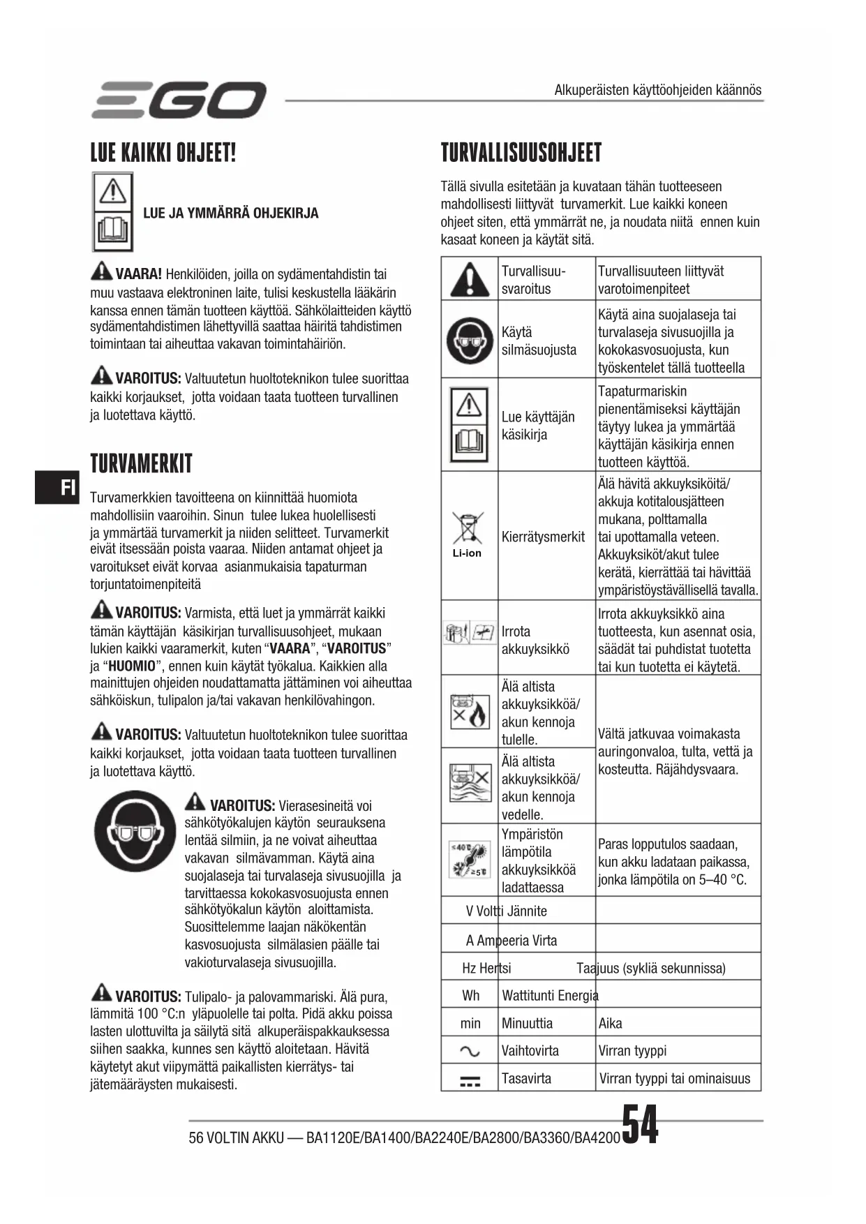 VAROITUS: Lue ja ymmärrä kaikki ohjeet. Ohjeiden noudattamatta jättäminen voi aiheuttaa sähköiskun, tulipalon ja/tai vakavan henkilövahingon. Käsite “sähkötyökalu” tarkoittaa kaikissa mainituissa varoituksissa EGO Power+ - akulla toimivia (johdottomia) nurmi- ja puutarhakoneita.