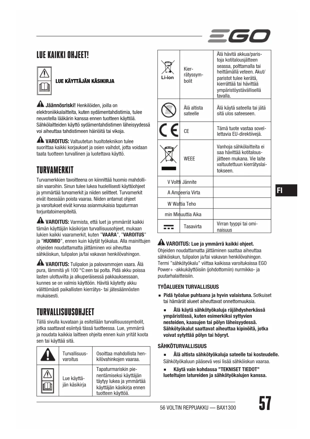 LUE KAIKKI OHJEET! LUE KÄYTTÄJÄN KÄSIKIRJA Jäännösriski! Henkilöiden, joilla on elektroniikkalaitteita, kuten sydämentahdistimia, tulee neuvotella lääkärin kanssa ennen tuotteen käyttöä. Sähkölaitteiden käyttö sydämentahdistimen läheisyydessä voi aiheuttaa tahdistimeen häiriöitä tai vikoja. VAROITUS: Valtuutetun huoltoteknikon tulee suorittaa kaikki korjaukset ja osien vaihdot, jotta voidaan taata tuotteen turvallinen ja luotettava käyttö. TURVAMERKIT Turvamerkkien tavoitteena on kiinnittää huomio mahdolli-siin vaaroihin. Sinun tulee lukea huolellisesti käyttöohjeet ja ymmärtää turvamerkit ja niiden selitteet. Turvamerkit eivät itsessään poista vaaraa. Niiden antamat ohjeet ja varoitukset eivät korvaa asianmukaisia tapaturman torjuntatoimenpiteitä. VAROITUS: Varmista, että luet ja ymmärrät kaikki tämän käyttäjän käsikirjan turvallisuusohjeet, mukaan lukien kaikki vaaramerkit, kuten ”VAARA”, ”VAROITUS” ja ”HUOMIO”, ennen kuin käytät työkalua. Alla mainittujen ohjeiden noudattamatta jättäminen voi aiheuttaa sähköiskun, tulipalon ja/tai vakavan henkilövahingon. VAROITUS: Tulipalon ja palovammojen vaara. Älä pura, lämmitä yli 100 °C:een tai polta. Pidä akku poissa lasten ulottuvilta ja alkuperäisessä pakkauksessaan, kunnes se on valmis käyttöön. Hävitä käytetty akku välittömästi paikallisten kierrätys- tai jätesäännösten mukaisesti. TURVALLISUUSOHJEET Tällä sivulla kuvataan ja esitellään turvallisuussymbolit, jotka saattavat esiintyä tässä tuotteessa. Lue, ymmärrä ja noudata kaikkia laitteen ohjeita ennen kuin yrität koota sen tai käyttää sitä.Turvallisuus-varoitusOsoittaa mahdollista hen-kilövahinkojen vaaraa.Lue käyttä-jän käsikirjaTapaturmariskin pie-nentämiseksi käyttäjän täytyy lukea ja ymmärtää käyttäjän käsikirja ennen tuotteen käyttöä. Li-ion Kier-rätyssym-bolitÄlä hävitä akkua/paris-toja kotitalousjätteen seassa, polttamalla tai heittämällä veteen. Akut/paristot tulee kerätä, kierrättää tai hävittää ympäristöystävällisellä tavalla.Älä altista sateelleÄlä käytä sateella tai jätä sitä ulos sateeseen. Tämä tuote vastaa sovel-lettavia EU-direktiivejä. WEEE Vanhoja sähkölaitteita ei saa hävittää kotitalous-jätteen mukana. Vie laite valtuutettuun kierrätyslai-tokseen.V Voltti JänniteA Ampeeria VirtaW Wattia Tehomin Minuuttia AikaTasavirtaVirran tyyppi tai omi-naisuus VAROITUS: Lue ja ymmärrä kaikki ohjeet. Ohjeiden noudattamatta jättäminen saattaa aiheuttaa sähköiskun, tulipalon ja/tai vakavan henkilövahingon. Termi ”sähkötyökalu” viittaa kaikissa varoituksissa EGO Power+ -akkukäyttöisiin (johdottomiin) nurmikko- ja puutarhalaitteisiin.