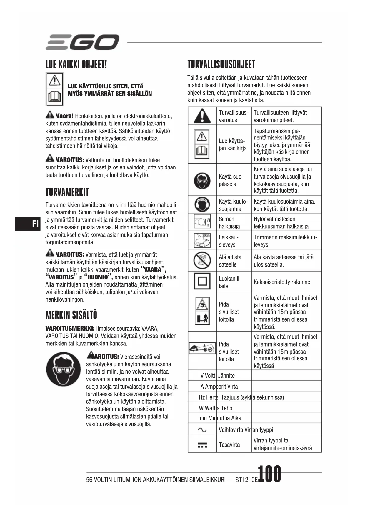 VAROITUSMERKKI: Ilmaisee seuraavia: VAARA, VAROITUS TAI HUOMIO. Voidaan käyttää yhdessä muiden merkkien tai kuvamerkkien kanssa. VAROITUS: Vierasesineitä voi sähkötyökalujen käytön seurauksena lentää silmiin, ja ne voivat aiheuttaa vakavan silmävamman. Käytä aina suojalaseja tai turvalaseja sivusuojilla ja tarvittaessa kokokasvosuojusta ennen sähkötyökalun käytön aloittamista. Suosittelemme laajan näkökentän kasvosuojusta silmälasien päälle tai vakioturvalaseja sivusuojilla. TURVALLISUUSOHJEET Tällä sivulla esitetään ja kuvataan tähän tuotteeseen mahdollisesti liittyvät turvamerkit. Lue kaikki koneen ohjeet siten, että ymmärrät ne, ja noudata niitä ennen kuin kasaat koneen ja käytät sitä.Turvallisuus-varoitusTurvallisuuteen liittyvät varotoimenpiteet.Lue käyttä-jän käsikirjaTapaturmariskin pie-nentämiseksi käyttäjän täytyy lukea ja ymmärtää käyttäjän käsikirja ennen tuotteen käyttöä.Käytä suo-jalasejaKäytä aina suojalaseja tai turvalaseja sivusuojilla ja kokokasvosuojusta, kun käytät tätä tuotetta.Käytä kuulo-suojaimiaKäytä kuulosuojaimia aina, kun käytät tätä tuotetta. Ø2mmSiiman halkaisijaNylonvalmisteisen leikkuusiiman halkaisijaLeikkau-sleveysTrimmerin maksimileikkuu-leveysÄlä altista sateelleÄlä käytä sateessa tai jätä ulos sateella.Luokan II laiteKaksoiseristetty rakennePidä sivulliset loitollaVarmista, että muut ihmiset ja lemmikkieläimet ovat vähintään 15m päässä trimmeristä sen ollessa käytössä. 15m Pidä sivulliset loitollaVarmista, että muut ihmiset ja lemmikkieläimet ovat vähintään 15m päässä trimmeristä sen ollessa käytössäV Voltti JänniteA Ampeerit VirtaHz Hertsi Taajuus (sykliä sekunnissa)W Wattia Tehomin Minuuttia AikaVaihtovirta Virran tyyppiTasavirtaVirran tyyppi tai virtajännite-ominaiskäyrä56 VOLTIN LITIUM-ION AKKUKÄYTTÖINEN SIIMALEIKKURI — ST1210E