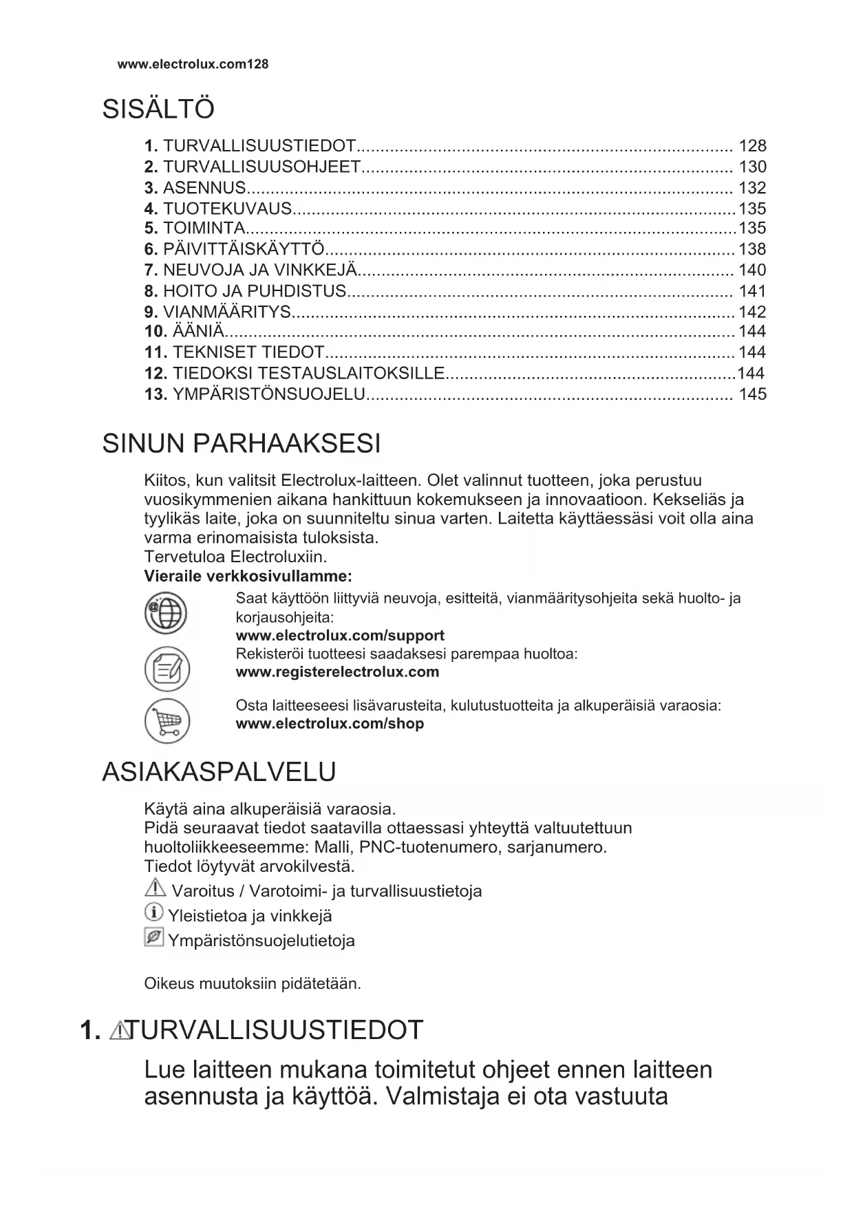 Kiitos, kun valitsit Electrolux-laitteen. Olet valinnut tuotteen, joka perustuu vuosikymmenien aikana hankittuun kokemukseen ja innovaation. Kekseliäs ja tyylikäs laite, joka on suunniteltu sinua varten. Laitetta käyttaessävi voit olla aina varma erinomaisista tuloksista.