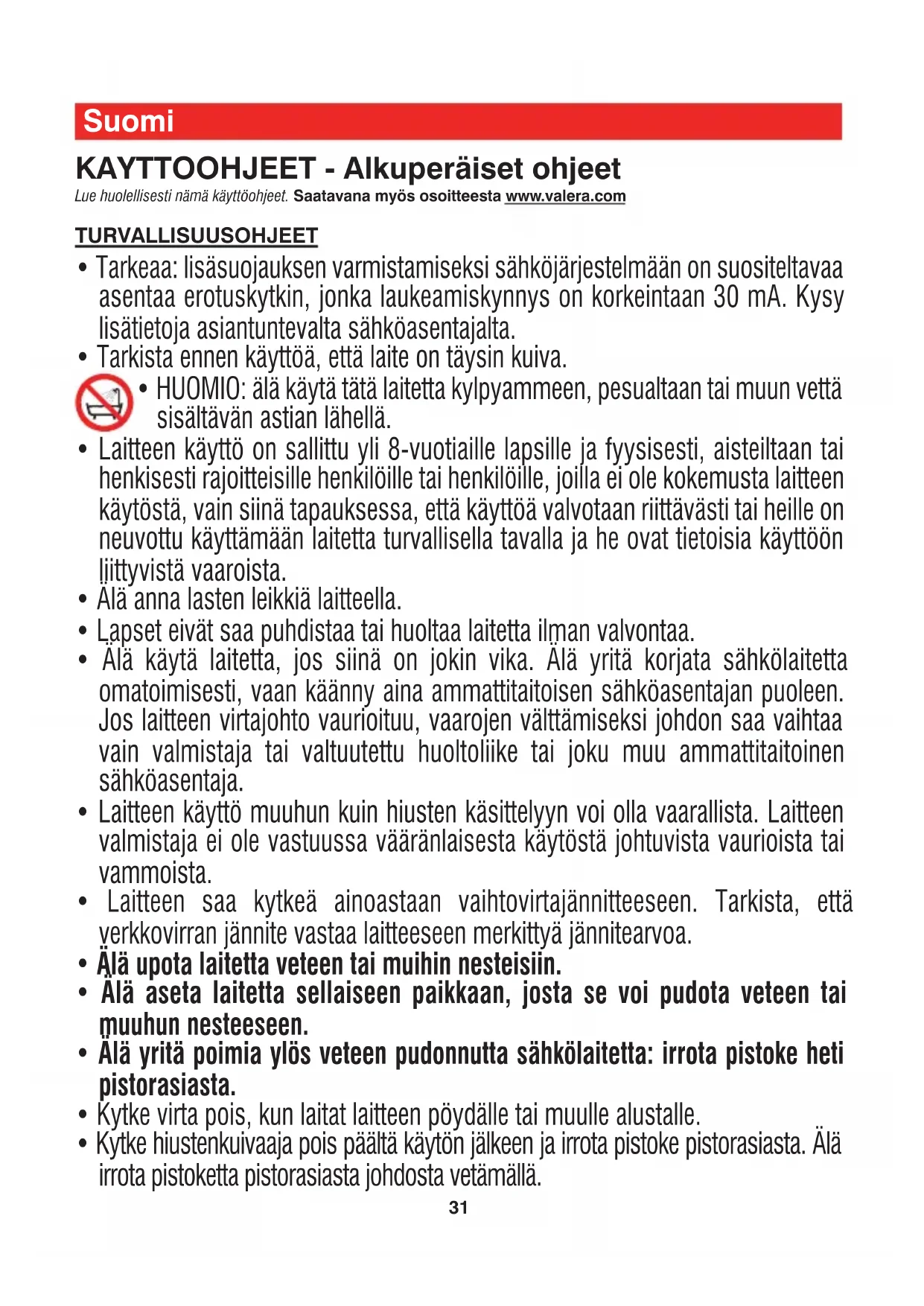 korjataan valtuuttamattomien henkilöiden toimesta. Jos laitteessa esiintyy joku vika, palauta se hyvin pakattuna yhdessä myyjän päiväämän ja leimaaman takuutodistuksen kanssa johonkin valtuutettuun huoltoliikkeeseemme tai jälleenmyyjälle, joka toimittaa sen viralliselle maahantuojalle takuukorjausta varten. VALERA on Ligo Electric S.A:n (Sveitsi) rekisteröity tavaramerkki. 00060713_19-03_Layout 1 29/01/2019 11:19 Pagina 3334 Dansk BRUGSANVISNING’ - Original brugsanvisning Læs brugsanvisningen med omhu. Også tilgængelige på www.valera.com SIKKERHEDSADVARSLER