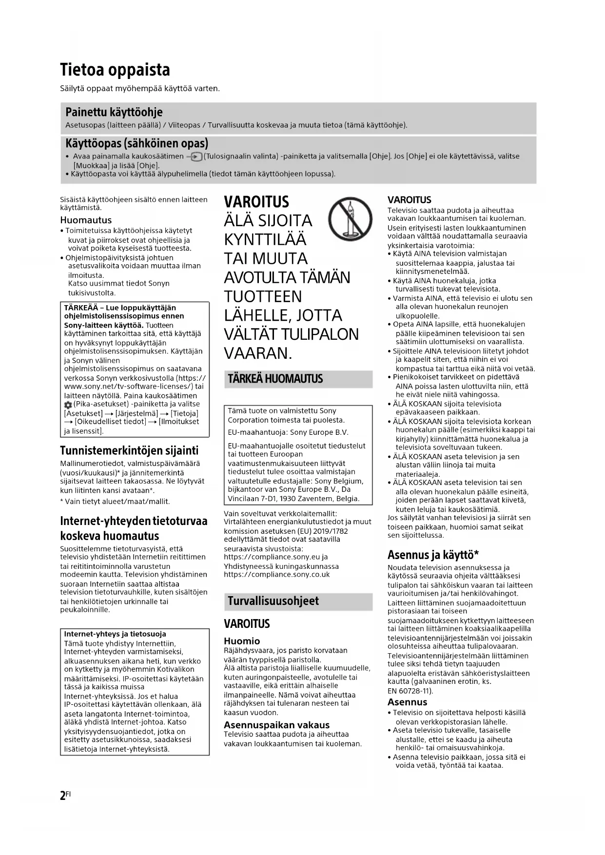 VAARAN. Vain soveltuvat verkkolaitemallit:Virtalähteen energiankulutustiedot ja muut komission asetuksen (EU) 2019/1782 edellyttämät tiedot ovat saatavilla seuraavista sivustoista: https://compliance.sony.eu ja Yhdistyneessä kuningaskunnassa https://compliance.sony.co.uk VAROITUS Huomio Räjähdysvaara, jos paristo korvataan väärän tyyppisellä paristolla.Älä altista paristoja liialliselle kuumuudelle, kuten auringonpaisteelle, avotulelle tai vastaaville, eikä erittäin alhaiselle ilmanpaineelle. Nämä voivat aiheuttaa räjähdyksen tai tulenaran nesteen tai kaasun vuodon. Asennuspaikan vakaus Televisio saattaa pudota ja aiheuttaa vakavan loukkaantumisen tai kuoleman. VAROITUS Televisio saattaa pudota ja aiheuttaa vakavan loukkaantumisen tai kuoleman. Usein erityisesti lasten loukkaantuminen voidaan välttää noudattamalla seuraavia yksinkertaisia varotoimia:• Käytä AINA television valmistajan suosittelemaa kaappia, jalustaa tai kiinnitysmenetelmää.• Käytä AINA huonekaluja, jotka turvallisesti tukevat televisiota.• Varmista AINA, että televisio ei ulotu sen alla olevan huonekalun reunojen ulkopuolelle.• Opeta AINA lapsille, että huonekalujen päälle kiipeäminen televisioon tai sen säätimiin ulottumiseksi on vaarallista.• Sijoittele AINA televisioon liitetyt johdot ja kaapelit siten, että niihin ei voi kompastua tai tarttua eikä niitä voi vetää.• Pienikokoiset tarvikkeet on pidettävä AINA poissa lasten ulottuvilta niin, että he eivät niele niitä vahingossa.• ÄLÄ KOSKAAN sijoita televisiota epävakaaseen paikkaan.• ÄLÄ KOSKAAN sijoita televisiota korkean huonekalun päälle (esimerkiksi kaappi tai kirjahylly) kiinnittämättä huonekalua ja televisiota soveltuvaan tukeen.• ÄLÄ KOSKAAN aseta television ja sen alustan väliin liinoja tai muita materiaaleja.• ÄLÄ KOSKAAN aseta television tai sen alla olevan huonekalun päälle esineitä, joiden perään lapset saattavat kiivetä, kuten leluja tai kaukosäätimiä.Jos säilytät vanhan televisiosi ja siirrät sen toiseen paikkaan, huomioi samat seikat sen sijoittelussa. Asennus ja käyttö* Noudata television asennuksessa ja käytössä seuraavia ohjeita välttääksesi tulipalon tai sähköiskun vaaran tai laitteen vaurioitumisen ja/tai henkilövahingot.Laitteen liittäminen suojamaadoitettuun pistorasiaan tai toiseen suojamaadoitukseen kytkettyyn laitteeseen tai laitteen liittäminen koaksiaalikaapelilla televisioantennijärjestelmään voi joissakin olosuhteissa aiheuttaa tulipalovaaran. Televisioantennijärjestelmään liittäminen tulee siksi tehdä tietyn taajuuden alapuolelta eristävän sähköeristyslaitteen kautta (galvaaninen erotin, ks. EN 60728-11). Asennus