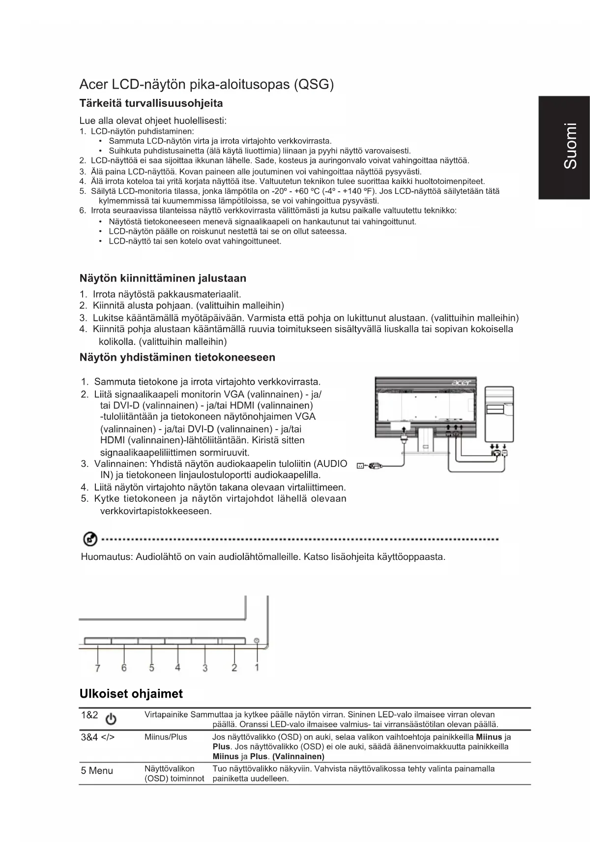 Sprog OSD Timeout Wide mode DDC / CI ACM Input Auto Source Hurtig start-tilstand Nulstil Information *Allespecikationerkanændresudenvarsel. FindvejledningerogandredokumentertilditAcer-produktpåAcersofciellesupport-websted. *Årligt energiforbrug er beregnet på baggrund af det typiske strømforbrug i 4 timer om dagen, 365 dage om året.Suomi Acer LCD-näytön pika-aloitusopas (QSG) Tärkeitä turvallisuusohjeita Lue alla olevat ohjeet huolellisesti: 1. LCD-näytön puhdistaminen:• Sammuta LCD-näytön virta ja irrota virtajohto verkkovirrasta.• Suihkuta puhdistusainetta (älä käytä liuottimia) liinaan ja pyyhi näyttö varovaisesti.2. LCD-näyttöä ei saa sijoittaa ikkunan lähelle. Sade, kosteus ja auringonvalo voivat vahingoittaa näyttöä.3. Älä paina LCD-näyttöä. Kovan paineen alle joutuminen voi vahingoittaa näyttöä pysyvästi.4. Älä irrota koteloa tai yritä korjata näyttöä itse. Valtuutetun teknikon tulee suorittaa kaikki huoltotoimenpiteet. 5. Säilytä LCD-monitoria tilassa, jonka lämpötila on -20º - +60 ºC (-4º - +140 ºF). Jos LCD-näyttöä säilytetään tätä kylmemmissä tai kuumemmissa lämpötiloissa, se voi vahingoittua pysyvästi.6. Irrota seuraavissa tilanteissa näyttö verkkovirrasta välittömästi ja kutsu paikalle valtuutettu teknikko:• Näytöstä tietokoneeseen menevä signaalikaapeli on hankautunut tai vahingoittunut. • LCD-näytön päälle on roiskunut nestettä tai se on ollut sateessa.• LCD-näyttö tai sen kotelo ovat vahingoittuneet. Näytön kiinnittäminen jalustaan