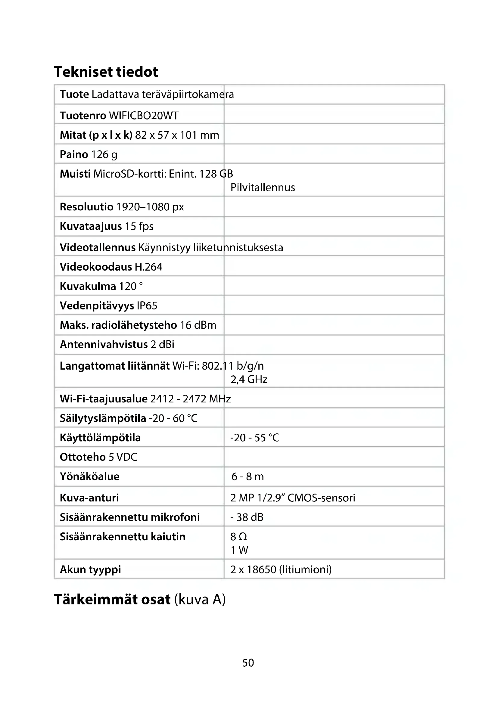 Pika-aloitusopas Ladattava teräväpiirtokamera WIFICBO20WT Katso tarkemmat tiedot käyttöoppaan laajemmasta verkkoversiosta: ned.is/wicbo20wt Käyttötarkoitus Tuote on tarkoitettu IP-turvakameraksi sisä- ja ulkokäyttöön. Tarkista turvakameroiden käyttöä koskevat paikalliset lait ja määräykset ennen käyttöä ja asennusta. Tuotetta ei ole tarkoitettu ammattikäyttöön. Tuotteen muutokset voivat vaikuttaa turvallisuuteen, takuuseen ja asianmukaiseen toimintaan.50 Tekniset tiedot Tuote Ladattava teräväpiirtokamera Tuotenro WIFICBO20WT Mitat (p x l x k) 82 x 57 x 101 mm Paino 126 g Muisti MicroSD-kortti: Enint. 128 GB Pilvitallennus Resoluutio 1920–1080 px Kuvataajuus 15 fps Videotallennus Käynnistyy liiketunnistuksesta Videokoodaus H.264 Kuvakulma 120 ° Vedenpitävyys IP65 Maks. radiolähetysteho 16 dBm Antennivahvistus 2 dBi Langattomat liitännät Wi-Fi: 802.11 b/g/n 2,4 GHz Wi-Fi-taajuusalue 2412 - 2472 MHz Säilytyslämpötila -20 - 60 °C Käyttölämpötila -20 - 55 °C Ottoteho 5 VDC Yönäköalue 6 - 8 m Kuva-anturi 2 MP 1/2.9” CMOS-sensori Sisäänrakennettu mikrofoni - 38 dB Sisäänrakennettu kaiutin 8 Ω 1 W Akun tyyppi 2 x 18650 (litiumioni) Tärkeimmät osat (kuva A)51 1 Kiinnitysteline 2 Lukituskytkin 3 Kameran objektiivi 4 Mikrofoni 5 Valoanturi 6 Tilan LED- merkkivalo 7 PIR-anturi 8 Mikro-USB-portti 9 Kaiutin q MicroSD- korttipaikka w Nollauspainike e Virtapainike r Paristolokero t Micro-USB-johto Turvallisuusohjeet