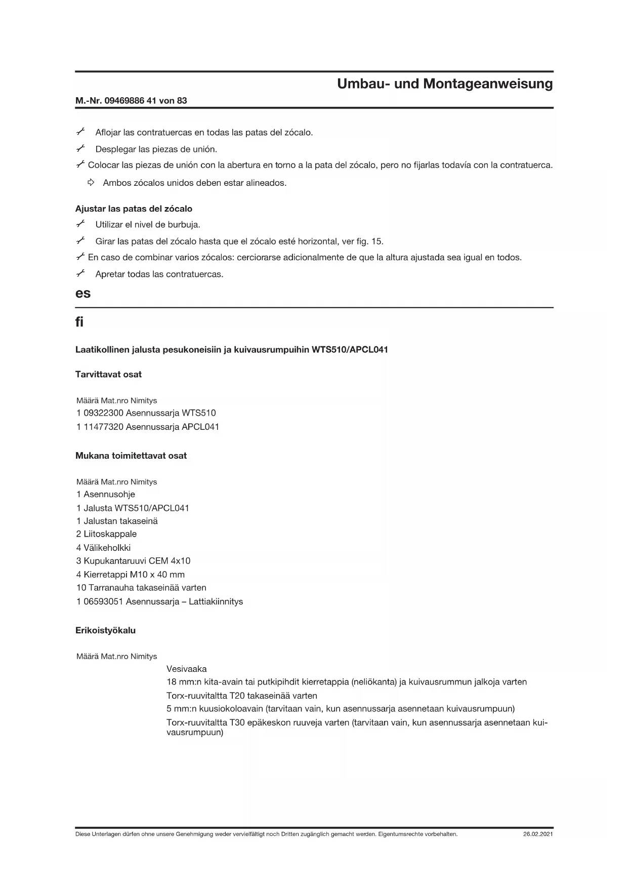 Laatikollinen jalusta pesukoneisiin ja kuivausrumpuihin WTS510/APCL041 Tarvittavat osat Määrä Mat.nro Nimitys 1 09322300 Asennussarja WTS510 1 11477320 Asennussarja APCL041 Mukana toimitettavat osat Määrä Mat.nro Nimitys 1 Asennusohje 1 Jalusta WTS510/APCL041 1 Jalustan takaseinä 2 Liitoskappale 4 Välikeholkki 3 Kupukantaruuvi CEM 4x10 4 Kierretappi M10x40mm 10 Tarranauha takaseinää varten 1 06593051 Asennussarja – Lattiakiinnitys Erikoistyökalu Määrä Mat.nro Nimitys Vesivaaka 18mm:n kita-avain tai putkipihdit kierretappia (neliökanta) ja kuivausrummun jalkoja varten Torx-ruuvitaltta T20 takaseinää varten 5mm:n kuusiokoloavain (tarvitaan vain, kun asennussarja asennetaan kuivausrumpuun) Torx-ruuvitaltta T30 epäkeskon ruuveja varten (tarvitaan vain, kun asennussarja asennetaan kui- vausrumpuun)Umbau- und Montageanweisung M.-Nr. 09469886 42 von 83 Diese Unterlagen dürfen ohne unsere Genehmigung weder vervielfältigt noch Dritten zugänglich gemacht werden. Eigentumsrechte vorbehalten. 26.02.2021 Tapaturman vaara asennustöiden yhteydessä VAARA Sähköiskuvaara. Sähköä johtavien osien aiheuttama vaara. A Kone on irrotettava sähköverkosta aina ennen huolto- ja asennustöiden aloittamista. VAARA Tapaturman vaara A Asenna jalusta vain sellaisiin pesukoneisiin ja kuivausrumpuihin, joita ei ole vielä asennettu paikalleen. Tarkista koneiden asennuksen purkamisohjeet niiden omista käyttöohjeista. A Varmista, ettei työskentelypaikan läheisyydessä oleskele asennustöiden aikana lapsia tai eläimiä. A Huolehdi siitä, etteivät lapset mene laatikkoon. VAARA Puristuksiin jäämisen vaara A Käytä liukumattomia käsineitä ja turvajalkineita. A Varmista ehdottomasti, ettei kehosi osia, varsinkaan käsiä tai jalkoja jää puristuksiin asennettavien koneiden alle tai niiden väliin. VAARA Loukkaantumisen vaara, erityisesti selkärankavamman vaara, sillä kone täytyy kääntää kyljelleen asennusta varten. A Koneet ovat painavia. Älä yritä nostaa niitä yksin, jos voimasi eivät riitä siihen. Tarkista koneiden nettopaino niiden omista käyttöohjeista. Väärästä asennuksesta johtuva tapaturman vaara VAROITUS Kaatuvan koneen aiheuttama onnettomuusvaara. A Käytä tätä jalustaa vain Miele-koneiden kanssa. A Älä käytä tätä jalustaa kalusteisiin integroitavien koneiden tai pesutornien kanssa. A Ruuvaa pesukone aina kiinni jalustaan. A Jos asennat useita jalustoja rinnakkain, liitä ne toisiinsa liitoskappaleiden avulla. A Jos asennat koneen erillisenä, kiinnitä jalusta lattiaan mukana toimitetun asennussarjan M.-Nr. 06593051 avulla. A Kiinnitä vähintään kaksi jalustan jalkaa, joista vähintään yksi takajalka, lattiaan. Asennuksesta tulee tukevin, kun kiinnität lattiaan ristikkäiset jalat. Jalustan laatikossa säilytettävien vääränlaisten aineiden aiheuttama vaara VAARA A Älä säilytä syttyviä aineita jalustan laatikossa. HUOMAUTUS Puiset osat voivat turvota ja/tai vääntyä. A Älä säilytä laatikossa märkiä tai kosteita esineitä.Umbau- und Montageanweisung M.-Nr. 09469886 43 von 83 Diese Unterlagen dürfen ohne unsere Genehmigung weder vervielfältigt noch Dritten zugänglich gemacht werden. Eigentumsrechte vorbehalten. 26.02.2021 Jalustan asennus Laatikon irrotus jalustasta A Vedä laatikko vasteeseen asti ulos jalustasta, ks. kuva 2. A Paina pikalukitsimia ja ota samanaikaisesti laatikko pois nostamalla sitä ylöspäin, ks. kuva 3. Jalustan asennus kuivausrummun alle A Tyhjennä vedenkeruuastia. A Kierrä kuivausrummun jalat kokonaan sisään putkipihtien avulla. A Kierrä kierretapit ulos jalustasta 5 mm kuusiokoloavaimella (A) ja hävitä ne, ks. kuva 4. A Kierrä asennussarjan mukana toimitetut 10 x 40 mm kierretapit vasteeseen asti kierrepultteihin (B), ks. kuva 4. VAROITUS Sormien puristuksiin jäämisen vaara kuivausrummun ulkovaipan ja kierretappien väliin. A Älä nosta kuivausrumpua nurkista. A Nosta kuivausrumpu jalustan päälle ja sovita kierretapit kuivausrummun jalkojen aukkoihin, ks. kuva 5. A Liimaa tiivistetarrat kuvan osoittamiin kohtiin takaseinän sisäpuolelle, ks. kuva 6. A Löysää kuivausrummun takaseinässä olevien epäkeskojen (1) ruuveja, ks. kuva 7. Epäkeskot voivat liikkua vähän, kun löysäät ruuveja. Varmista, että palautat epäkeskot lopuksi takaisin alkuperäseen asentoonsa: säppihammas alhaalla vasemmalla 20° kulmassa (1), ks. kuva 7. A Kiinnitä jalustan takaseinä alareunasta jalustaan 1 kupukantaruuvilla CEM 4x10 (2), ks. kuva 7. A Ripusta liitoskappaleet (3) epäkeskojen ruuveihin, ks. kuva 7. A Kiinnitä liitoskappaleet ja takaseinän yläreuna jalustaan 2 kupukantaruuvilla CEM 4x10 (1), ks. kuva 8. A Kiristä epäkeskojen (2) ruuvit, ks. kuva 8. A Suorista kone ja jalusta vesivaa'an avulla. A Kiristä jalustan jalat vastamuttereilla. A Kiinnitä jalusta lattiaan mukana toimitetun asennussarjan M.-Nr. 06593051 avulla. Jalustan asennus pesukoneen alle Kiinnitä liitoskappaleet jalustaan ennen asennusta. Liitoskappaleiden avulla voit yhdistää kaksi jalustaa toisiinsa. Kiinnitä liitoskappaleet jalustaan myös silloin, kun käytössä ei vielä ole toista jalustaa. Näin myöhemmät mahdolliset muutostyöt käyvät helpommin ja liitoskappaleet pysyvät varmassa tallessa. Kuivausrumpu vasemmalla ja pesukone oikealla: ks. kuva9. Pesukone vasemmalla ja kuivausrumpu oikealla: ks. kuva10. A Pidä kierretappeja paikallaan jalustassa putkipihtien avulla ja löysää jalustan kaikkia jalkoja. A Irrota 2 jalustan jalkaa vasemmalta tai oikealta sen mukaan, kummin päin koneet asennetaan, ks. kuva9 tai kuva10. A Aseta aluslaatta pohjalevyä vasten, ks. kuva 9 tai kuva 10. A Aseta liitoskappale (1) aluslaattaa vasten, ks. kuva9 tai kuva10. A Kierrä äsken irrottamasi jalustan 2 jalkaa paikalleen, mutta älä kiristä vastamuttereita vielä.Umbau- und Montageanweisung M.-Nr. 09469886 44 von 83 Diese Unterlagen dürfen ohne unsere Genehmigung weder vervielfältigt noch Dritten zugänglich gemach