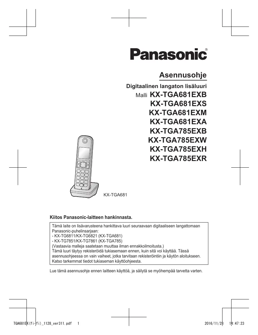 2016/11/28 14:38:19 Asennusohje Digitaalinen langaton lisäluuri Malli KX-TGA681EXB KX-TGA681EXS KX-TGA681EXM KX-TGA681EXA KX-TGA785EXB KX-TGA785EXW KX-TGA785EXH KX-TGA785EXR KX-TGA681 Kiitos Panasonic-laitteen hankinnasta. Tämä laite on lisävarusteena hankittava luuri seuraavaan digitaaliseen langattomaan Panasonic-puhelinsarjaan: - KX-TG6811/KX-TG6821 (KX-TGA681) - KX-TG7851/KX-TG7861 (KX-TGA785) (Vastaavia malleja saatetaan muuttaa ilman ennakkoilmoitusta.) Tämä luuri täytyy rekisteröidä tukiasemaan ennen, kuin sitä voi käyttää. Tässä asennusohjeessa on vain vaiheet, jotka tarvitaan rekisteröintiin ja käytön aloitukseen. Katso tarkemmat tiedot tukiaseman käyttöohjeesta. Lue tämä asennusohje ennen laitteen käyttöä, ja säilytä se myöhempää tarvetta varten. TGA681EX(fi-fi)_1128_ver311.pdf