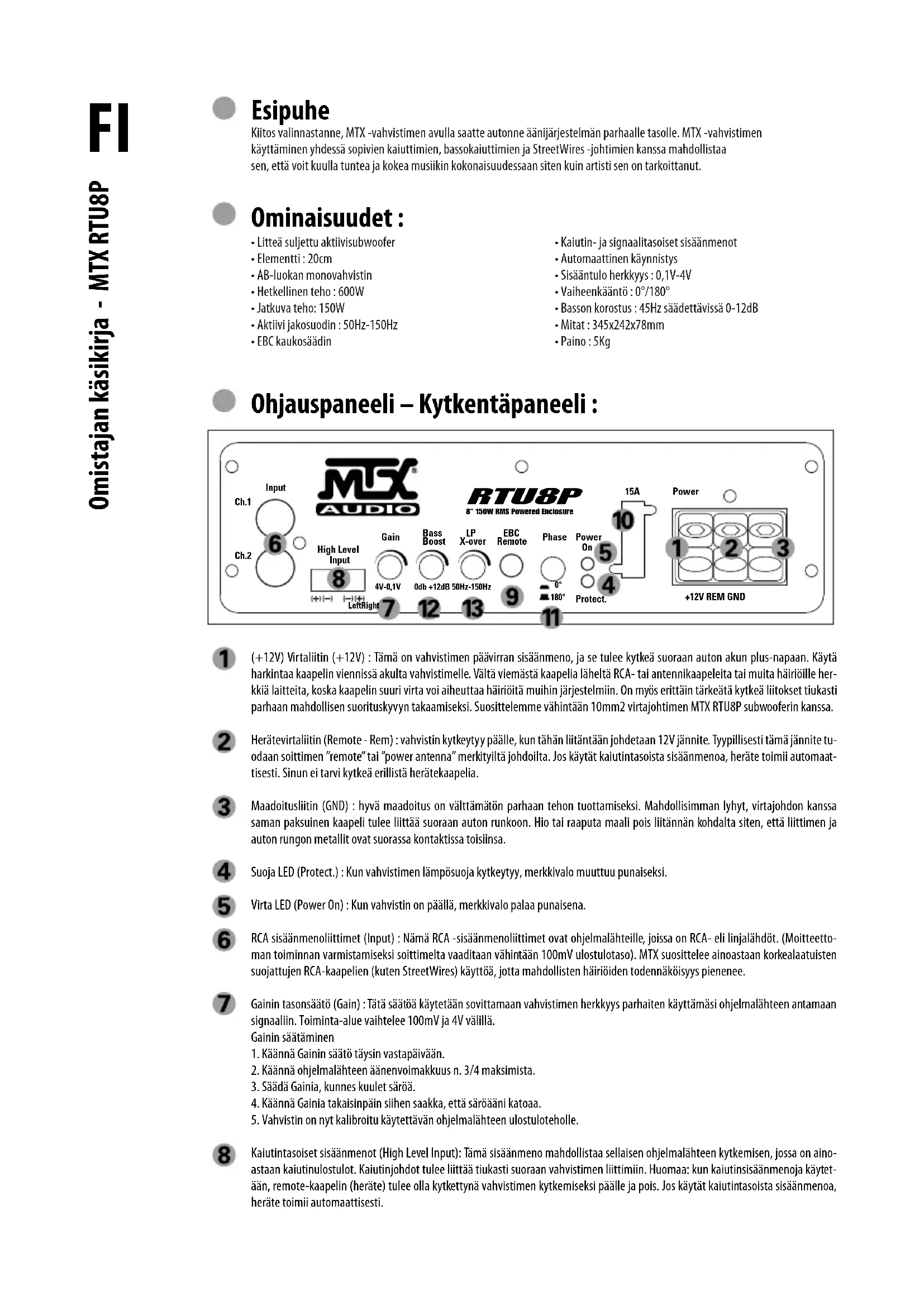 - Paino : 5Kg (+12V) Virtaliitin (+12V) : Tämä on vahvistimen päävirran sisäänmeno, ja se tulee kytkeä suoraan auton akun plus-napaan. Käytä harkintaa kaapelin viennissä akulta vahvistimelle. Vältä viemästä kaapelia läheltä RCA- tai antennikaapeleita tai muita häiriöille her- kkiä laitteita, koska kaapelin suuri virta voi aiheuttaa häiriöitä muihin järjestelmiin. On myös erittäin tärkeätä kytkeä liitokset tiukasti parhaan mahdollisen suorituskyvyn takaamiseksi. Suosittelemme vähintään 10mm2 virtajohtimen MTX RTU8P subwooferin kanssa. Herätevirtaliitin (Remote - Rem) : vahvistin kytkeytyy päälle, kun tähän liitäntään johdetaan 12V jännite. Tyypillisesti tämä jännite tu- odaan soittimen ”remote” tai ”power antenna” merkityiltä johdoilta. Jos käytät kaiutintasoista sisäänmenoa, heräte toimii automaat- tisesti. Sinun ei tarvi kytkeä erillistä herätekaapelia. Maadoitusliitin (GND) : hyvä maadoitus on välttämätön parhaan tehon tuottamiseksi. Mahdollisimman lyhyt, virtajohdon kanssa saman paksuinen kaapeli tulee liittää suoraan auton runkoon. Hio tai raaputa maali pois liitännän kohdalta siten, että liittimen ja auton rungon metallit ovat suorassa kontaktissa toisiinsa. Suoja LED (Protect.) : Kun vahvistimen lämpösuoja kytkeytyy, merkkivalo muuttuu punaiseksi. Virta LED (Power On) : Kun vahvistin on päällä, merkkivalo palaa punaisena. RCA sisäänmenoliittimet (Input) : Nämä RCA -sisäänmenoliittimet ovat ohjelmalähteille, joissa on RCA- eli linjalähdöt. (Moitteetto- man toiminnan varmistamiseksi soittimelta vaaditaan vähintään 100mV ulostulotaso). MTX suosittelee ainoastaan korkealaatuisten suojattujen RCA-kaapelien (kuten StreetWires) käyttöä, jotta mahdollisten häiriöiden todennäköisyys pienenee. Gainin tasonsäätö (Gain) : Tätä säätöä käytetään sovittamaan vahvistimen herkkyys parhaiten käyttämäsi ohjelmalähteen antamaan signaaliin. Toiminta-alue vaihtelee 100mV ja 4V välillä. Gainin säätäminen