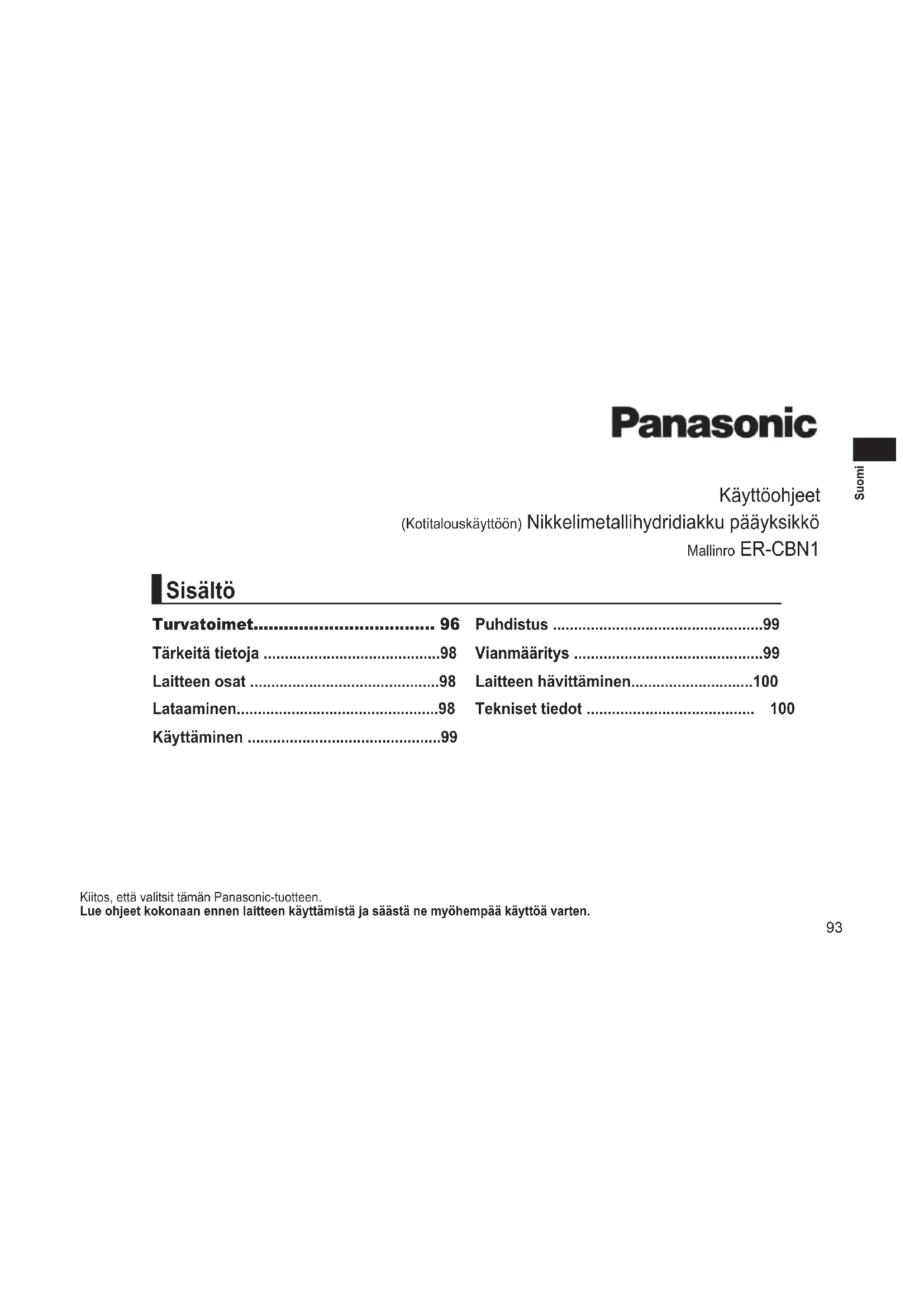 - Tuote on tarkoitettu vain kotitalouskäyttöön. Lisätietoa tuotteen energiatehokkuudesta saat verkkosivuiltamme osoitteessa www.panasonic.com ja syöttämällä hakukenttään mallinumeron. Vanhojen laitteiden ja paristojen hävittäminen Vain EU-jäsenmaillejakierrätysjärjestelmääkäyttävillemaille Tämä symboli tuotteissa, pakkauksessa ja/tai asiakirjoissa tarkoittaa, että käytettyjä sähköllä toimivia ja elektronisia tuotteita eikä paristoja ei saa laittaa yleisiin talousjätteisiin. Johda vanhat tuotteet ja käytetyt paristot käsittelyä, uusiointia tai kierrätystä varten vastaaviin keräyspisteisiin laissa annettujen määräysten mukaisesti. Hävittämällä tuotteet asiaankuuluvasti, autat samalla suojaamaan arvokkaita luonnonvaroja ja estämään mahdollisia negatiivisia vaikutuksia ihmiseen ja luontoon. Lisätietoa keräämisestä ja kierrätyksestä saa paikalliselta jätehuollosta vastuulliselta viranomaiselta. Maiden lainsäädännön mukaisesti tämän jätteen määräystenvastaisesta hävittämisestä voidaan antaa sakkorangaistuksia. Huomautusparistosymbolista(symbolialhaalla) Tämä symboli voidaan näyttää jonkin kemiallisen symbolin yhteydessä. Siinä tapauksessa se perustuu vastaaviin direktiiveihin, jotka on annettu kyseessä olevalle kemikaalille.101 Polski Instrukcja obsługi (Do użytku domowego) Moduł główny z baterią Ni-MH Nr modelu ER-CBN1 Dziękujemy za wybór produktu rmy Panasonic. Przedrozpoczęciemużytkowaniategourządzeniaprosimyoprzeczytaniecałejinstrukcjiizachowaniejejdowykorzystaniawprzyszłości. Środki ostrożności p. 105