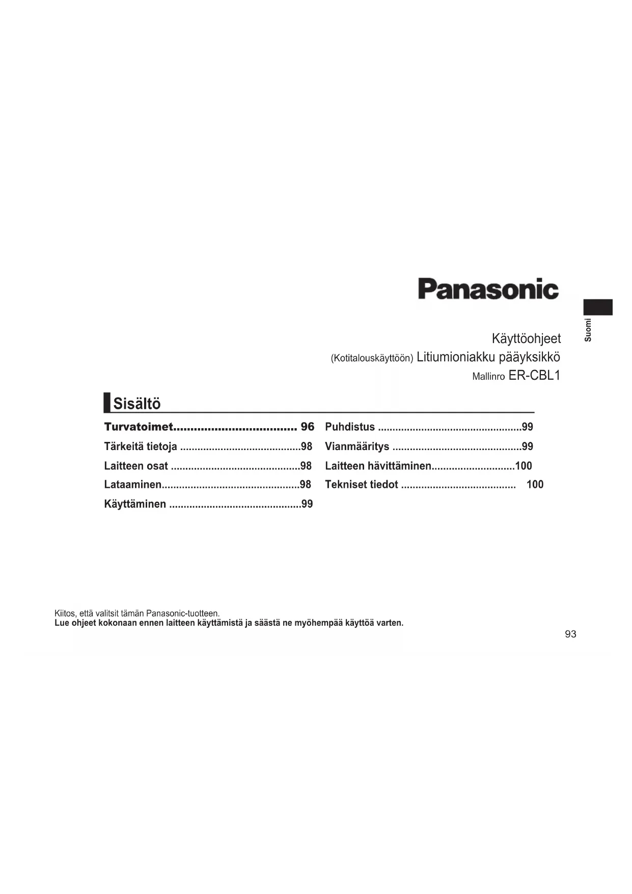 - Tuote on tarkoitettu vain kotitalouskäyttöön. Lisätietoa tuotteen energiatehokkuudesta saat verkkosivuiltamme osoitteessa www.panasonic.com ja syöttämällä hakukenttään mallinumeron. Vanhojen laitteiden ja paristojen hävittäminen Vain EU-jäsenmaillejakierrätysjärjestelmääkäyttävillemaille Tämä symboli tuotteissa, pakkauksessa ja/tai asiakirjoissa tarkoittaa, että käytettyjä sähköllä toimivia ja elektronisia tuotteita eikä paristoja ei saa laittaa yleisiin talousjätteisiin. Johda vanhat tuotteet ja käytetyt paristot käsittelyä, uusiointia tai kierrätystä varten vastaaviin keräyspisteisiin laissa annettujen määräysten mukaisesti. Hävittämällä tuotteet asiaankuuluvasti, autat samalla suojaamaan arvokkaita luonnonvaroja ja estämään mahdollisia negatiivisia vaikutuksia ihmiseen ja luontoon. Lisätietoa keräämisestä ja kierrätyksestä saa paikalliselta jätehuollosta vastuulliselta viranomaiselta. Maiden lainsäädännön mukaisesti tämän jätteen määräystenvastaisesta hävittämisestä voidaan antaa sakkorangaistuksia. Huomautusparistosymbolista(symbolialhaalla) Tämä symboli voidaan näyttää jonkin kemiallisen symbolin yhteydessä. Siinä tapauksessa se perustuu vastaaviin direktiiveihin, jotka on annettu kyseessä olevalle kemikaalille.101 Polski Instrukcja obsługi (Do użytku domowego) Moduł główny z baterią Li-Ion Nr modelu ER-CBL1 Dziękujemy za wybór produktu rmy Panasonic. Przedrozpoczęciemużytkowaniategourządzeniaprosimyoprzeczytaniecałejinstrukcjiizachowaniejejdowykorzystaniawprzyszłości. Środki ostrożności p. 105