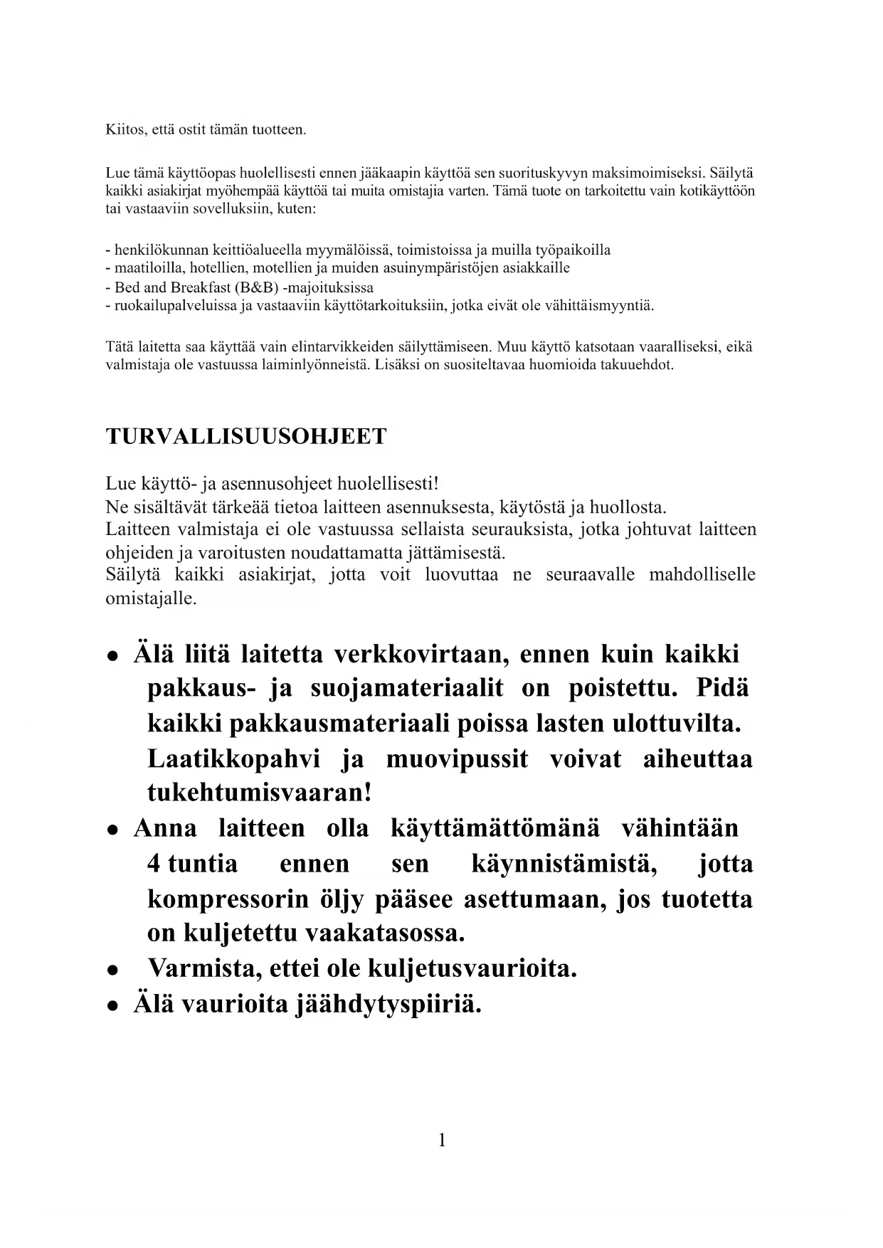 Kiitos, että ostit tämän tuotteen. Lue tämä käyttöopas huolellisesti ennen jääkaapin käyttöä sen suorituskyvyn maksimoimiseksi. Säilytä kaikki asiakirjat myöhempää käyttöä tai muita omistajia varten. Tämä tuote on tarkoitettu vain kotikäyttöön tai vastaaviin sovelluksiin, kuten: - henkilökunnan keittiöalueella myymälöissä, toimistoissa ja muilla työpaikoilla - maatiloilla, hotellien, motellien ja muiden asuinympäristöjen asiakkaille - Bed and Breakfast (B&B) -majoituksissa - ruokailupalveluissa ja vastaaviin käyttötarkoituksiin, jotka eivät ole vähittäismyyntiä. Tätä laitetta saa käyttää vain elintarvikkeiden säilyttämiseen. Muu käyttö katsotaan vaaralliseksi, eikä valmistaja ole vastuussa laiminlyönneistä. Lisäksi on suositeltavaa huomioida takuuehdot. TURVALLISUUSOHJEET Lue käyttö- ja asennusohjeet huolellisesti! Ne sisältävät tärkeää tietoa laitteen asennuksesta, käytöstä ja huollosta. Laitteen valmistaja ei ole vastuussa sellaista seurauksista, jotka johtuvat laitteen ohjeiden ja varoitusten noudattamatta jättämisestä. Säilytä kaikki asiakirjat, jotta voit luovuttaa ne seuraavalle mahdolliselle omistajalle. ● Älä liitä laitetta verkkovirtaan, ennen kuin kaikki pakkaus- ja suojamateriaalit on poistettu. Pidä kaikki pakkausmateriaali poissa lasten ulottuvilta. Laatikkopahvi ja muovipussit voivat aiheuttaa tukehtumisvaaran! ● Anna laitteen olla käyttämättömänä vähintään 4 tuntia ennen sen käynnistämistä, jotta kompressorin öljy pääsee asettumaan, jos tuotetta on kuljetettu vaakatasossa. ● Varmista, ettei ole kuljetusvaurioita. ● Älä vaurioita jäähdytyspiiriä.