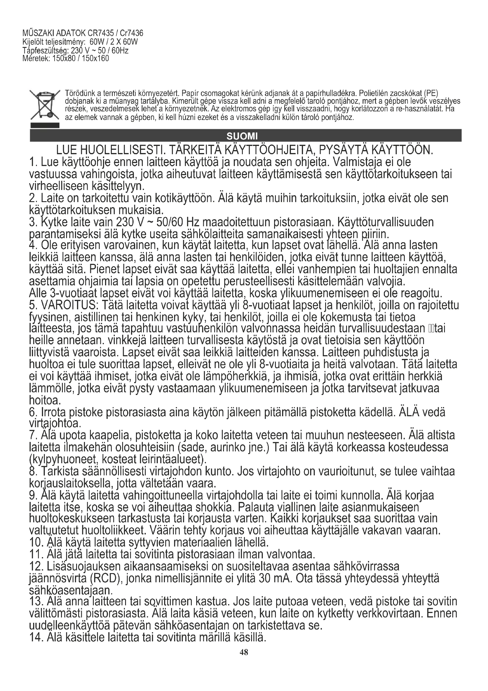 Alle 3-vuotiaat lapset eivat voi kayttaa laitetta, koska ylikuumenemiseen ei ole reagoitu. - VAROITUS: Tata laitetta voivat kayttä yli 8-vuotiaat lapset ja henkilö, joilla on rajoitettu fyysinen, aistillinen tai henkinen kyky, tai henkilö, joilla ei ole kokemusta tai tietoa laitteesta, jos tamä tapahtuu vastuuhenkilon valvonnassa heidān turvallisuudestaan tai heielle annetaan. vinkkejä laitteen turvallisesta kaytostä ja ovat tietoisia sen kaytöön liittyvista vaaroista. Lapset eivat saa leikkiä laitteiden kanssa. Laitteen puhdistusta ja huoltoa ei tule suorittaa lapset, elleivat ne ole yli 8-vuotiaita ja heita valvotaan. Tata laitetta ei voi kayttä ihmiset, jotka eivat ole lampöherkää, ja ihmisä, jotka ovat erittäin herkää lammolle, jotka eivat pysty vastaamaan ylikuumenemiseen ja jotka tarvitsevat jatkuvaa hoitoa.