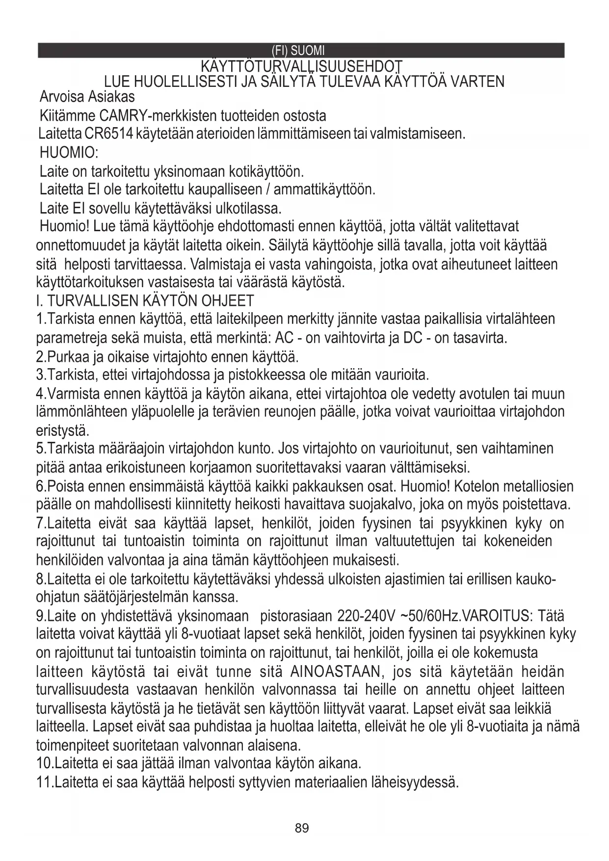LUE HUOLELLISESTI JA SÄILYTÄ TULEVAA KÄYTTÖÄ VARTEN Laitetta CR6514 käytetään aterioiden lämmittämiseen tai valmistamiseen. Laite on tarkoitettu yksinomaan kotikäyttöön. Huomio! Lue tämä käyttöohje ehdottomasti ennen käyttöä, jotta vältät valitettavat onnettomuudet ja käytät laitetta oikein. Säilytä käyttöohje sillä tavalla, jotta voit käyttää sitä helposti tarvittaessa. Valmistaja ei vasta vahingoista, jotka ovat aiheutuneet laitteen käyttötarkoituksen vastaisesta tai väärästä käytöstä. 1.Tarkista ennen käyttöä, että laitekilpeen merkitty jännite vastaa paikallisia virtalähteen parametreja sekä muista, että merkintä: AC - on vaihtovirta ja DC - on tasavirta. 2.Purkaa ja oikaise virtajohto ennen käyttöä. 3.Tarkista, ettei virtajohdossa ja pistokkeessa ole mitään vaurioita. 9.Laite on yhdistettävä yksinomaan pistorasiaan 220-240V ~50/60Hz.VAROITUS: Tätä laitetta voivat käyttää yli 8-vuotiaat lapset sekä henkilöt, joiden fyysinen tai psyykkinen kyky on rajoittunut tai tuntoaistin toiminta on rajoittunut, tai henkilöt, joilla ei ole kokemusta laitteen käytöstä tai eivät tunne sitä AINOASTAAN, jos sitä käytetään heidän turvallisuudesta vastaavan henkilön valvonnassa tai heille on annettu ohjeet laitteen turvallisesta käytöstä ja he tietävät sen käyttöön liittyvät vaarat. Lapset eivät saa leikkiä laitteella. Lapset eivät saa puhdistaa ja huoltaa laitetta, elleivät he ole yli 8-vuotiaita ja nämä toimenpiteet suoritetaan valvonnan alaisena. 6.Poista ennen ensimmäistä käyttöä kaikki pakkauksen osat. Huomio! Kotelon metalliosien päälle on mahdollisesti kiinnitetty heikosti havaittava suojakalvo, joka on myös poistettava. 10.Laitetta ei saa jättää ilman valvontaa käytön aikana. 11.Laitetta ei saa käyttää helposti syttyvien materiaalien läheisyydessä. 7.Laitetta eivät saa käyttää lapset, henkilöt, joiden fyysinen tai psyykkinen kyky on rajoittunut tai tuntoaistin toiminta on rajoittunut ilman valtuutettujen tai kokeneiden henkilöiden valvontaa ja aina tämän käyttöohjeen mukaisesti. Kiitämme CAMRY-merkkisten tuotteiden ostosta Laite EI sovellu käytettäväksi ulkotilassa. 4.Varmista ennen käyttöä ja käytön aikana, ettei virtajohtoa ole vedetty avotulen tai muun lämmönlähteen yläpuolelle ja terävien reunojen päälle, jotka voivat vaurioittaa virtajohdon eristystä. 5.Tarkista määräajoin virtajohdon kunto. Jos virtajohto on vaurioitunut, sen vaihtaminen pitää antaa erikoistuneen korjaamon suoritettavaksi vaaran välttämiseksi. 8.Laitetta ei ole tarkoitettu käytettäväksi yhdessä ulkoisten ajastimien tai erillisen kauko- ohjatun säätöjärjestelmän kanssa.