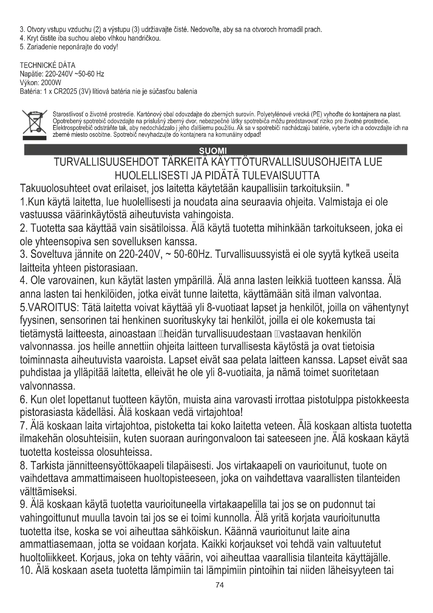- Lämmityspinnat voivat lammetä lampötilaan 60^ C tai korkeammaksi. Puhaltimen lammitin tulee olla paikassa, jossa lapsilla ja elaimillä ei ole paäsyä.