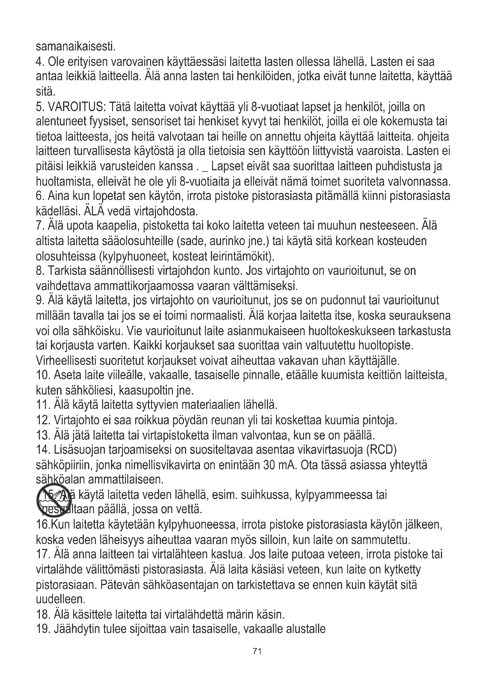 15. Älä käytä laitetta veden lähellä, esim. suihkussa, kylpyammeessa tai